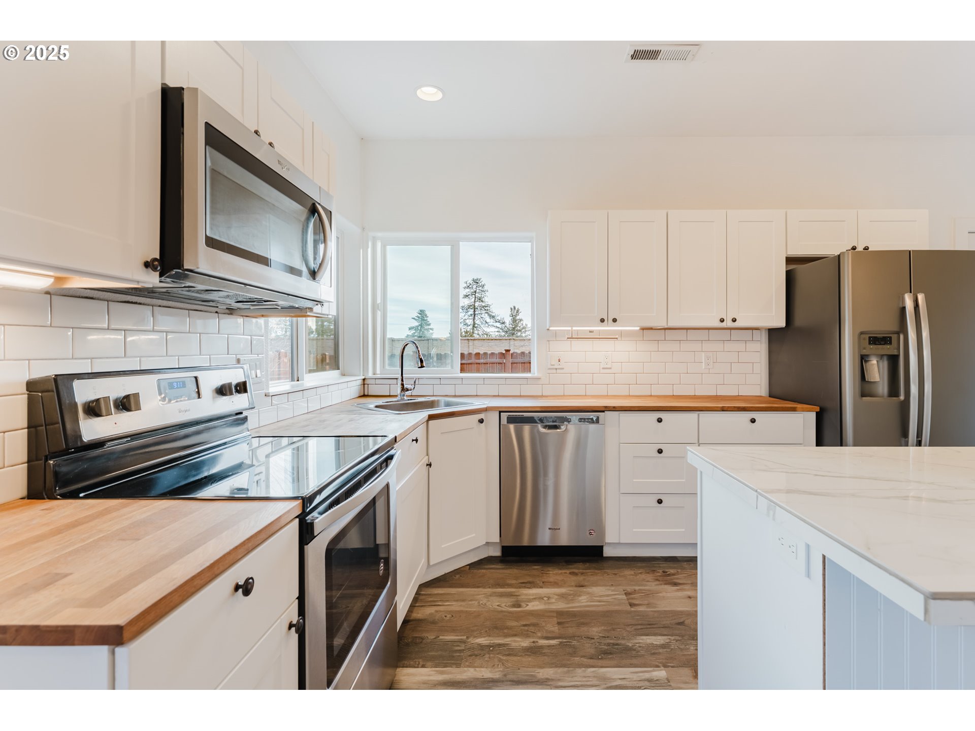 Open house Sat 2/21, Sun 2/22, 12-2 pm. Fresh interior paint! Home warranty included. Super private, cozy mountain-modern bungalow in sought-after SE Bend Larkspur neighborhood, featuring an open and inviting floor plan. This 3-bedroom, 2-bath home offers a spacious great room, 9’ ceilings throughout and a natural gas fireplace that seamlessly connects the living, dining, and kitchen areas. The kitchen features stylish butcher-block countertops, a large island with an eat-in bar, and stainless steel appliances. Luxury vinyl plank flooring adds warmth and durability throughout. Enjoy the fenced xeroscape landscaping for outdoor relaxation, entertaining, and catching the most fabulous sunrises along with a grand July 4th firework show from Pilot Butte! Oversized garage with tons of storage space. Conveniently located with uber convenient access to Alpenglow Park, downtown, and Mt Bachelor.