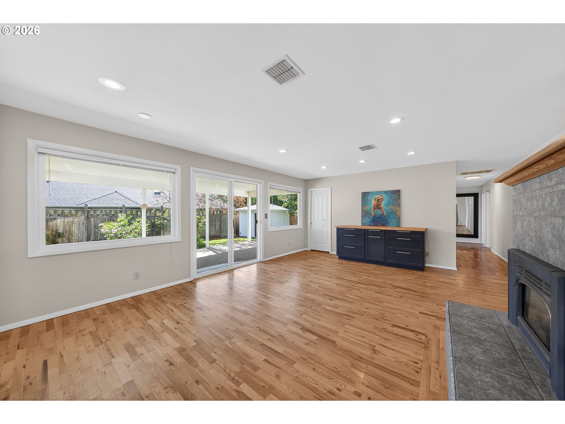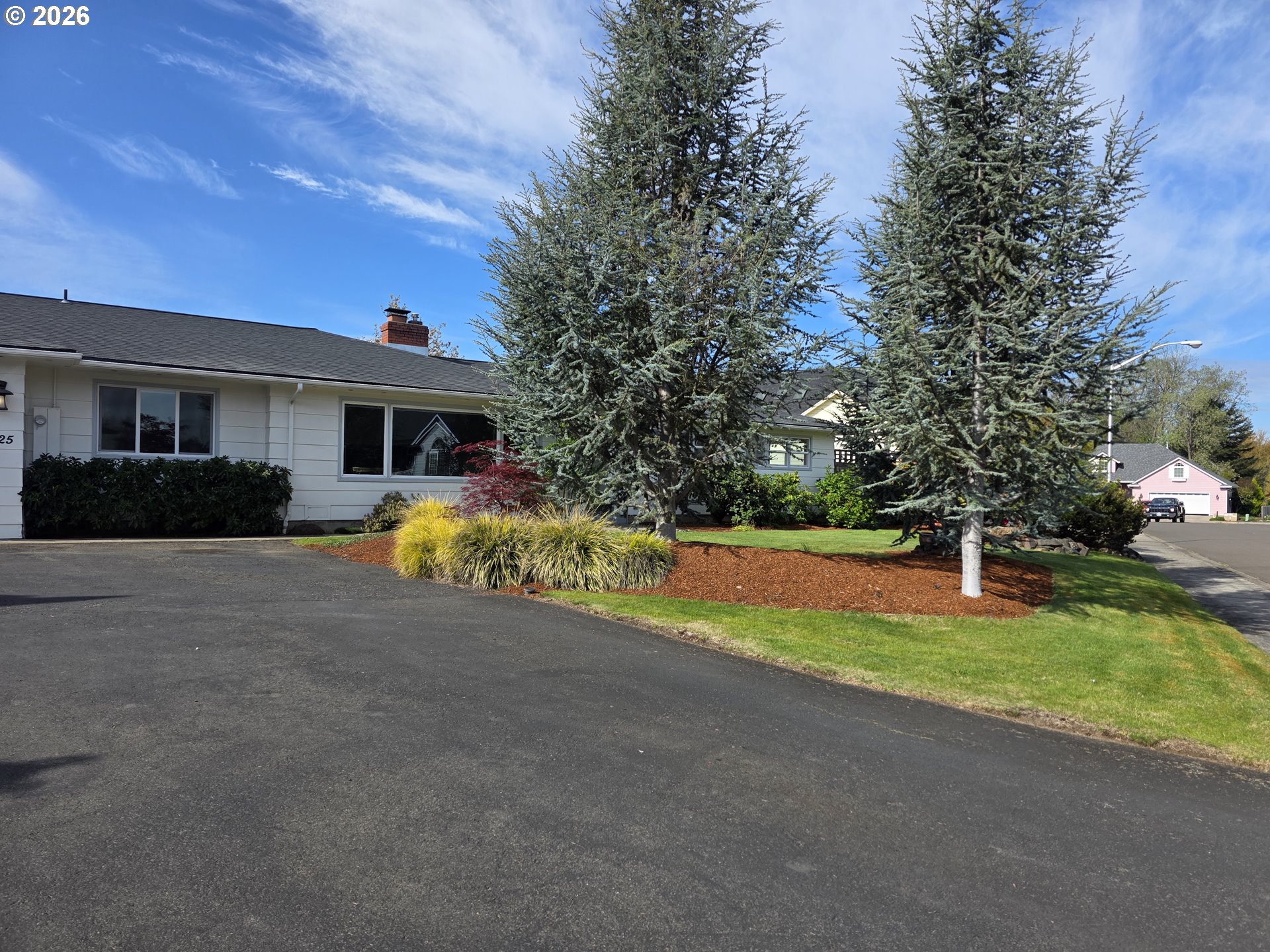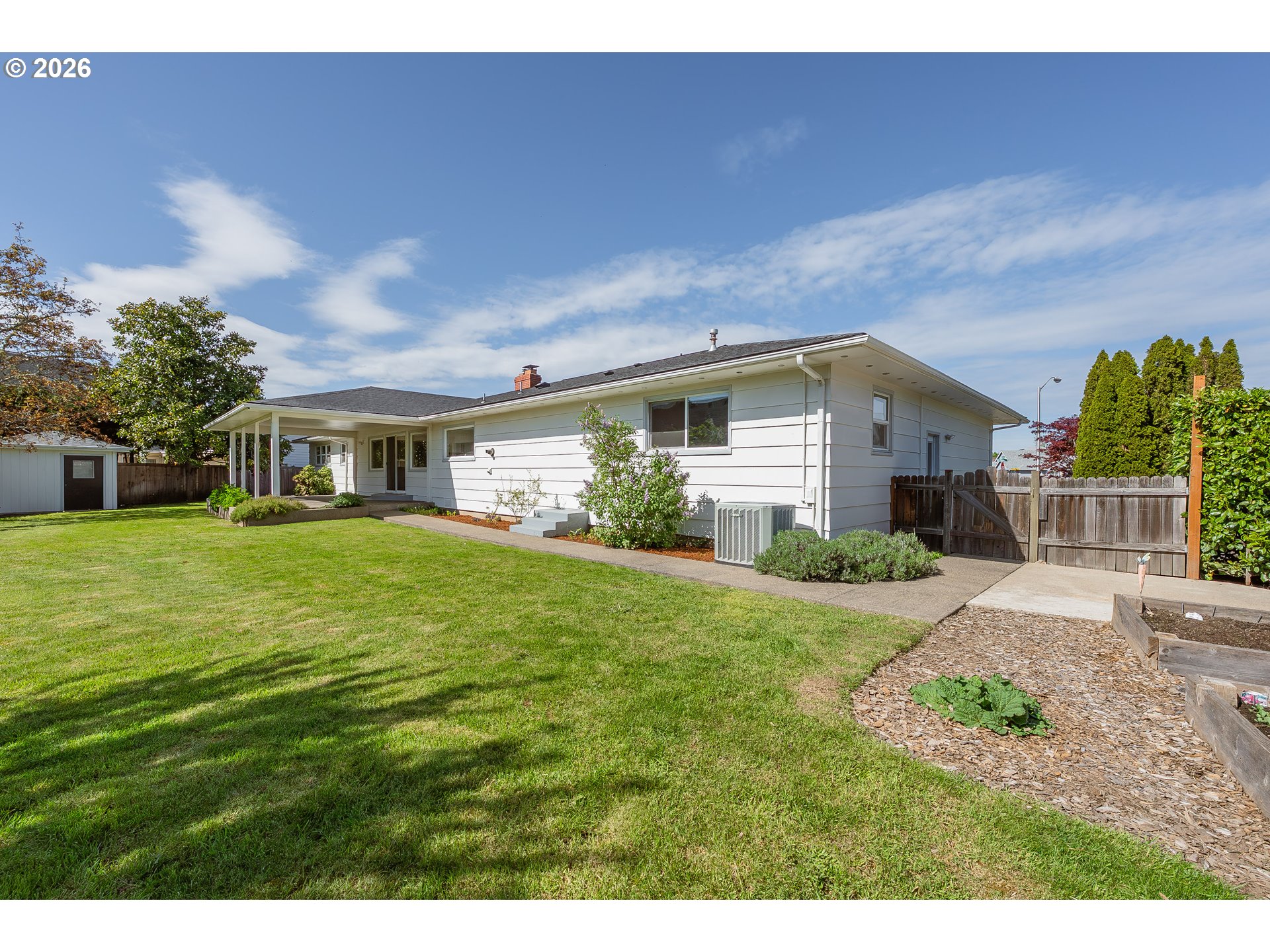 Beautiful Mid-century Modern one level home with 3 could be 4 bedrooms, 3 baths on corner lot .3 acre. Mostly hardwood floors, plus carpeting. Beautiful upgraded kitchen with newer appliances, gas range, granite counter tops, butlers pantry, Tankless hot water heater. Has double garage, fenced back yard, excellent landscaping, outbuilding for tools gardening area, well for irrigation watering. Oversized slider going out to covered patio. Spacious rooms, 2 fireplaces one with gas, one wood burning.
