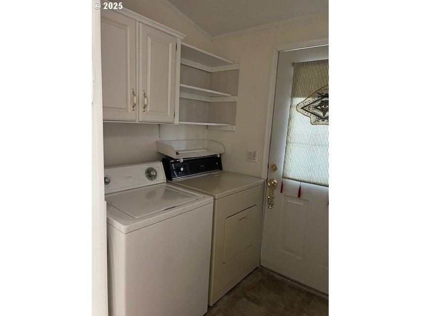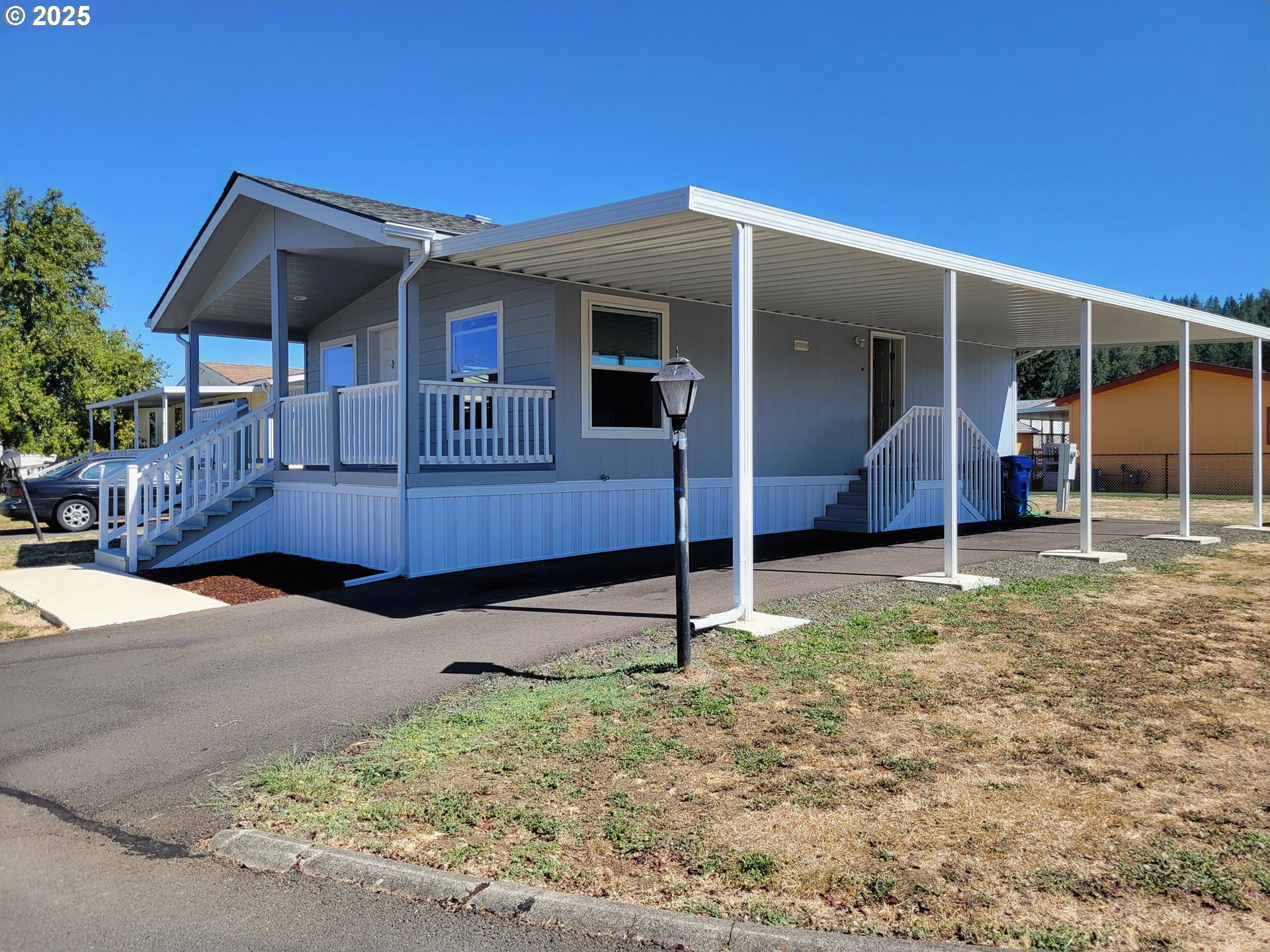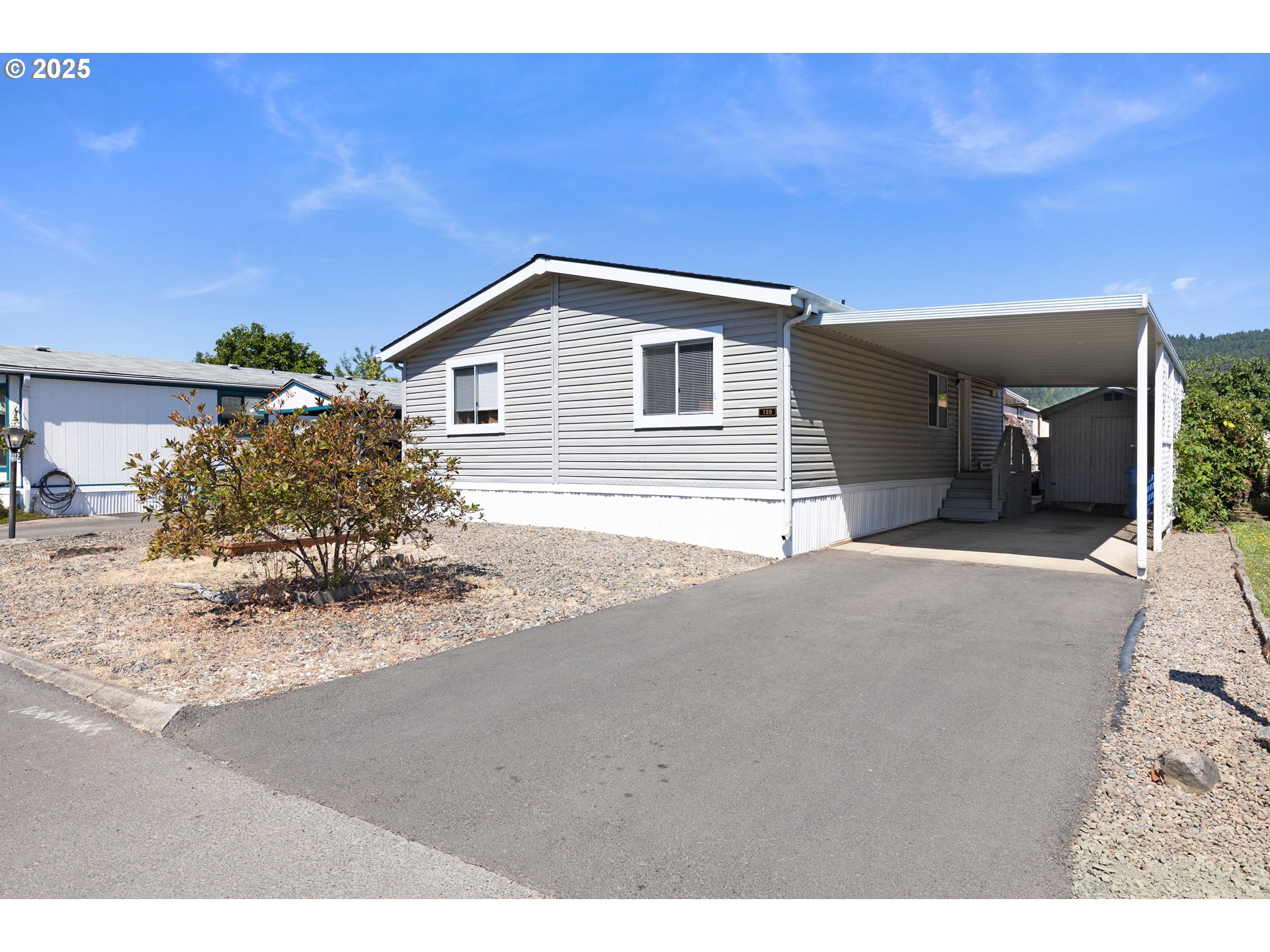 This charming two-bedroom, two-bathroom home is nestled at the back of a 55+ community park, providing a private feel. The open floor plan features a vaulted ceiling and large windows that allow for plenty of natural light. The primary bedroom offers ample closet space. The spacious living room is conveniently located close to the kitchen, dining room, bathroom, and guest room. The kitchen is equipped with all appliances, plenty ofcabinet space, and a convenient pass-through.Additionally, there is a carport for parking, guest parking available, and a storage shed. Residents can enjoy beautifully maintained common areas, a community center/clubhouse, and a pool. The park is conveniently located near the center of Sutherlin, which offers shopping, dining, medical facilities, and a walking/bike path. All furniture is negotiable. There are spots of dry rot on the exterior, seller will not be making repairs.
