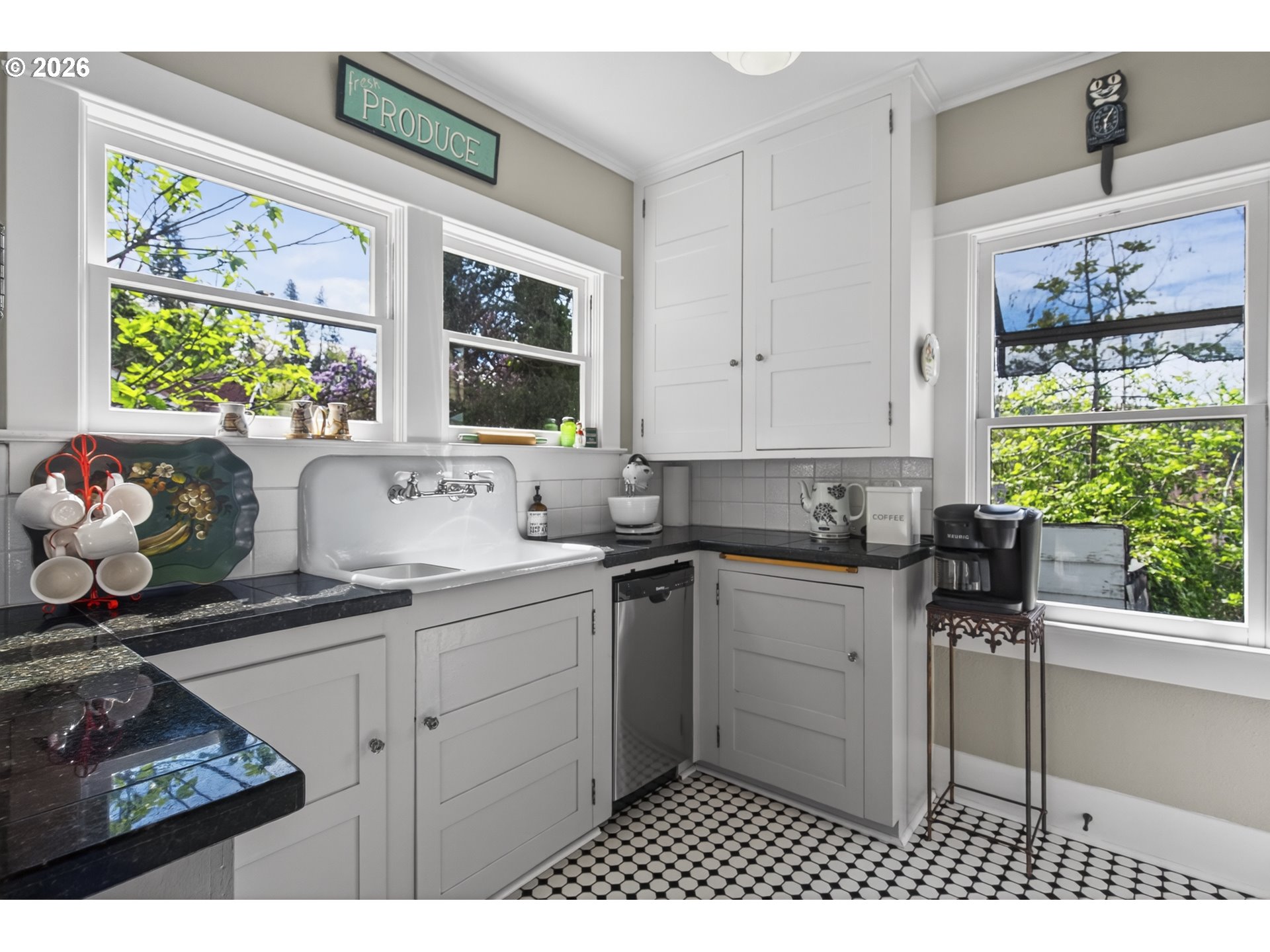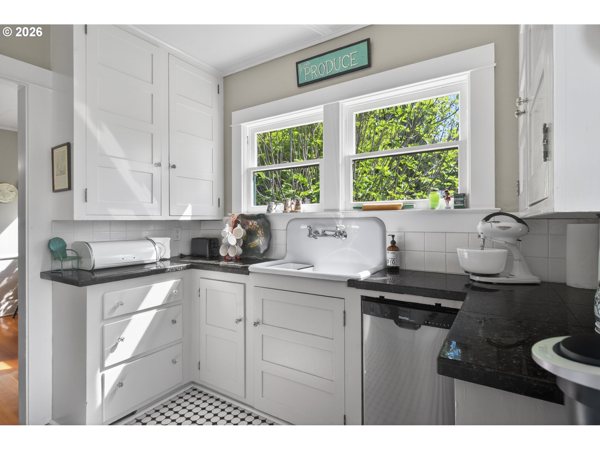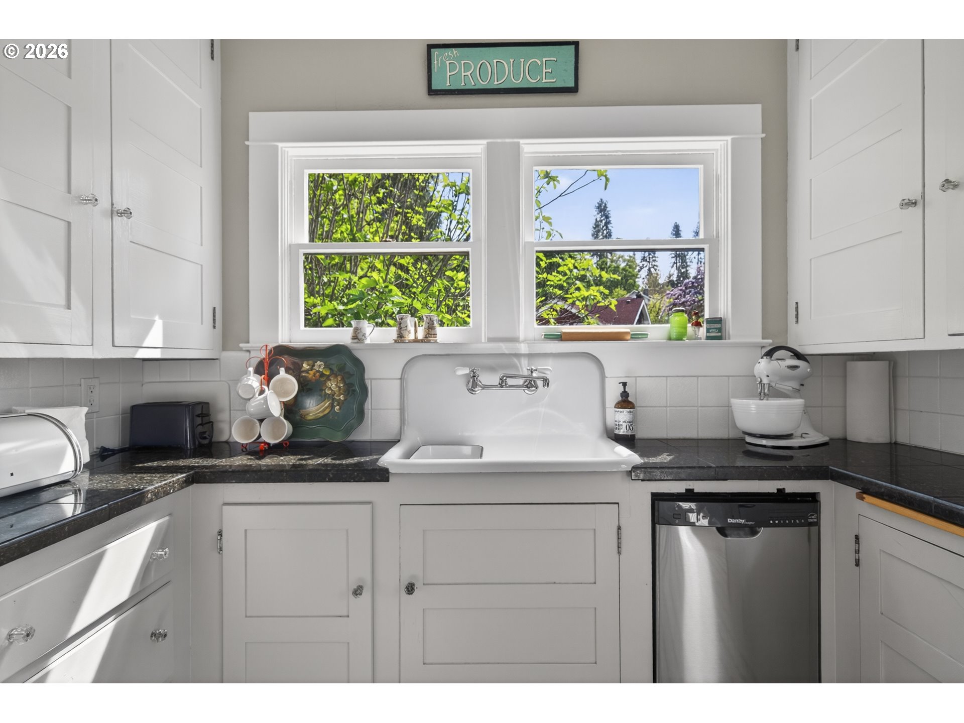 (503) 893-8874This charming English Tudor home is ideally located in downtown Roseburg. The residence features hardwood floors, a fireplace, and elegant French doors that enhance its classic character. The kitchen maintains its period style while offering thoughtful modern updates, including granite countertops, a dishwasher, and tile flooring. A Jack-and-Jill bathroom connects the two bedrooms, providing both convenience and functionality. The unfinished attic presents an excellent opportunity for expansion, with potential to add an additional bedroom and bathroom. The home also includes a full unfinished basement with laundry facilities and ample storage space.Parking and garage access are available from Lane Street. The property’s grounds evoke a cottage-style “secret garden,” offering numerous inviting and picturesque outdoor spaces. Currently, the home is operated as a vacation rental.