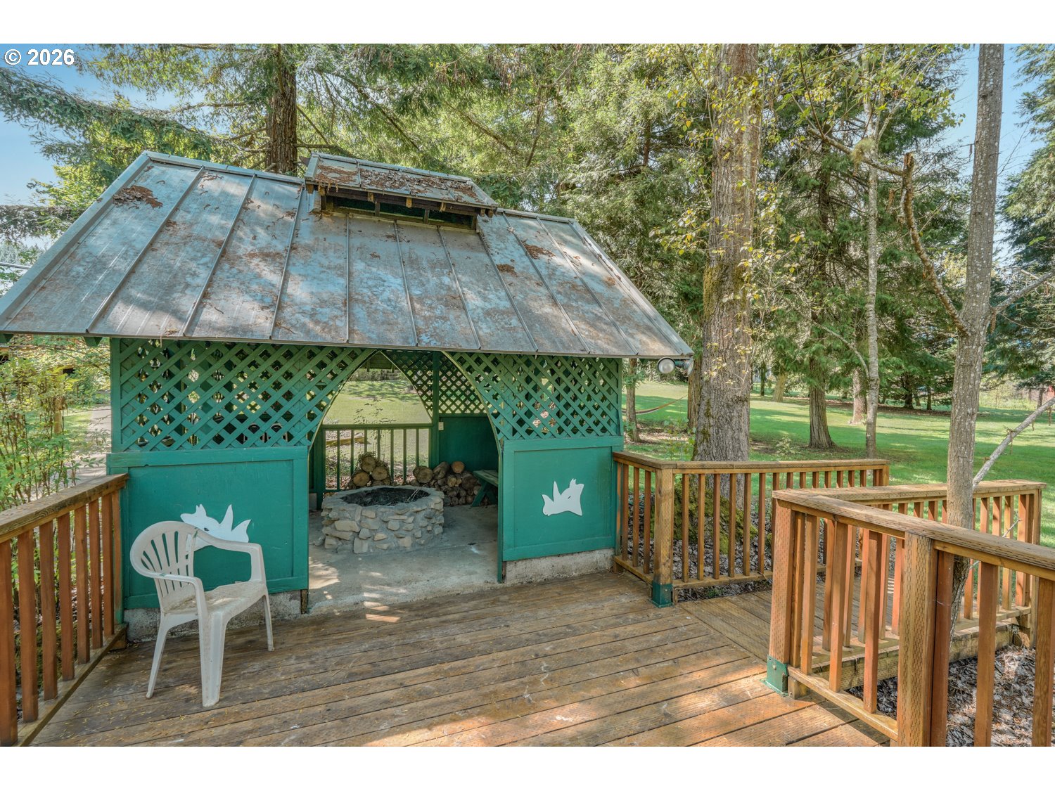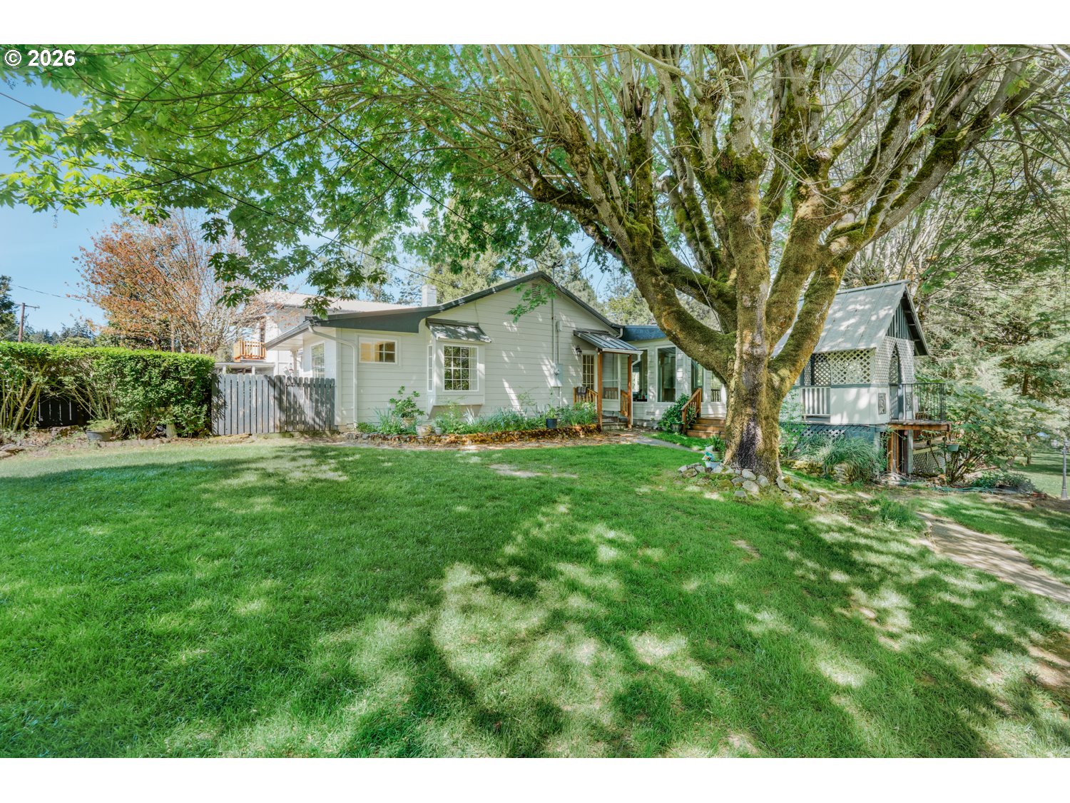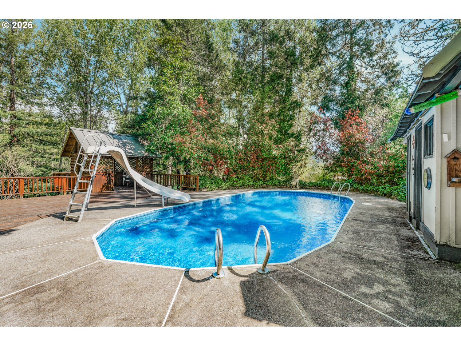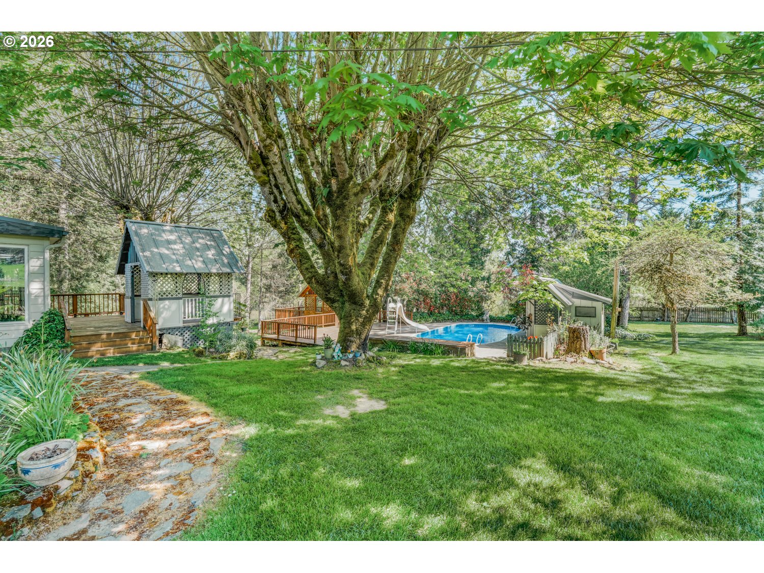Tucked away on 3.28 acres of lush, park-like grounds, this one-of-a-kind Oregon retreat offers more than a home, it delivers an experience. Surrounded by mature trees and natural beauty, the property lives like a private resort, designed for both peaceful living and unforgettable gatherings. From the moment you arrive, the setting feels worlds away. Meandering paths lead to a tranquil pond with its own gazebo and firepit, while multiple outdoor entertaining spaces create the perfect backdrop for events, celebrations, or quiet evenings under the stars. The resort-style pool with slide, expansive decking, and shaded gathering areas bring summer to life, while the open grounds and thoughtfully placed structures offer flexibility for hosting, relaxing, or bringing your vision to life. There is a well for irrigation and watering the garden, lawn with a new pump and pressure tank. Inside, the 2,400 sq ft home blends comfort and functionality. Natural light fills the sunroom, where walls of windows frame the surrounding landscape and open seamlessly to outdoor living spaces. Multiple living areas, wood-burning stoves, and a spacious primary suite with private deck access create an inviting atmosphere that feels both warm and expansive. The property continues to impress with a 2-car garage/shop, bonus space above, RV parking, and additional outbuildings that are ideal for storage, hobbies, or potential event use. The layout and natural separation of spaces make this property uniquely suited for a private retreat, multi-use living, or income opportunity. All just minutes from town, yet offering rare privacy and tranquility. This is more than a home, it’s a destination.