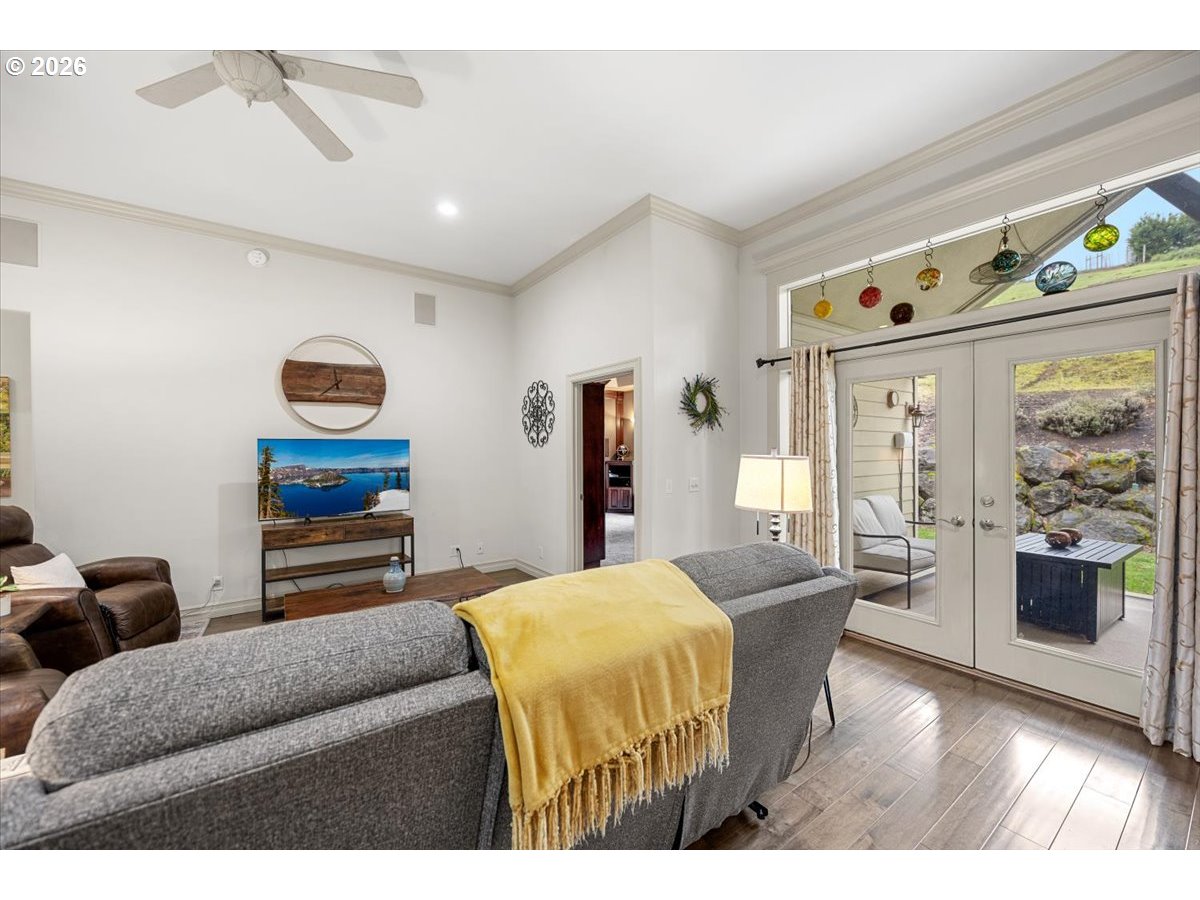 Fabulous contemporary 3 br/2 ba home in desirable Hucrest neighborhood. Split primary suite with sliding door to covered patio and luxurious en-suite bathroom with large walk-in closet, jetted tub and 2-person shower. Open kitchen with stainless steel appliances, granite countertops and breakfast nook. Home boasts high ceilings, crown molding, French doors from LR to covered patio, theatre room with surround sound, screen, projector and seating included. Sound system includes theatre room, great room, patio and primary suite. The flex room - music room/office is nice and bright with wainscoting and French doors. Dining room has nicely painted walls and a coffered ceiling giving it a decadent feel. The covered patio with a ceiling fan sets the stage for a quiet and peaceful oasis for enjoying your favorite beverage and watching the wildlife that visit. Several ceiling fans and lots of storage throughout the home. Large 3-car garage with substantial attic storage above. The hillside behind the house is owned by a neighbor to ensure nothing will be built on it.