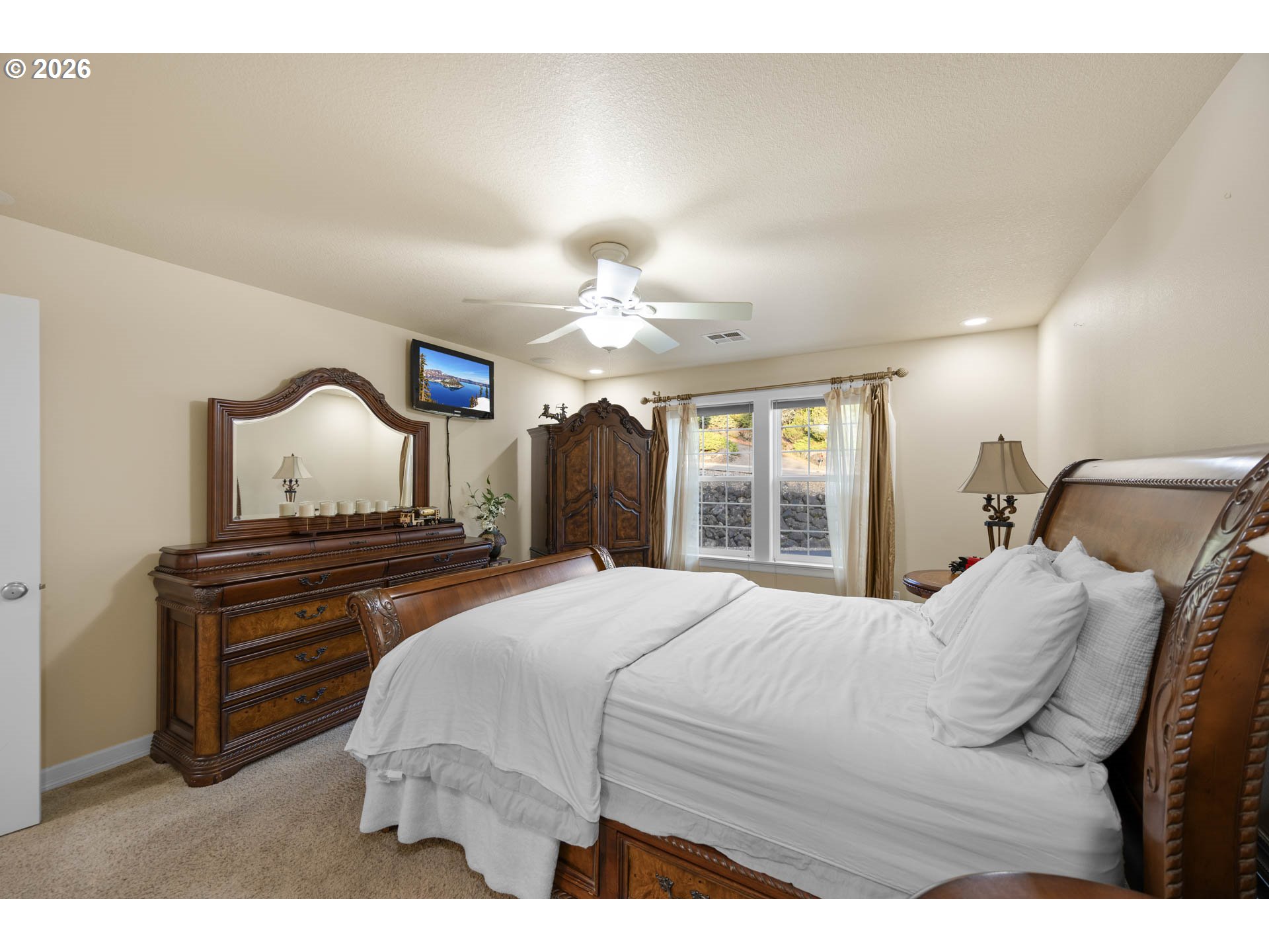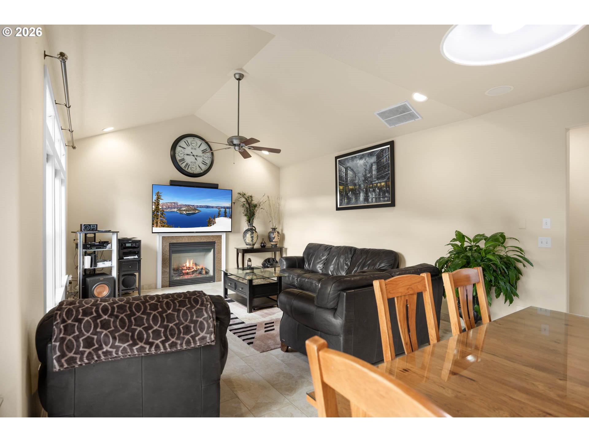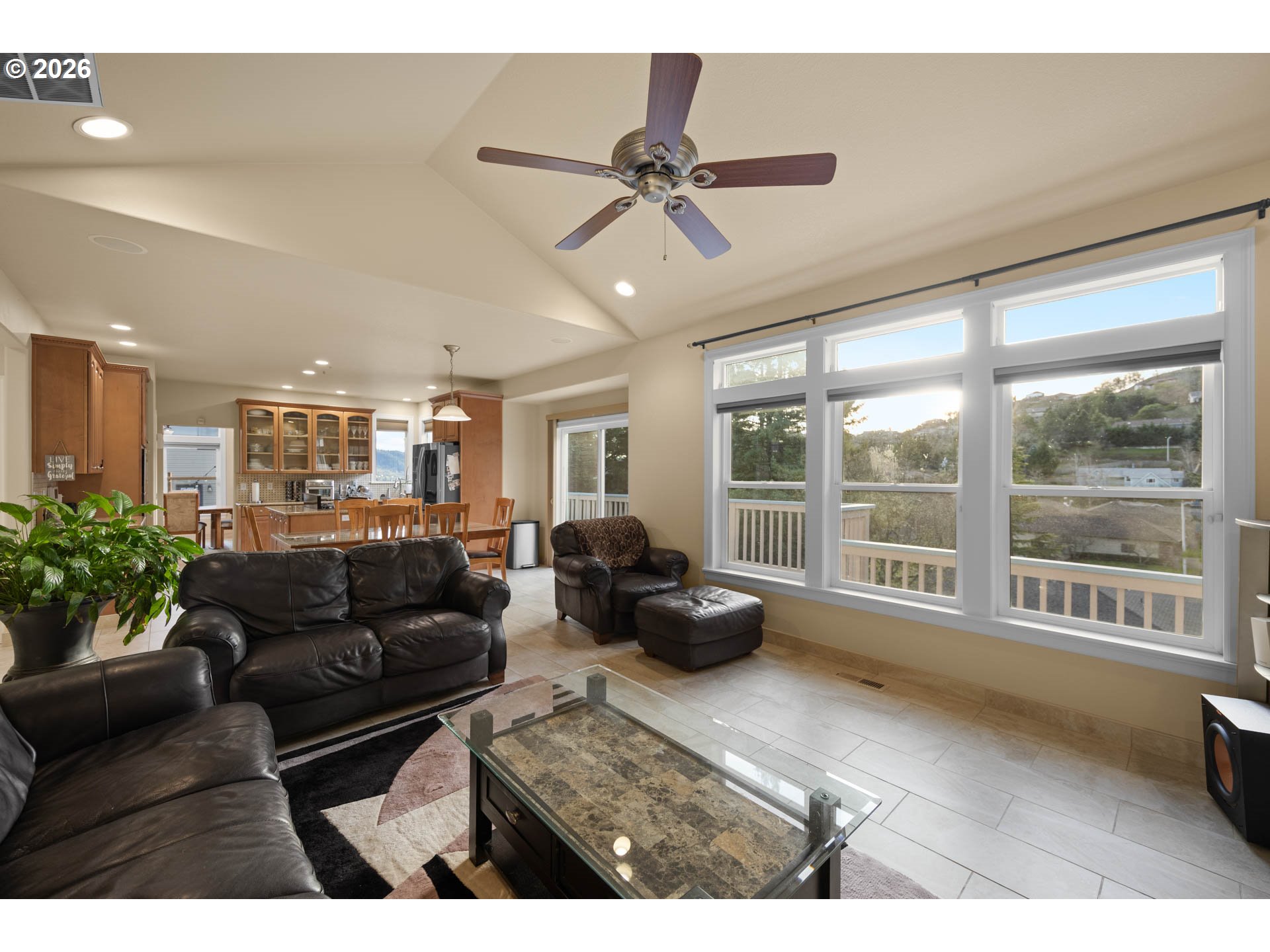 (503) 893-8874Set against a scenic hillside backdrop, this striking stucco & stone home offers architectural presence, natural light, & exceptional indoor-outdoor living. Iron fencing, manicured landscaping, arched details, & stately columns create a grand first impression. Step through double doors into a dramatic two-story foyer filled with light from the oversized arched window above. Tile flooring & iron staircase railings frame the open entry. Just off the foyer, a sitting room with fireplace & large windows provides a warm, inviting space for conversation.Continue into the main living room where expansive windows capture peaceful territorial views & mature greenery. A second fireplace anchors the space, creating a comfortable gathering area that flows seamlessly into the kitchen & dining area. The kitchen features granite countertops, a gas cooktop island, stainless steel appliances, custom cabinetry with glass uppers, & abundant prep space. Windows over the sink bring in natural light, & the dining area opens directly to the deck for effortless indoor-outdoor living. Upstairs, the Primary Suite captures hillside views through oversized corner windows. The ensuite bath offers dual granite vanities, jetted soaking tub beneath picture windows, & tiled walk-in shower with river rock flooring & built-in bench. A spacious walk-in closet completes the retreat. Additional bedrooms are generously sized & light-filled. Secondary bathrooms continue the home's cohesive granite & tile finishes. A main-level bedroom provides flexibility for guests or home office. The laundry room includes cabinetry, utility sink, & updated tile flooring. A convenient powder bath completes the level. Outdoor living shines with an elevated deck overlooking the terraced backyard, a covered deck area with private hot tub setting, & a lower stamped concrete patio with café lighting. The oversized 3-car garage includes a built-in prep area with cabinetry & sink, plus an installed Tesla charging station.