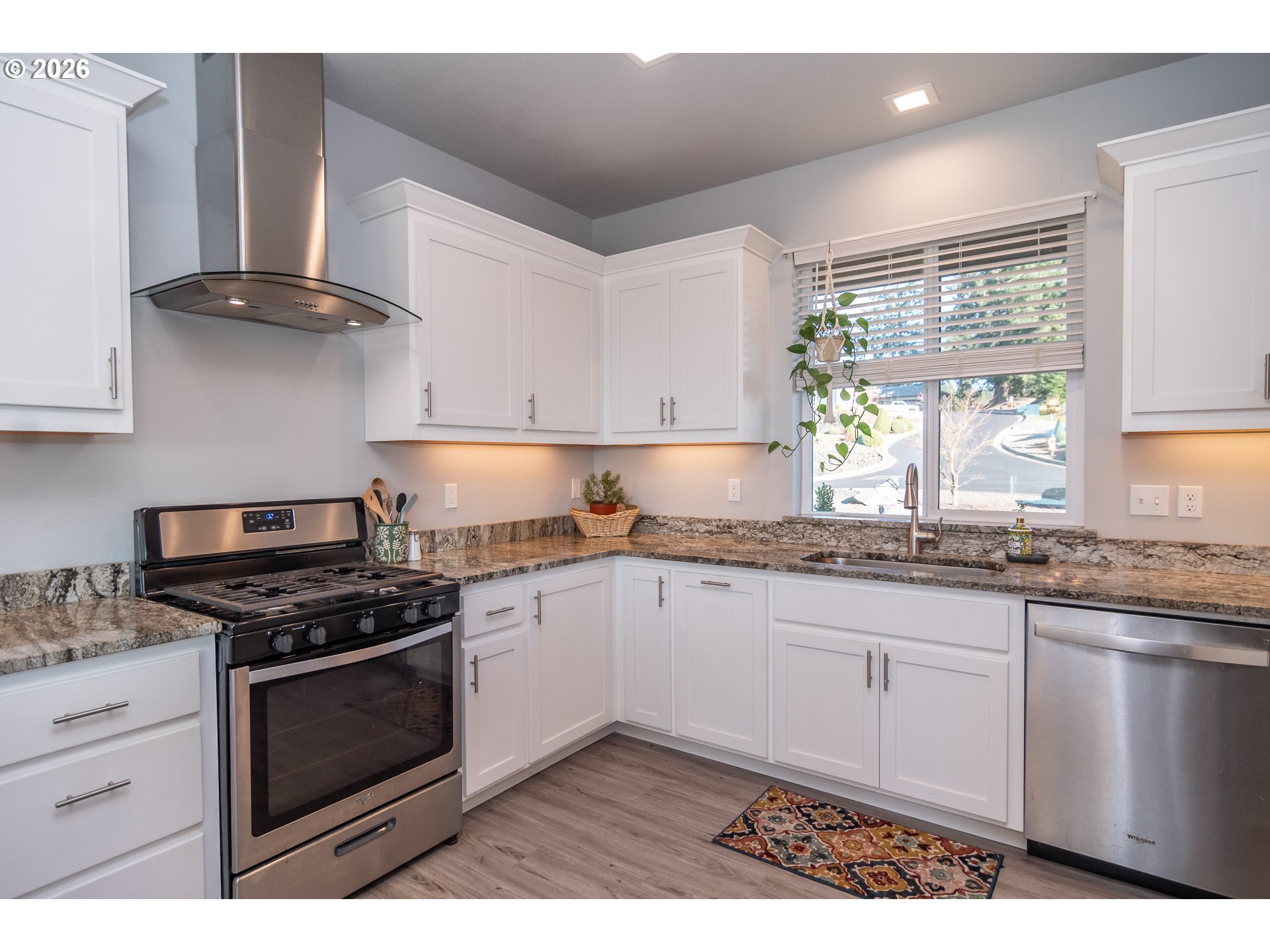 Experience gorgeous sunset views overlooking the 17th hole and tranquil ponds of Oak Hills Golf Course in Sutherlin in this stunning custom-built home located in the gated Fairway Estates community. Built in 2018, this beautifully designed 3-bedroom, 2-bath home features a half-step entry and thoughtful accessibility throughout. Enjoy an open-concept floor plan with high ceilings and luxury vinyl plank flooring. The spacious living room showcases floor-to-ceiling windows capturing breathtaking mountain and golf course views, plus a cozy gas fireplace for year-round comfort. The large kitchen is equipped with stainless steel appliances, a gas cooking stove, large eating bar, and gorgeous granite countertops in the kitchen, bathrooms, and laundry room. Refrigerator included. Step outside through the dining room sliding glass door to a covered deck—perfect for entertaining or relaxing while taking in the fairway and water features. Situated on a quiet cul-de-sac, this home also offers a fenced dog run area for your pets. Located in a secure, gated golf course community with scenic ponds and water features. For more information about the community, visit FairwayEstatesOregon.com