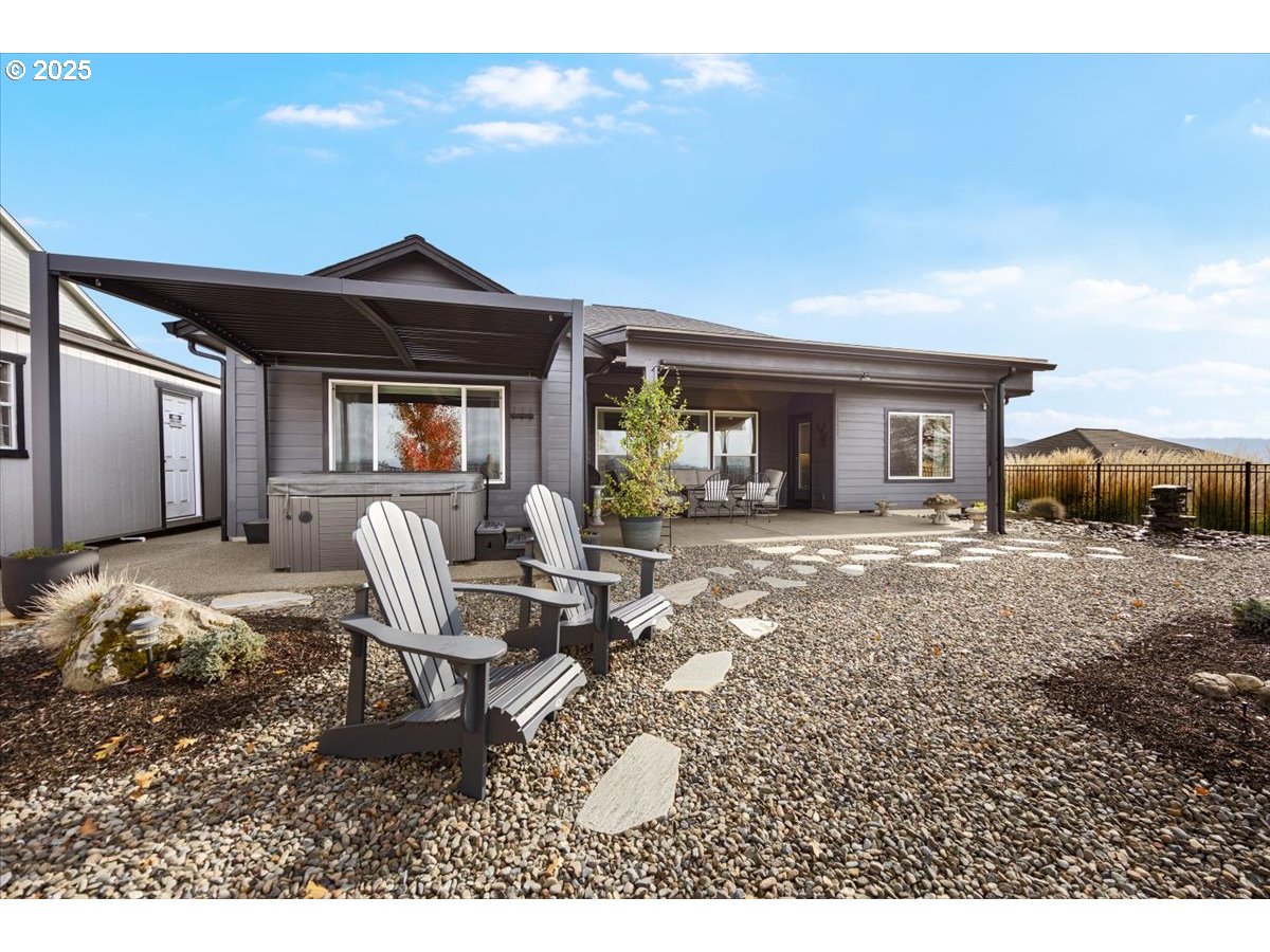 VA assumable loan under 4%!!! Exquisite one owner custom built home in Sutherlin's premier residential neighborhood. This home was built in 2022 and features upgrades throughout not common in neighboring homes. Situated on one of the premium western parcels with expansive views overlooking the valley and Fords Pond, the sunsets here are abundant year round. Offering 3 bedrooms, 2 bathrooms, spacious great room with floor-to-ceiling windows taking in the views, cozy gas fireplace with granite surround, engineered hardwood floors, 10 foot ceiling, and warm inviting kitchen. The kitchen is adorned with granite counters, high end cabinets, extensive lighting, stainless appliances, built in pantry, and island bar. The laundry room is very spacious with vast cabinet space, utility sink, luxurious tile floors, and granite counters. The master suite is fit for royalty with high ceilings, oversized walk-in-closet, dual sink vanity, custom tile shower, granite, and private commode room. The outdoor living space was specifically designed to create functionality, aesthetics, and efficiency keeping the home shaded from the hot summer sun. The extended covered patio with sun shades overlooks the rolling hills and water in the distance, capturing the year round sunsets from the comfort of your all weather entertaining area with private hot tub. This home offers a very unique aspect in a 75' long paved RV parking area large enough to accommodate most recreational vehicles. Plus there is an electric car charger in the garage. This is a no pet, zero wear and tear, better than new home. Designed with specific intent, with premium materials, on a premium view lot, this is the property you've been waiting to call home. Call for a private tour today.