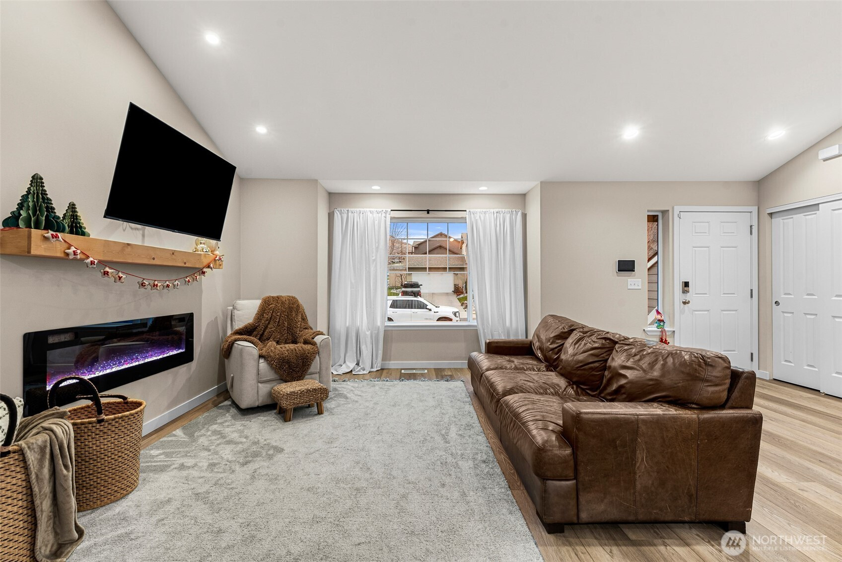 Stylishly updated tri-level on a desirable corner lot! The light-filled living room features new LVP flooring, a cozy fireplace, fresh paint, updated cabinetry, new appliances, quartz countertops, and new modern lighting. The dining area opens to a brand-new Trex view deck with stairs leading to the private backyard—perfect for entertaining. Upstairs offers three bedrooms and a full bath, including a primary suite with walk-in closet and private bath. The lower level showcases a spacious family room with a second fireplace and slider to the back patio, plus a convenient half bath and shared laundry. Recent exterior paint, new front and rear Trex decks, and a fully fenced backyard complete this move-in-ready home. New Roof!!