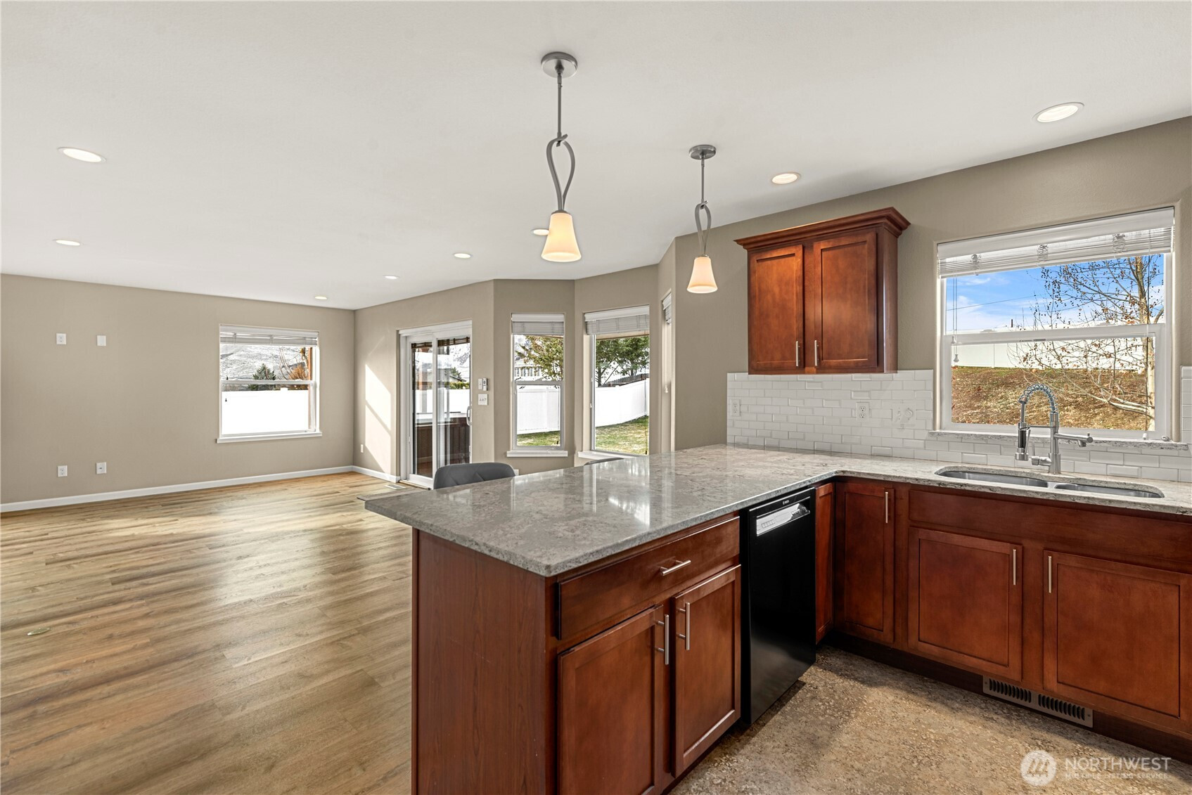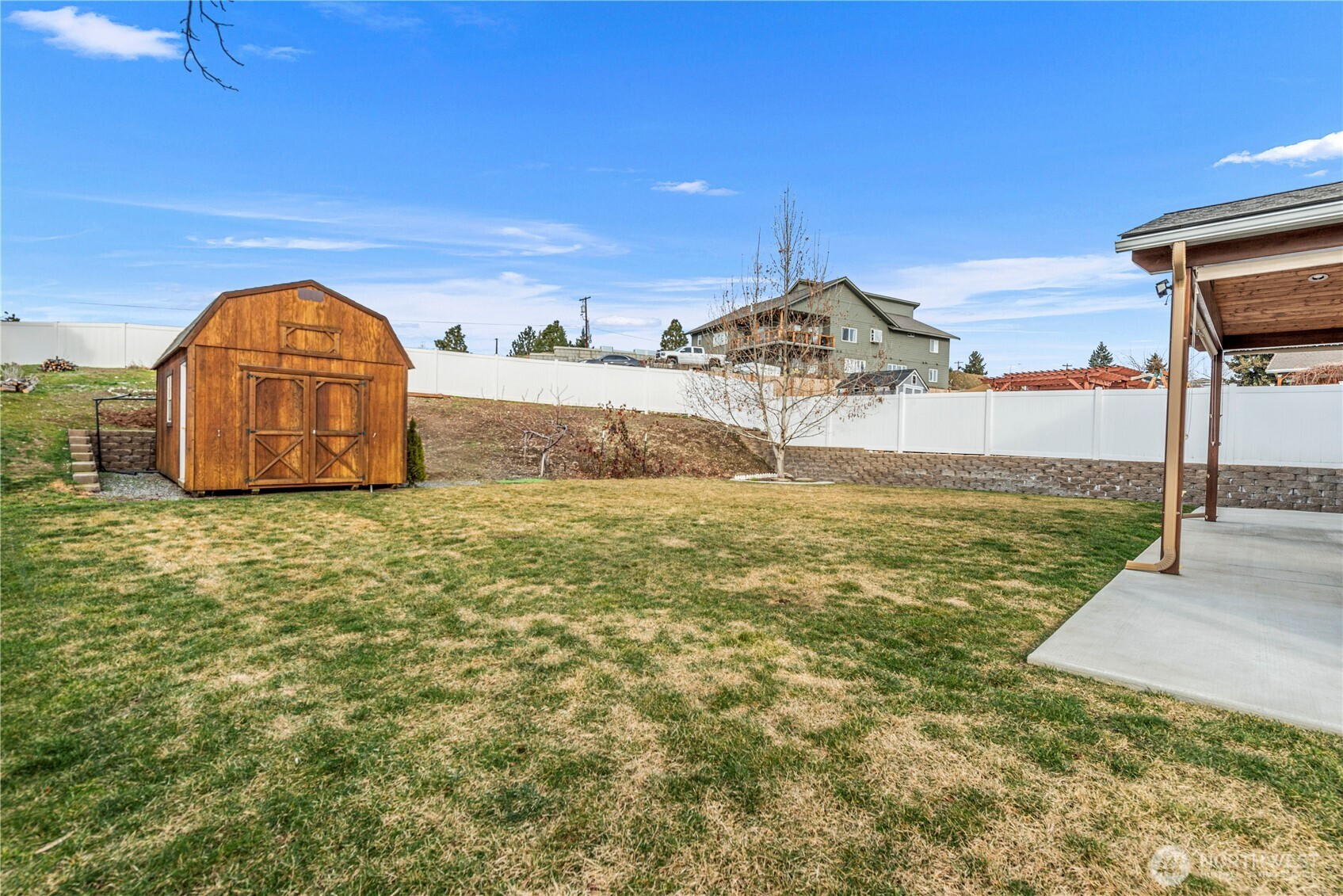 Tucked at the end of a quiet, private cul-de-sac in East Wenatchee, this two-story home offers the space and setting you’ve been waiting for. Inside, every room feels generously sized, creating a comfortable atmosphere throughout. The main level features durable and stylish LVP flooring, a large living room that flows seamlessly into the dining nook, and an open-concept kitchen. With granite countertops, tile backsplash, and abundant cabinetry, the kitchen blends style and function—perfect for everyday living or entertaining. Upstairs, you’ll find three spacious bedrooms, including an impressive primary suite designed to be your personal retreat. Wake up to beautiful mountain views, enjoy a large walk-in closet, and unwind in the en-suite bath featuring dual vanities and a soaking tub. A full guest bathroom is conveniently located upstairs, while a powder room on the main floor adds practicality for guests. Step outside to a backyard that truly delivers the wow factor. The cathedral-style covered patio with sun shades creates an inviting outdoor living space ideal for relaxing or hosting gatherings. The yard is fully fenced and includes irrigation water, plus a peach tree known for producing incredibly sweet, delicious fruit each season. A powered outbuilding offers space for a small shop or hobbies, and power is already available for a future hot tub. A two-car attached garage completes this East Wenatchee gem.