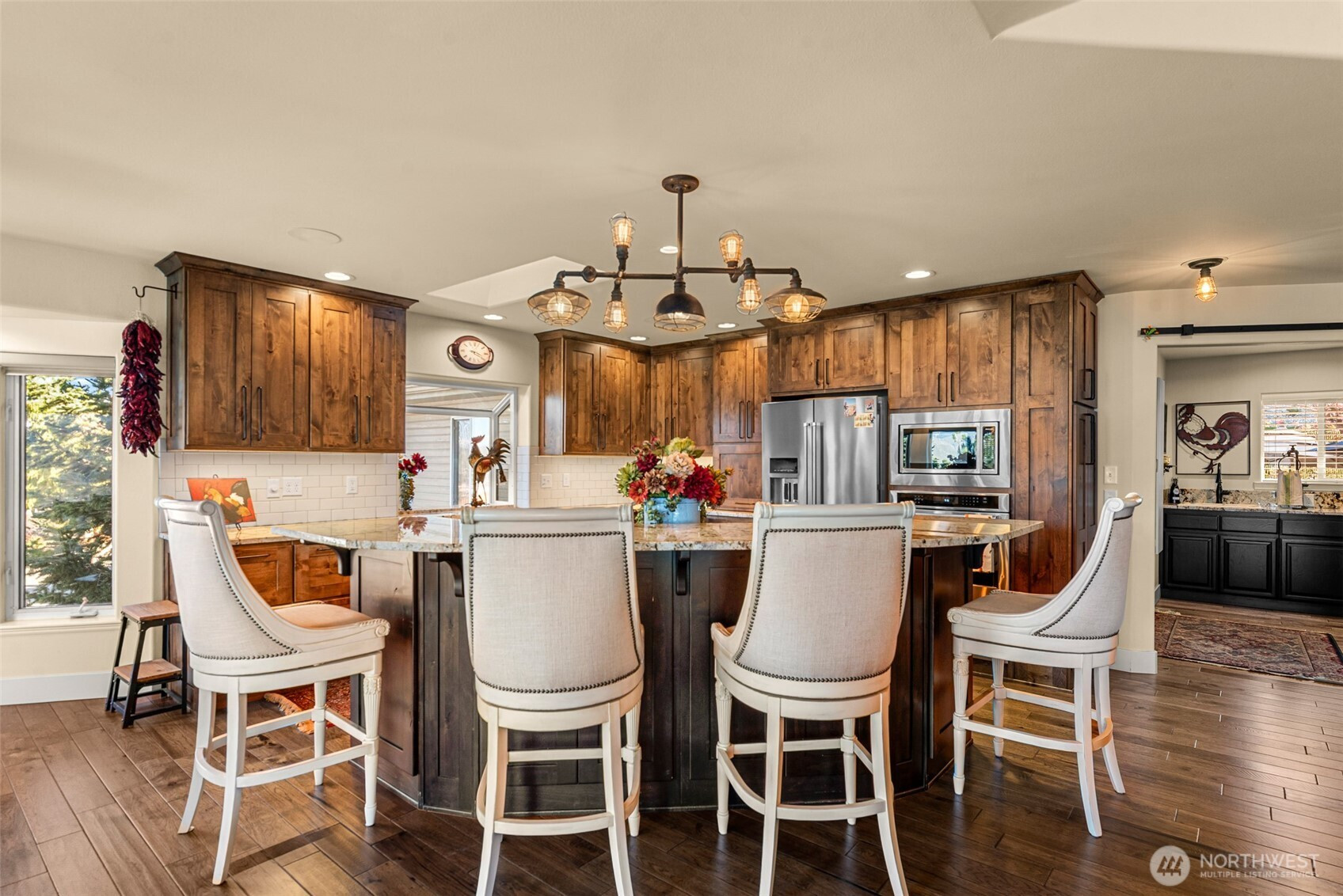 One of a kind daylight rambler located in the desirable Briarwood neighborhood, offering 3,680 sq ft of beautifully updated living space and breathtaking panoramic views of the Wenatchee Valley and Cascade Mountains. Ideally situated just minutes from the Wenatchee Golf & Country Club, this home combines convenience with a peaceful, private setting. The open concept main level is designed for both comfort and entertaining, featuring a spacious kitchen, living, and dining area filled with natural light. The kitchen showcases granite countertops, a gas cooktop, and custom Bagdon cabinetry, seamlessly flowing into the inviting living room with a cozy wood-burning fireplace. The generously sized primary suite provides a true retreat, complete with a luxurious ensuite bath, standalone soaking tub, and an expansive walk-in closet with convenient in-unit washer and dryer. The lower level expands the home’s versatility with two additional bedrooms, a full bath, a family room, and a private studio featuring its own kitchen, bathroom, and washer/dryer ideal for guests or multi-generational living. Step outside to your own private oasis with a boutique-style gunite pool/hot tub, and elegant water feature, surrounded by mature landscaping that enhances the home’s serene and secluded feel. Also enjoy a three car garage and additional driveway space for extra parking. This exceptional property is truly a must see!