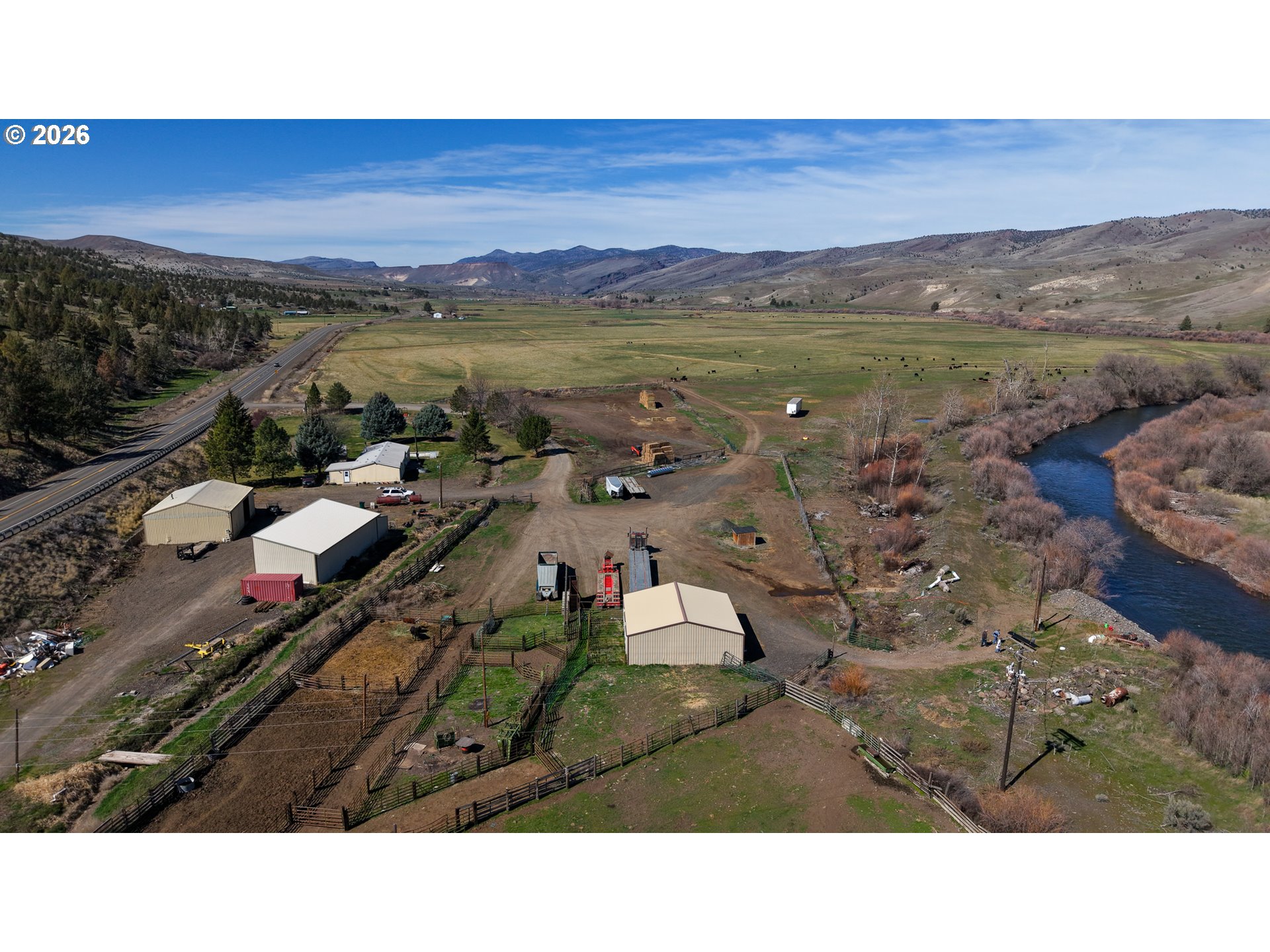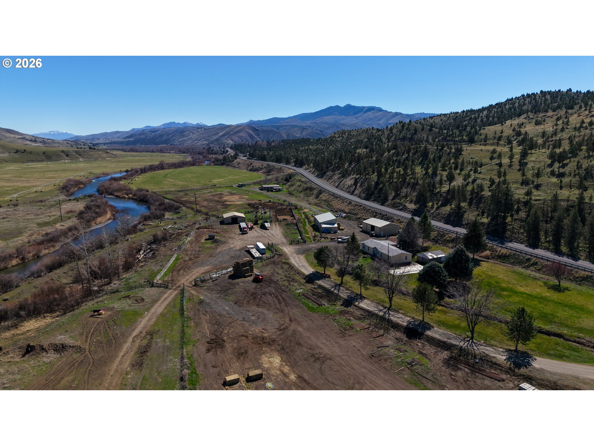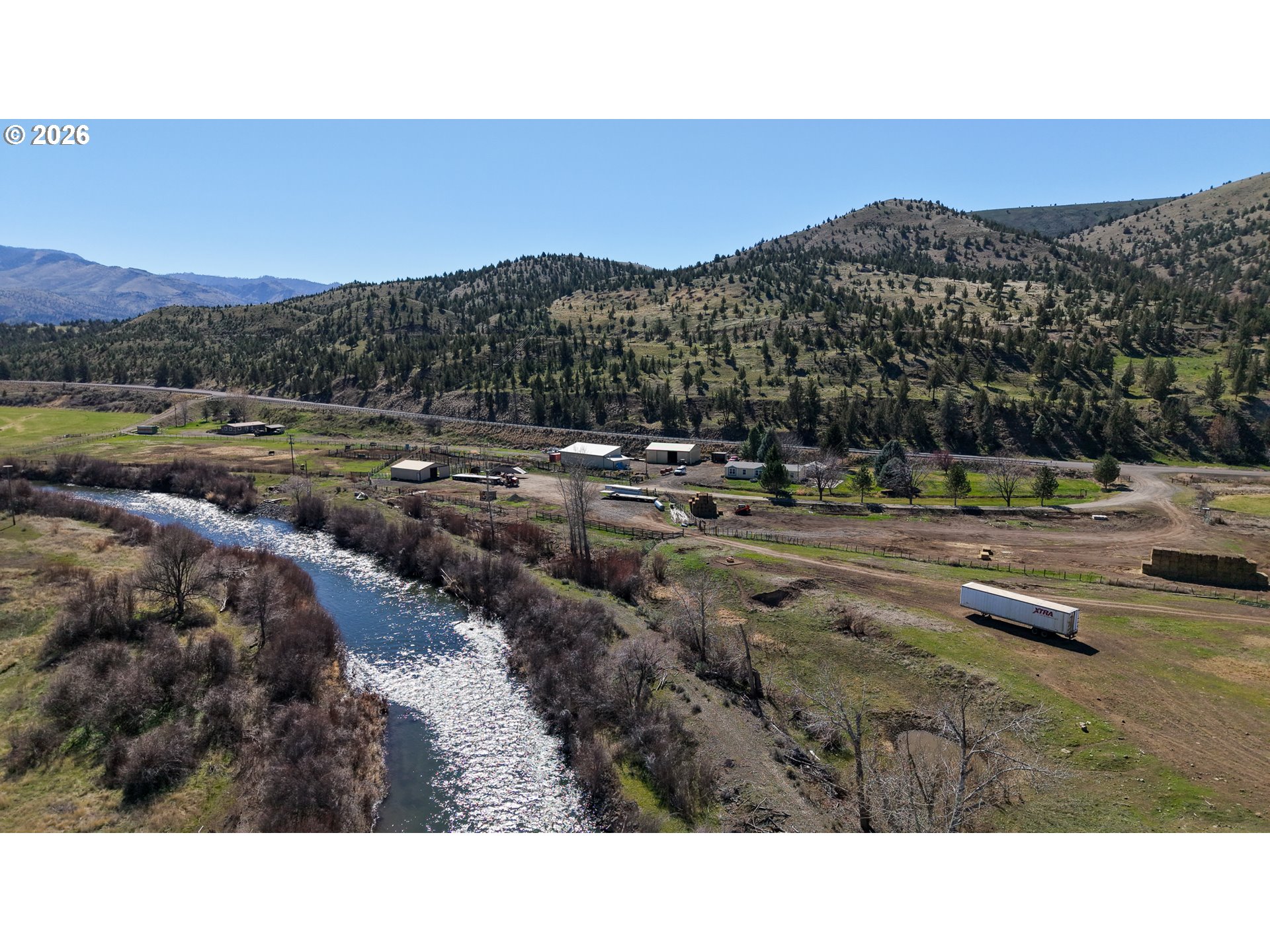 First time on market in 50 years! These ranch headquarters include 143 acres of 1868 priority water rights on 1/2 mile of South Fork John Day River. This is a prime agricultural investment boasting river frontage and high yielding farm ground all under flood irrigation. Seller is first user with two others on shared ditch water and has grazed up to 70 pair in the past after taking 160+/- ton average on first cutting. Productive soils with great growing season all planted in grass for hay or grazing. Two manufactured homes are on separate tax lots, both with garden areas and easy access to the river for fishing and swimming. The ranch is perimeter fenced with meadow pasture and is complete with cattle working facilities, portable chute, squeeze chute and calf table. Corral system has power and water with panels and pipe fencing underway. Barn has 3 stalls and hay storage, shop with concrete floor and shelving, water and wood stove, 3 bay machine shed houses three 20 HP pumps with one as backup, and has attached tack room/office area. 8x20 container convereted into meat cooler and out door fire pit is next to 3/1 Parkway MH. There are three wells, one for each home and the last for the corral system. Concrete pool pad is next to the 4/2 2004 Goldenwest MH w/12x20 addition. Seller may include rolling stock with chopper, tractor, swather, airway, gopher machine and pasture harrow upon acceptable offer. Beautiful views of Aldrich Mountain Range and Picture Gorge. Located west of Dayville on Hwy 26. Shown by appointment only to prequalified buyers. Recent property line adjustment totals 143 on the north side of river in TL 3602 to Highway 26 and includes TL 3900. See map in photo gallery.