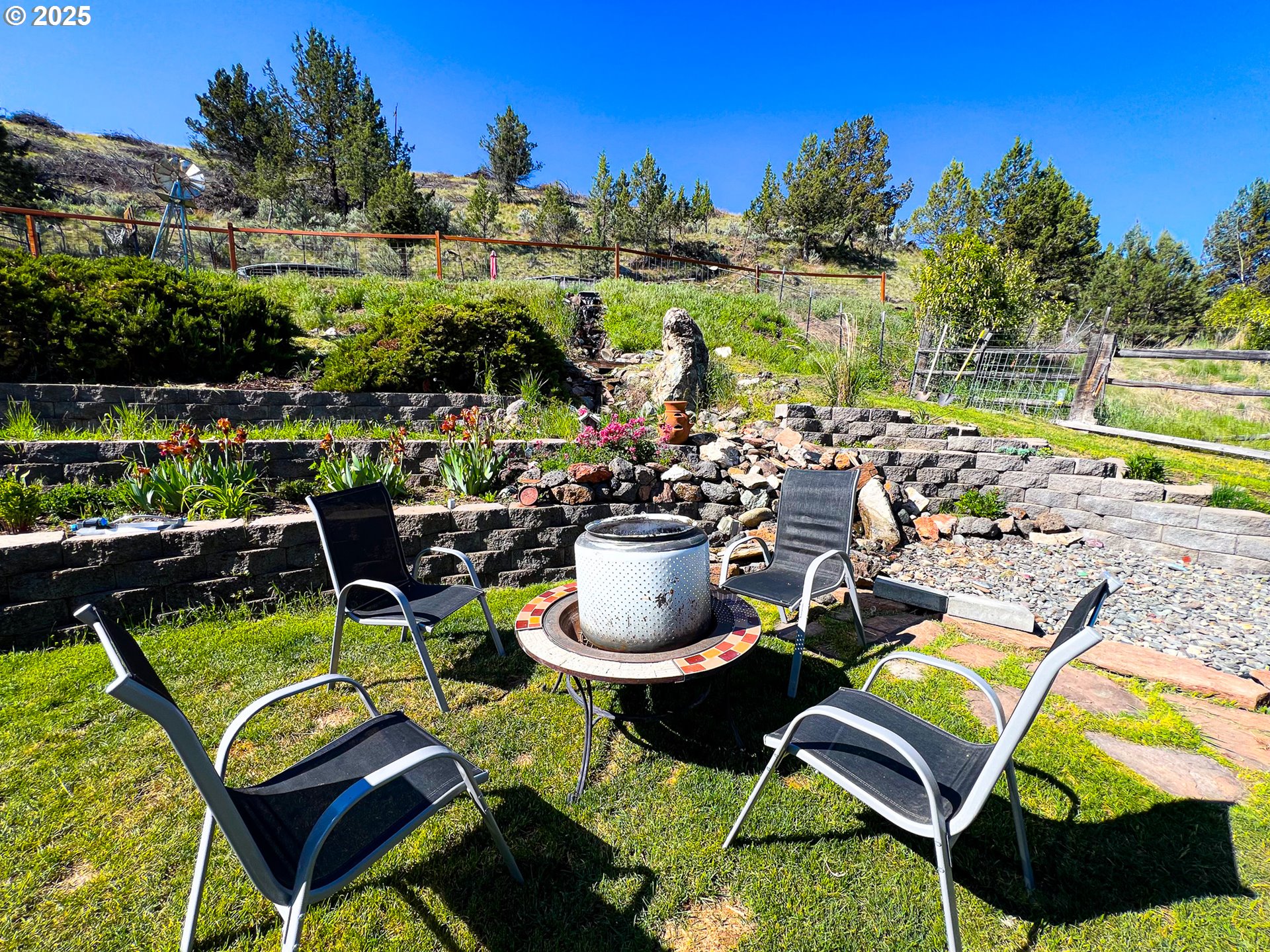 This charming 0.61-acre lot features ample parking and a serene backyard complete with a water feature. The home, with its open concept design, encompasses 1,607 square feet and includes three bedrooms and two bathrooms. The spacious living room is equipped with a woodstove, perfect for staying warm during the winter months. For climate control, the house has two mini splits for efficient heating and cooling. The centrally located kitchen offers excellent sight lines throughout the home. A generous laundry room features built-in shelving, ample space for freezers, and a propane on-demand hot water heater. The property includes a 480-square-foot detached garage with a concrete floor, workbenches, a power supply, and a lean-to for additional covered storage. The gravel driveway provides room for multiple vehicles to park comfortably. The backyard is fully fenced and cross-fenced, offering a patio with a covered awning, creating an ideal dining area for summer gatherings. It includes multiple landings and ditch rights to ensure a lush, green lawn.