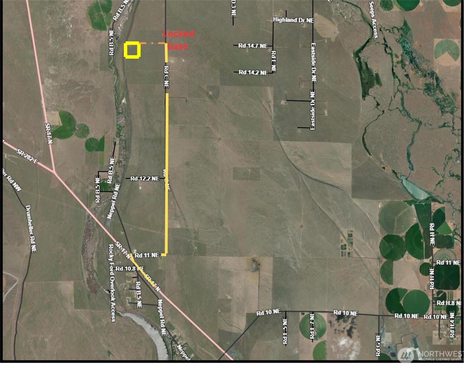Peace and tranquility on 40 acres between Moses Lake and Soap Lake. Property is located west of Road C and comes with some privacy, yet overlooks Rocky Ford Creek and the Trout Lodge nursery. Great views of the hills and lights of Ephrata, with the moon and the stars above make for a picturesque setting outdoors with an abundance of wildlife around you. Property already has a 200-foot, 6-inch casing well with a 2-horsepower pump, a generator to run the pump, a 196-square foot shack and two trailers are also a part of the sale. Dump truck is sold separately. Property is zoned residential and there is a 60-foot easement to the property from Road C.