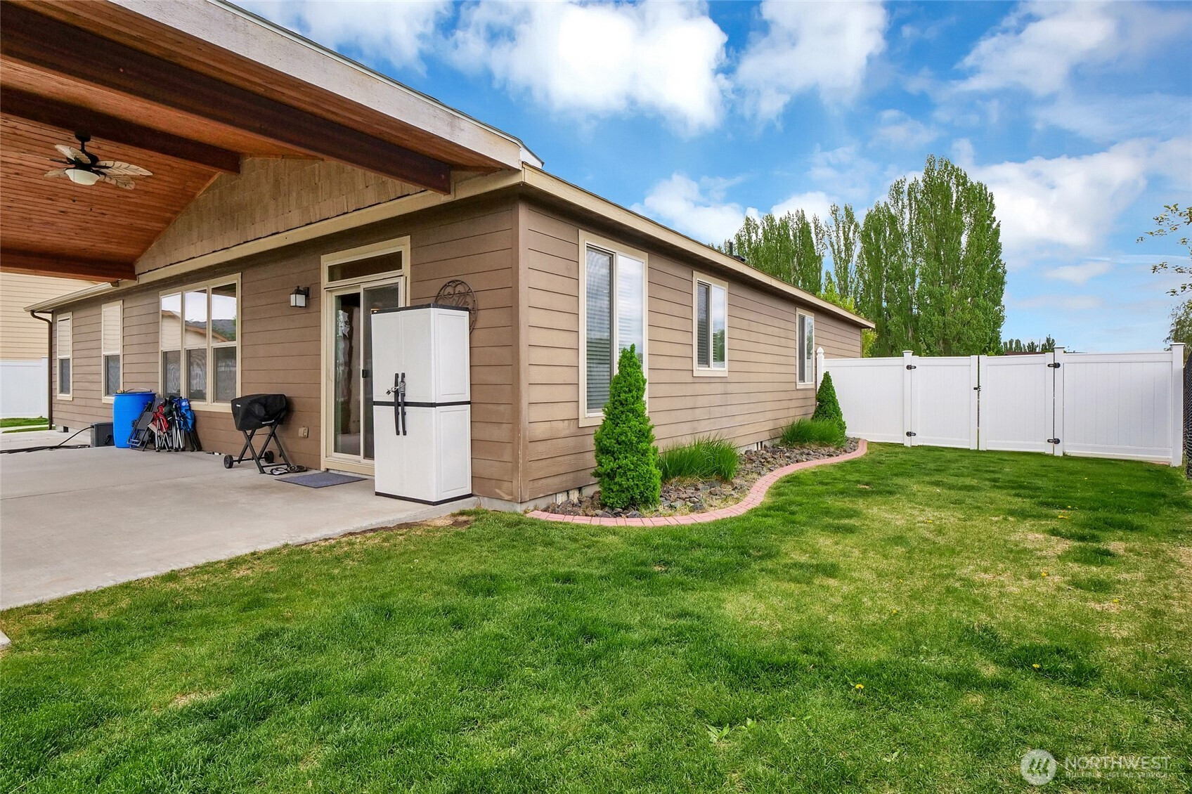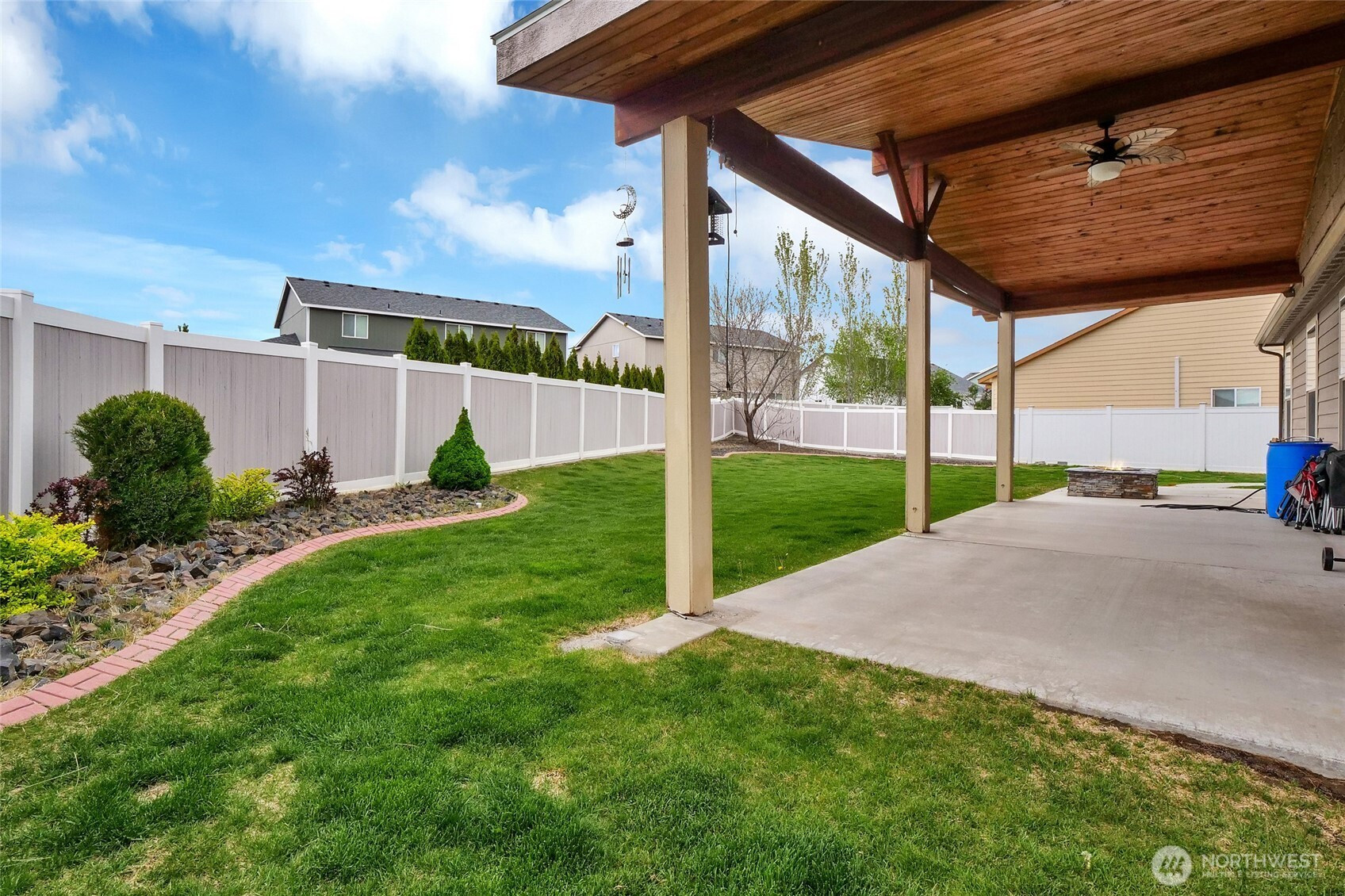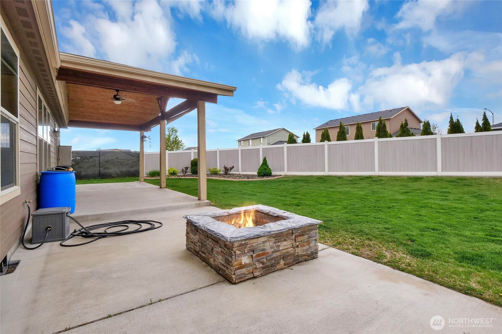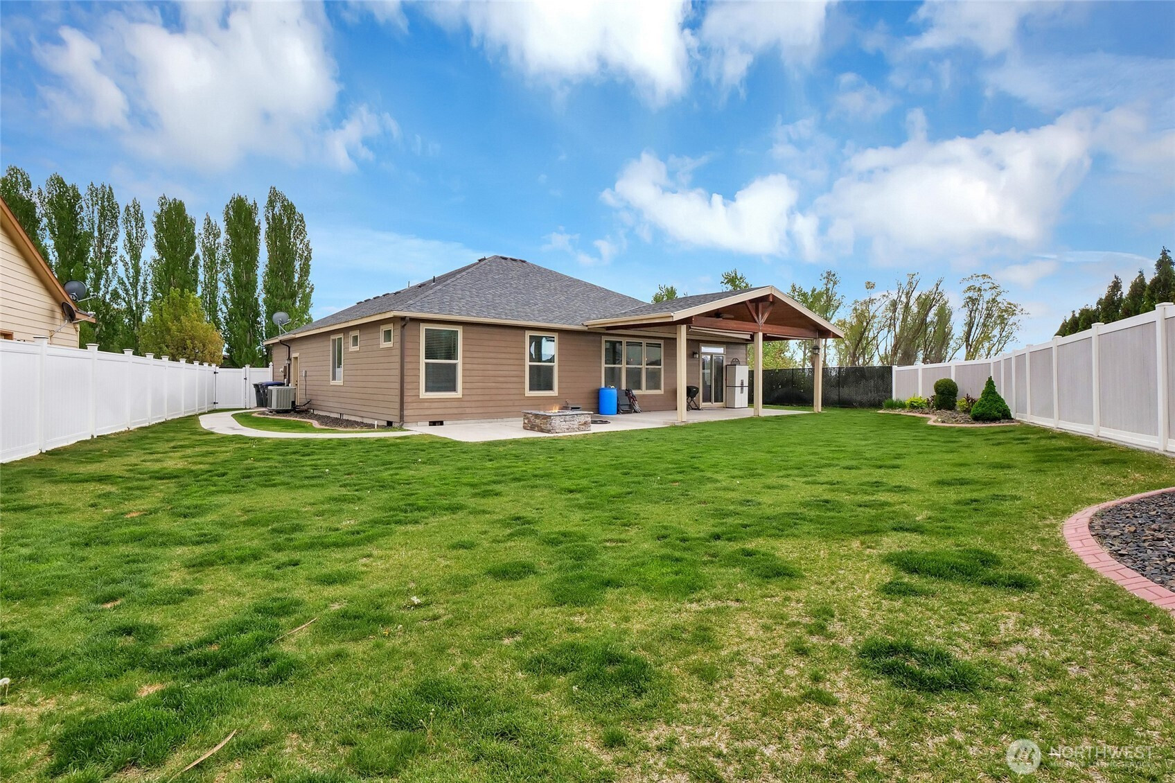 Designed for entertaining, this beautifully maintained Moses Lake rambler is a must-see. The heart of the home is a spacious great room featuring an open-concept kitchen, large dining area, and an electric fireplace—perfect for gatherings large or small. The gourmet kitchen impresses with granite countertops, stainless steel appliances, a pantry, built-in bar with both a wine fridge and beverage fridge, and a center island for additional seating and prep space. Step outside to the oversized covered patio, creating seamless indoor/outdoor living. The patio’s wood-vaulted ceiling adds warmth and charm, while the custom fire pit, big fully fenced backyard, and underground sprinklers complete this inviting outdoor retreat. Inside, the home offers a welcoming front entry, a dedicated office or den, three bedrooms, and two full bathrooms. The spacious primary suite features a luxurious ensuite bath with soaker tub, separate shower, dual vanity, and large walk-in closet. Fresh interior paint throughout adds to the home’s move-in-ready appeal. Located near Moses Lake Golf Club and Pillar Rock Grill, this home combines comfort, style, and location—perfect for those seeking single-level living in Moses Lake.