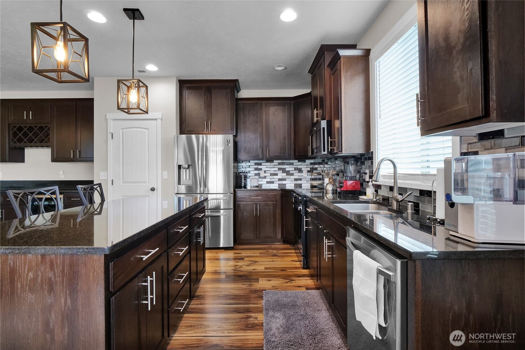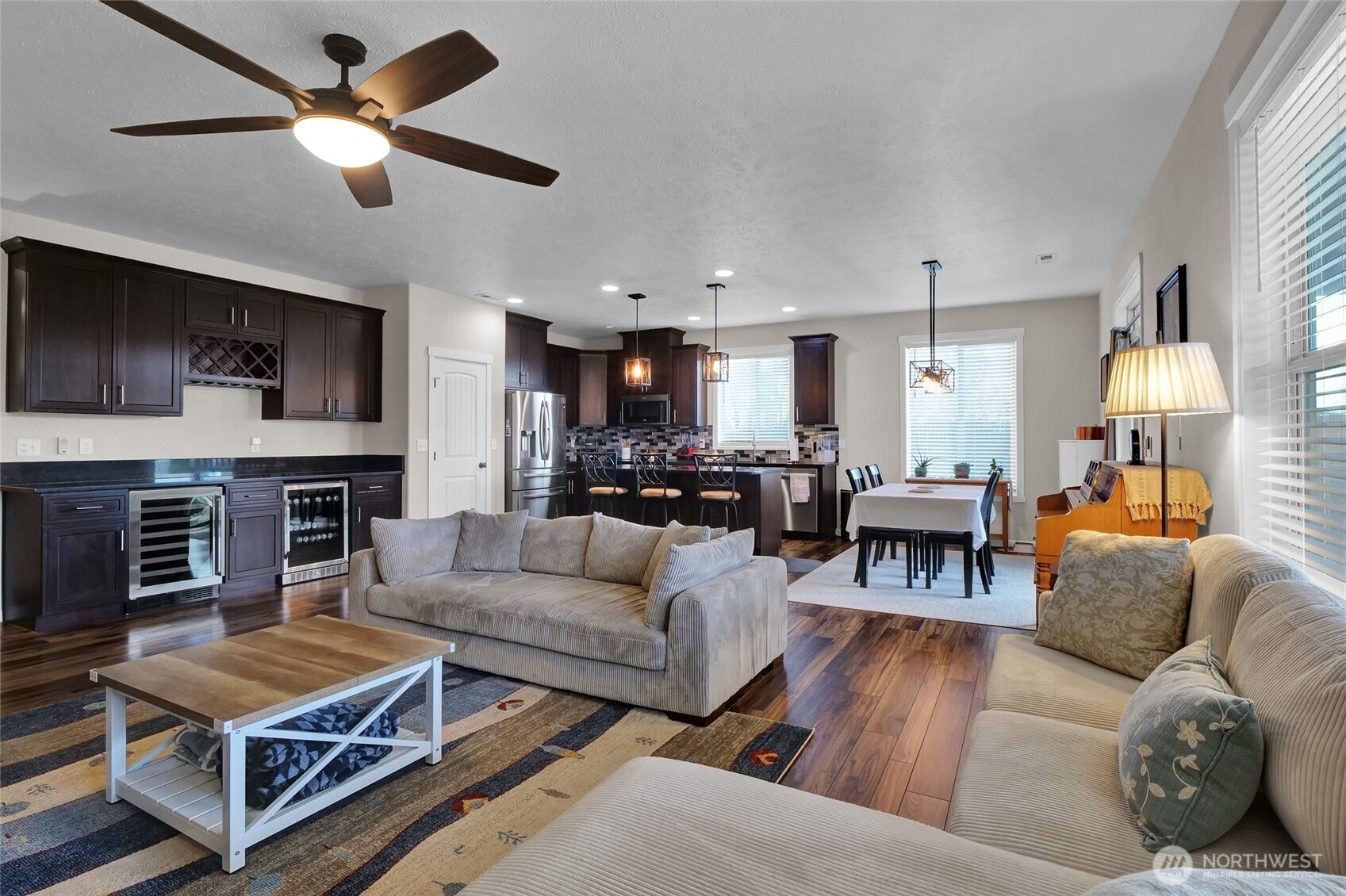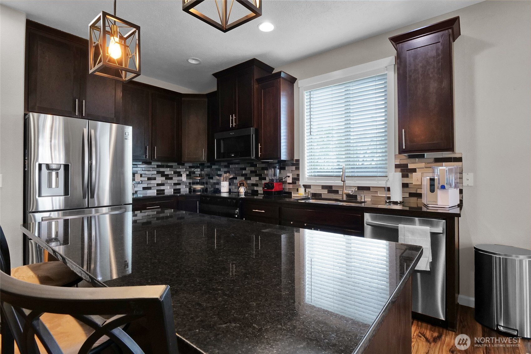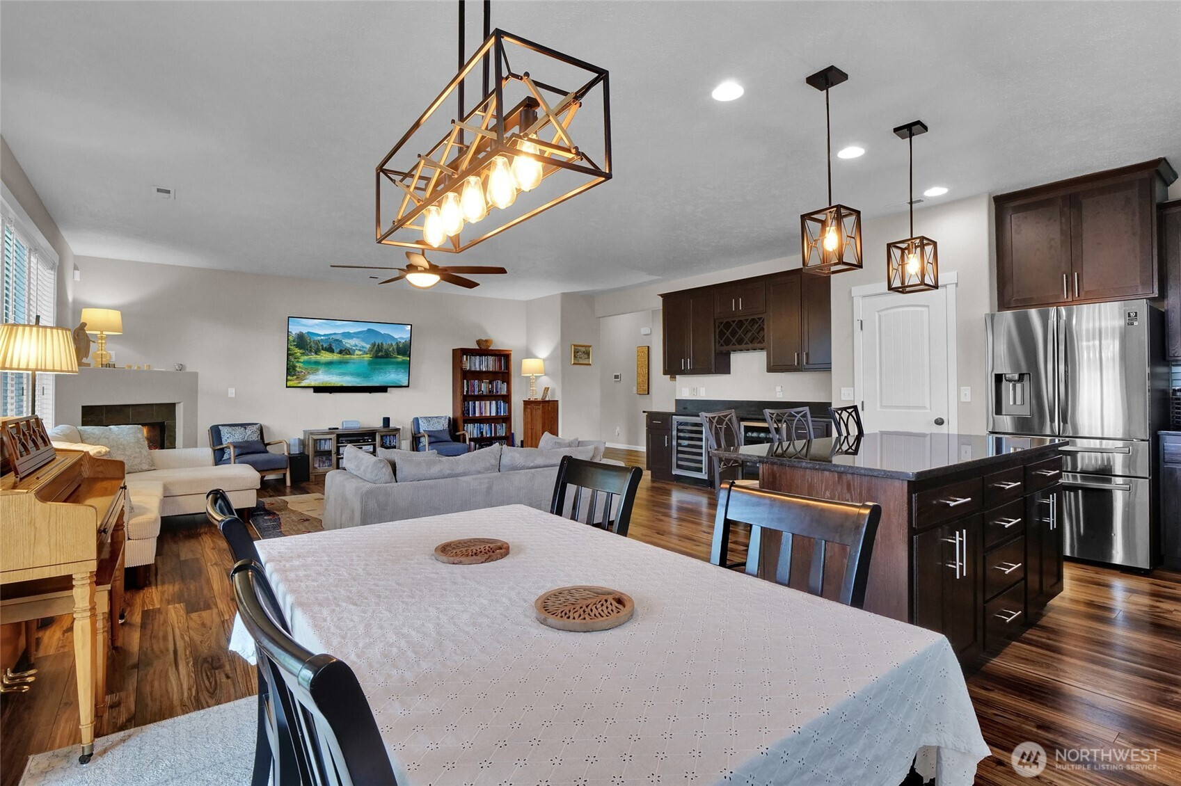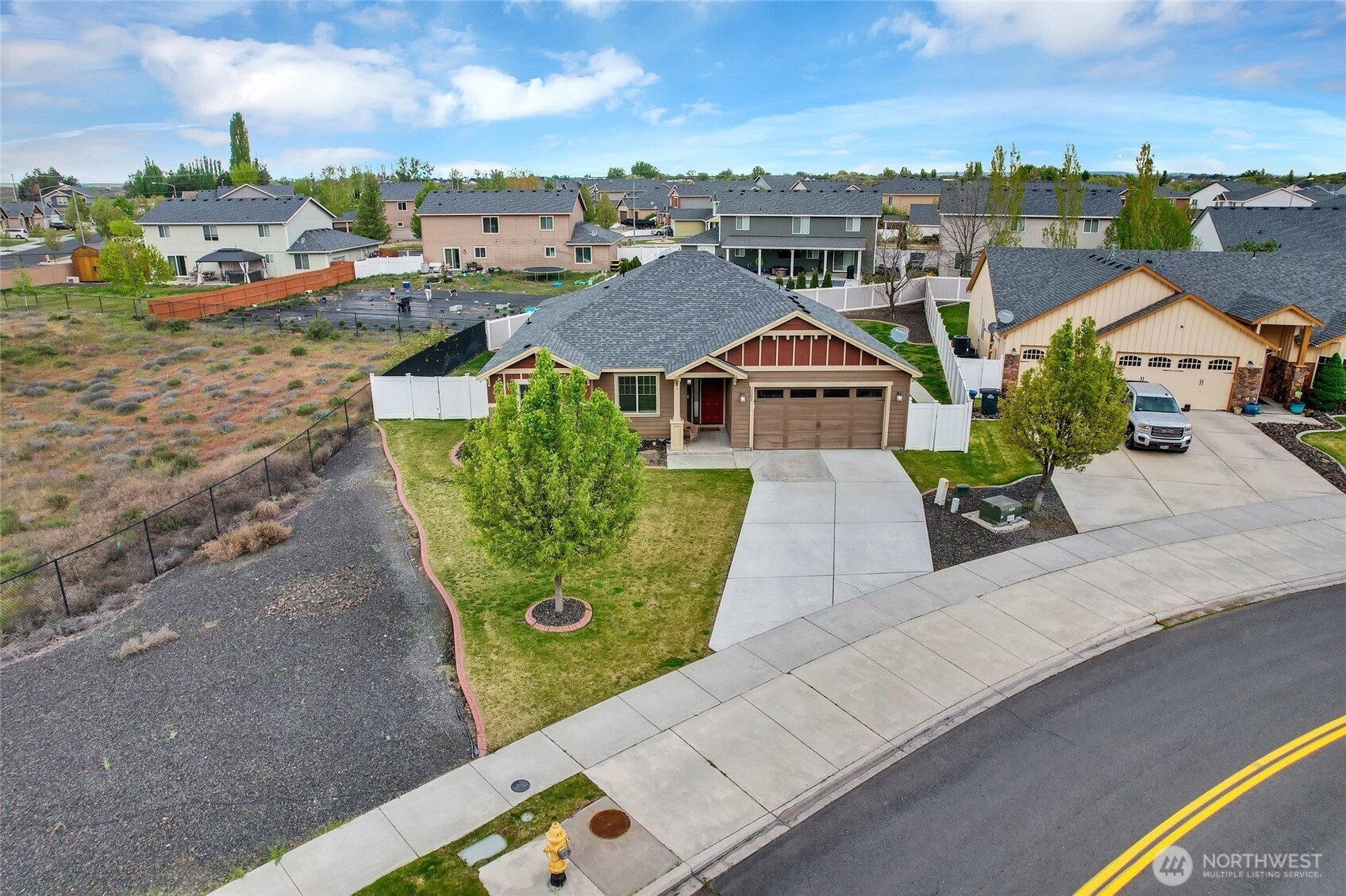 Designed for entertaining, this beautifully maintained Moses Lake rambler is a must-see. The heart of the home is a spacious great room featuring an open-concept kitchen, large dining area, and an electric fireplace—perfect for gatherings large or small. The gourmet kitchen impresses with granite countertops, stainless steel appliances, a pantry, built-in bar with both a wine fridge and beverage fridge, and a center island for additional seating and prep space. Step outside to the oversized covered patio, creating seamless indoor/outdoor living. The patio’s wood-vaulted ceiling adds warmth and charm, while the custom fire pit, big fully fenced backyard, and underground sprinklers complete this inviting outdoor retreat. Inside, the home offers a welcoming front entry, a dedicated office or den, three bedrooms, and two full bathrooms. The spacious primary suite features a luxurious ensuite bath with soaker tub, separate shower, dual vanity, and large walk-in closet. Fresh interior paint throughout adds to the home’s move-in-ready appeal. Located near Moses Lake Golf Club and Pillar Rock Grill, this home combines comfort, style, and location—perfect for those seeking single-level living in Moses Lake.