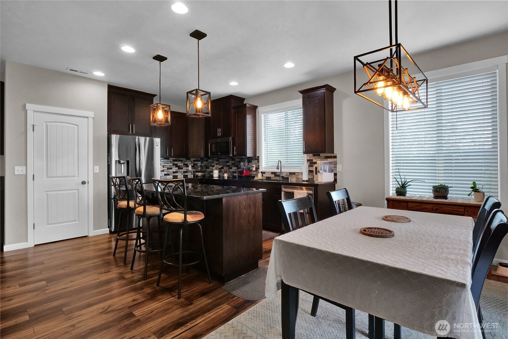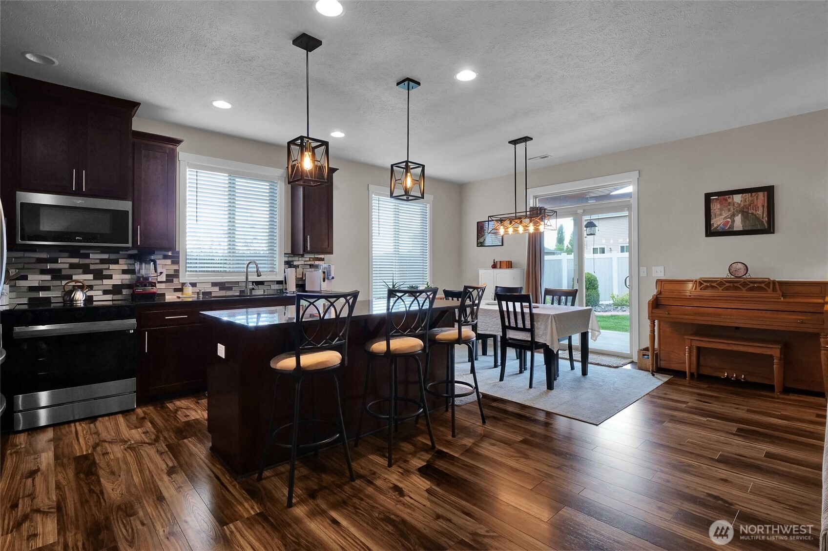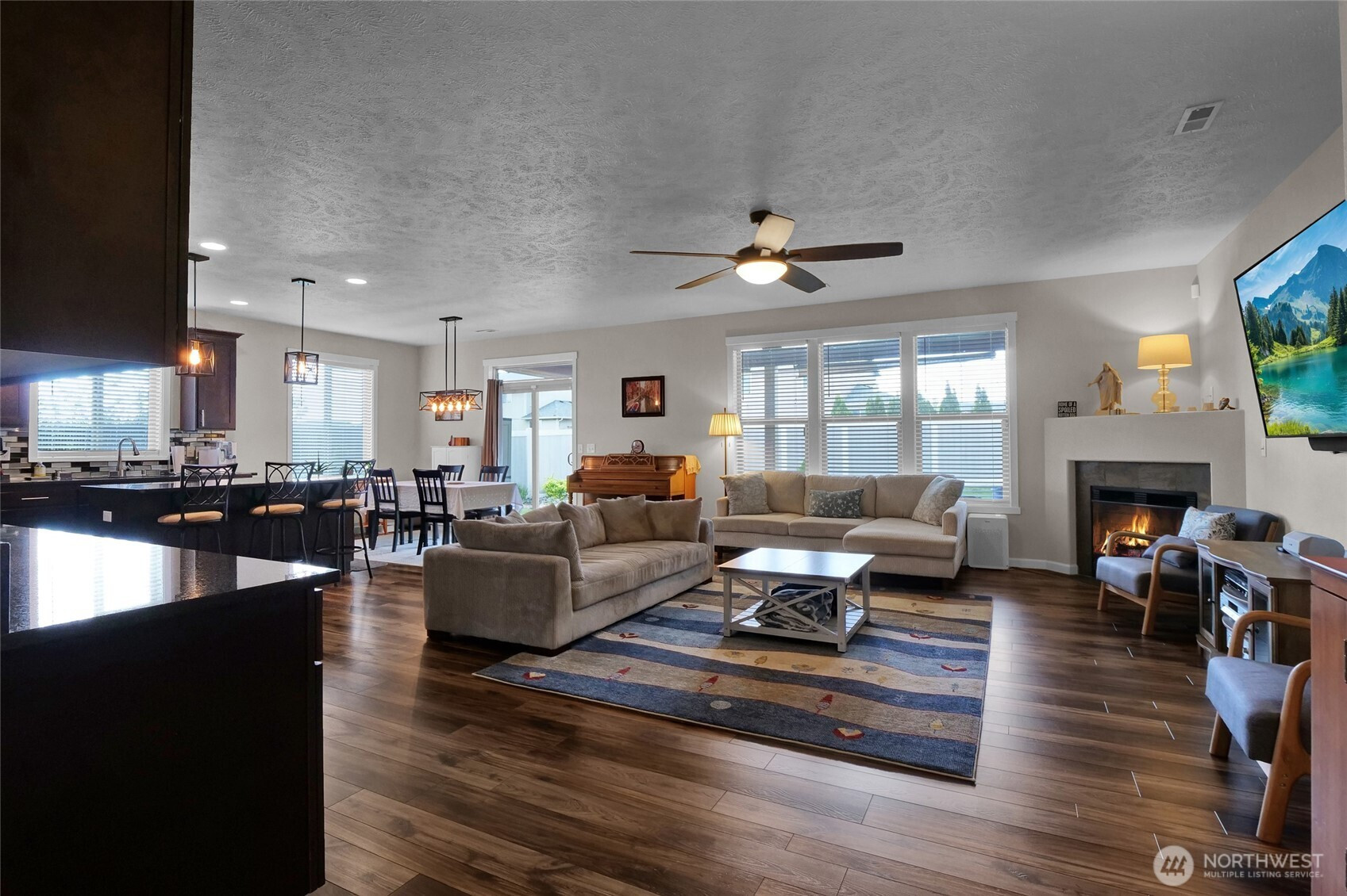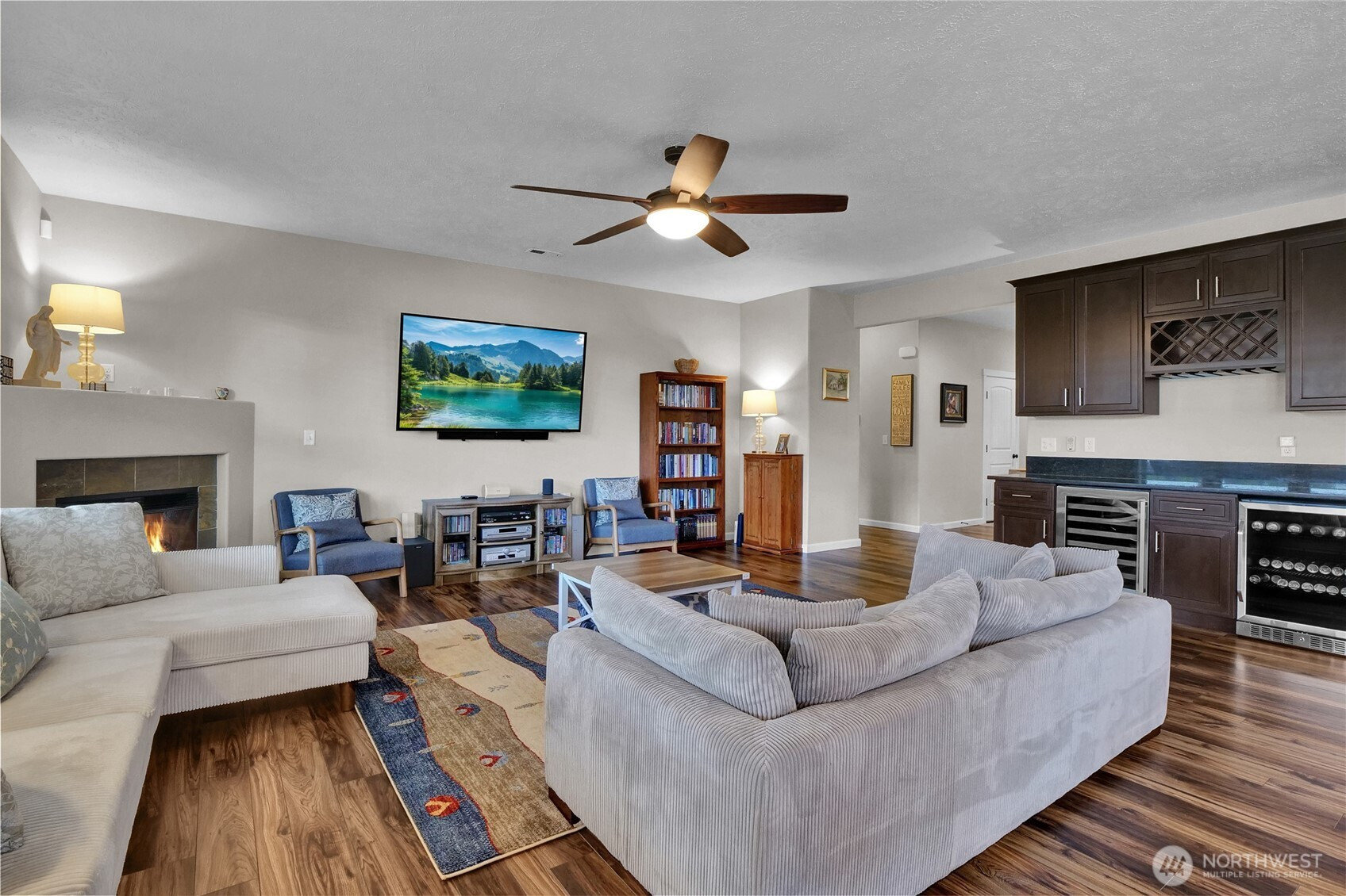 Designed for entertaining, this beautifully maintained Moses Lake rambler is a must-see. The heart of the home is a spacious great room featuring an open-concept kitchen, large dining area, and an electric fireplace—perfect for gatherings large or small. The gourmet kitchen impresses with granite countertops, stainless steel appliances, a pantry, built-in bar with both a wine fridge and beverage fridge, and a center island for additional seating and prep space. Step outside to the oversized covered patio, creating seamless indoor/outdoor living. The patio’s wood-vaulted ceiling adds warmth and charm, while the custom fire pit, big fully fenced backyard, and underground sprinklers complete this inviting outdoor retreat. Inside, the home offers a welcoming front entry, a dedicated office or den, three bedrooms, and two full bathrooms. The spacious primary suite features a luxurious ensuite bath with soaker tub, separate shower, dual vanity, and large walk-in closet. Fresh interior paint throughout adds to the home’s move-in-ready appeal. Located near Moses Lake Golf Club and Pillar Rock Grill, this home combines comfort, style, and location—perfect for those seeking single-level living in Moses Lake.