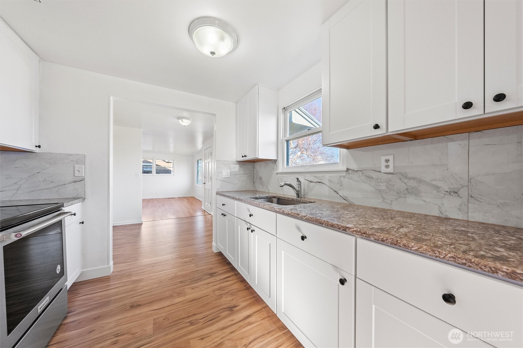 This charming home features MANY recent updates that add exceptional value. Enjoy a fully remodeled kitchen with new cabinets, quartz countertops, a full-height quartz backsplash, stainless steel appliances, fresh interior paint, and updated walls that replace the old paneling. New flooring flows throughout the main areas, while original hardwood floors in the bedrooms bring classic warmth. Abundant built-in storage and cabinetry enhance functionality throughout. Outside, enjoy pristine landscaping with a full sprinkler system, a fully fenced backyard, and a convenient storage shed. Located just minutes from the elementary school and downtown, this home delivers comfort, updates, and an unbeatable location.