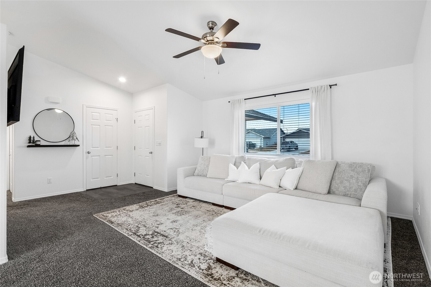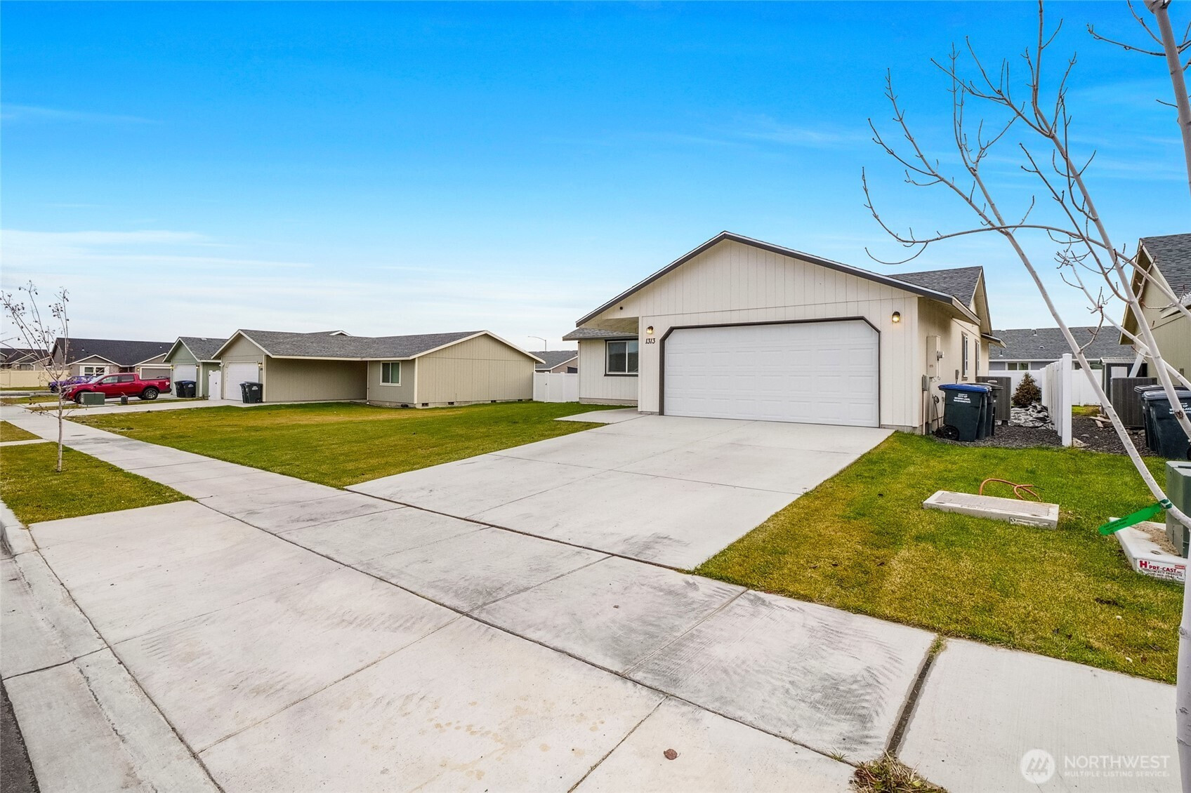 This perfect entry-level home features 3 bedrooms and 1.75 baths w/ an open concept layout, vaulted ceilings, and a bright dining and living area. The kitchen comes fully equipped with all major appliances and includes a convenient pantry. The primary bedroom fits a king-size bed w/ plenty of room to spare and offers a large walk-in closet and a walk-in shower. The laundry area comes with a washer and dryer, and the true two-car, 400 sq. ft. garage provides great storage. Outside, enjoy a spacious poured concrete patio ideal for BBQs and gatherings, plus curbing, landscaping, and built-in sprinklers for easy maintenance. Located right next to an elementary school with parks close by, this home is move-in ready with everything you need.