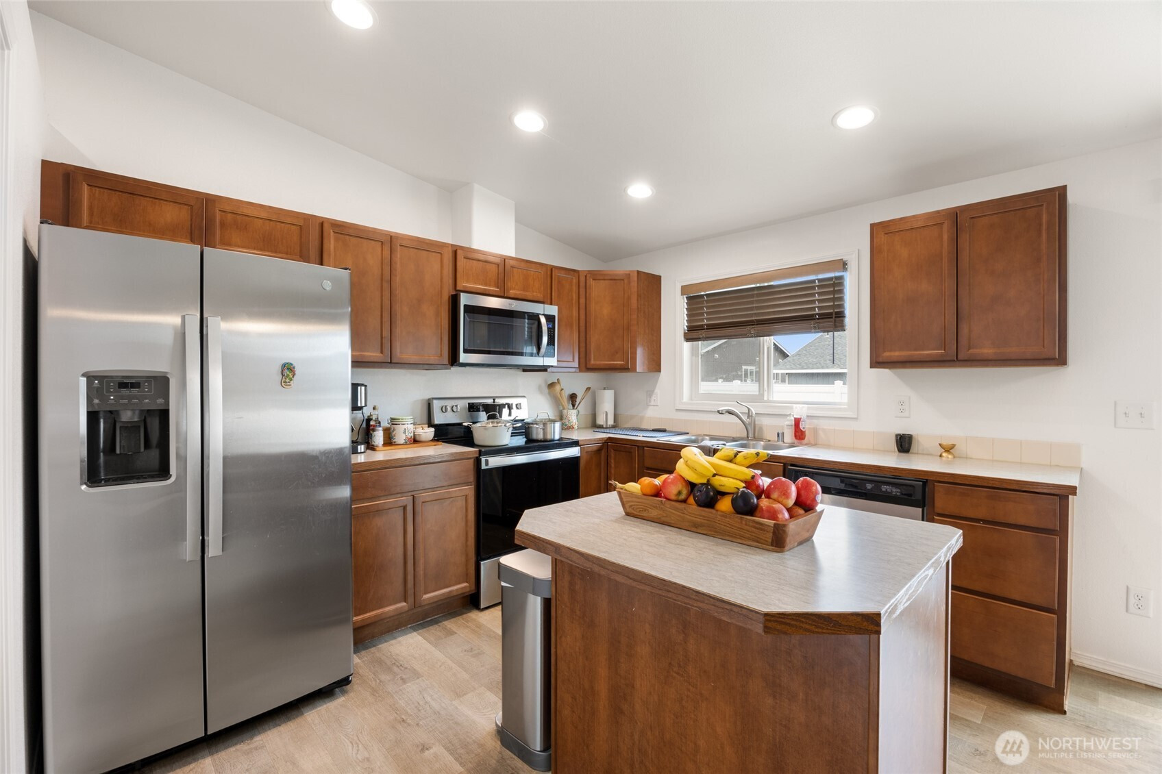 This inviting 4-bedroom home blends warmth, light, and thoughtful design into a space that feels instantly welcoming. Step inside to an open-concept layout where vaulted ceilings lift the room, and sunlight pours across the bright living and dining areas, creating a sense of airiness and ease. The kitchen is fully outfitted with all major appliances and a walk-in pantry, offering both convenience and charm for everyday cooking or weekend gatherings.The spacious primary bedroom comfortably fits a king-size bed with room to spare, and its large walk-in closet provides generous storage. The attached full bath adds a touch of comfort and practicality. Three additional bedrooms offer flexibility for guests, hobbies, or a home office. A dedicated laundry room leads out to the 2-car garage, which provides ample space for vehicles, tools, and storage. Outdoors, a poured-concrete patio invites you to unwind, grill, or host friends under the open sky. The front yard is landscaped and has underground sprinklers, making upkeep effortless and leaving more time to enjoy the space. Perfectly positioned near an elementary school and nearby parks, this home offers both convenience and a sense of community. With its bright interior, functional layout, and move-in-ready features, it’s a place where comfort and everyday living come together beautifully.