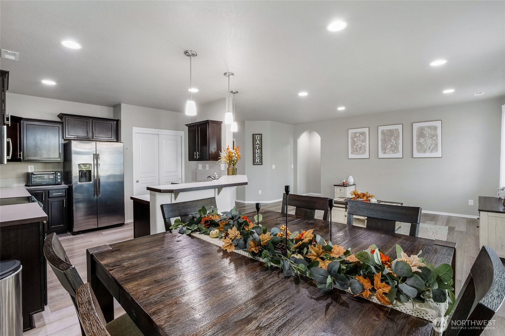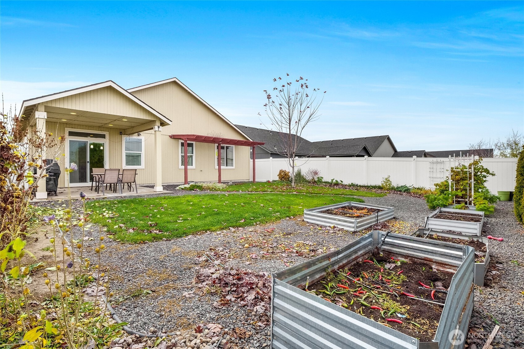 Charming and move-in ready, this 3-bedroom, 1.75-bath home offers a warm, welcoming layout and fantastic outdoor space. Step inside to an open-concept great room with a dining area, breakfast bar, and easy-flow design. The spacious primary suite includes a walk-in closet, dual sinks, and a private 3/4 bath. Outside, enjoy a fully fenced yard with beautiful landscaping, raised garden beds, and a covered patio perfect for year-round relaxation. The finished 2-car garage with extra depth provides added storage and convenience.