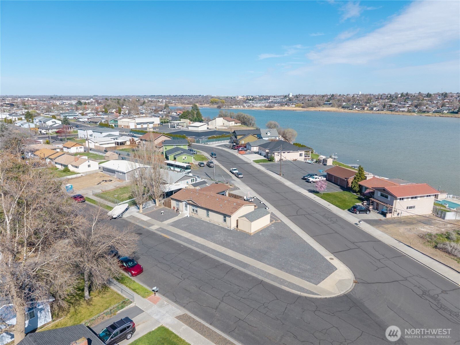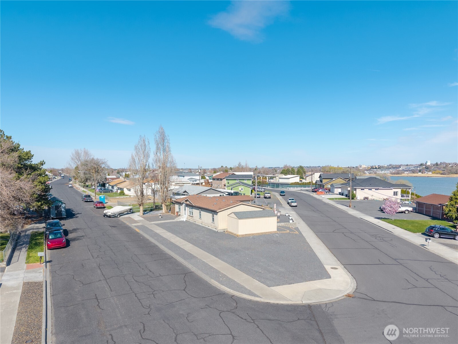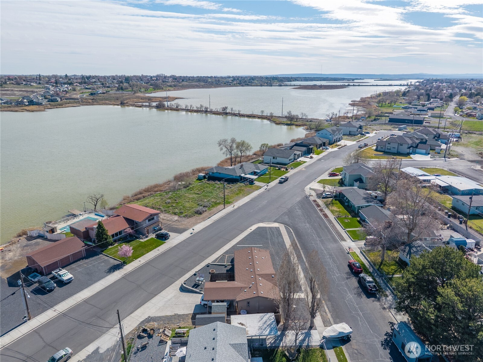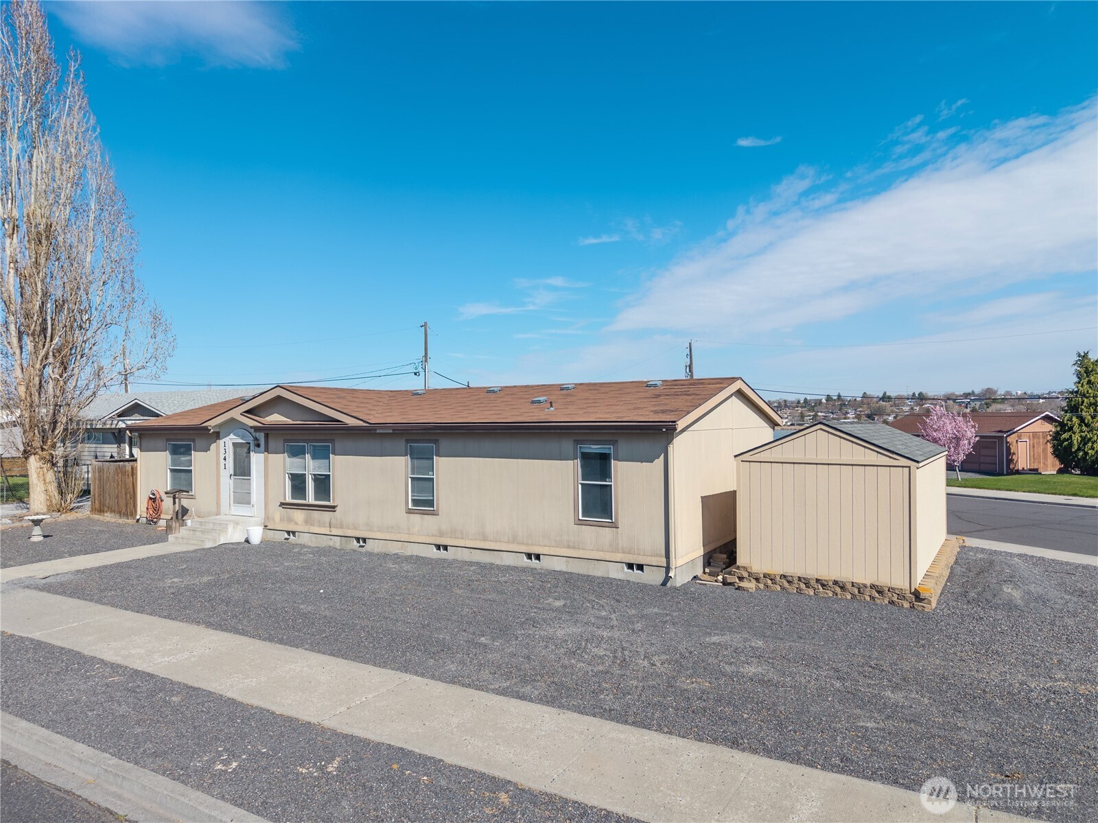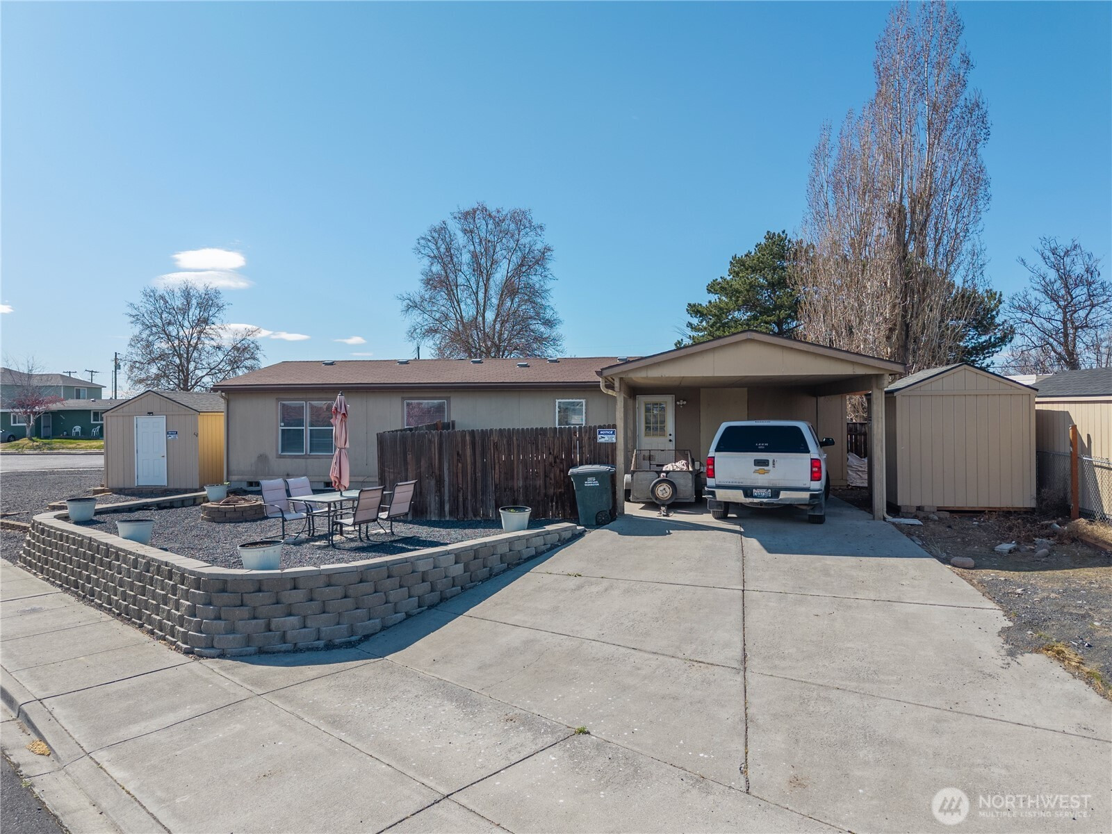Tucked onto a quiet corner lot on Moses Lake's sought-after Guffin-Eccles, this 3-bedroom, 2-bath home pairs a fresh, modern feel with an unbeatable location. Steps from the water and walkable to downtown shops, with Moses Lake High and Frontier Middle in-district. Inside, luxury vinyl plank flooring and fresh paint run throughout an open, light-filled floor plan. The spacious living room flows into a dining area and open kitchen featuring a center island, breakfast bar, abundant cabinetry, and vaulted ceilings that keep things bright and airy. Thoughtfully split for privacy, the primary suite offers a walk-in closet and spa-style en-suite with dual vanities and a soaking tub. Two additional bedrooms and a full bath sit on the opposite side - ideal for guests, a home office, or hobbies. A dedicated laundry room with modern washer and dryer, freezer, and extra storage adds everyday ease. Outside, enjoy a partially fenced area perfect for a hot tub, decorative pavers framing a welcoming gravel patio for evening gatherings, peek-a-boo lake views, and two storage sheds. This manufactured home is on a sturdy concrete block foundation. A covered carport plus ample off-street parking complete the package. Central A/C, electric forced-air heat, updated flooring, and fresh paint - all at an approachable price point. Schedule your showing today.