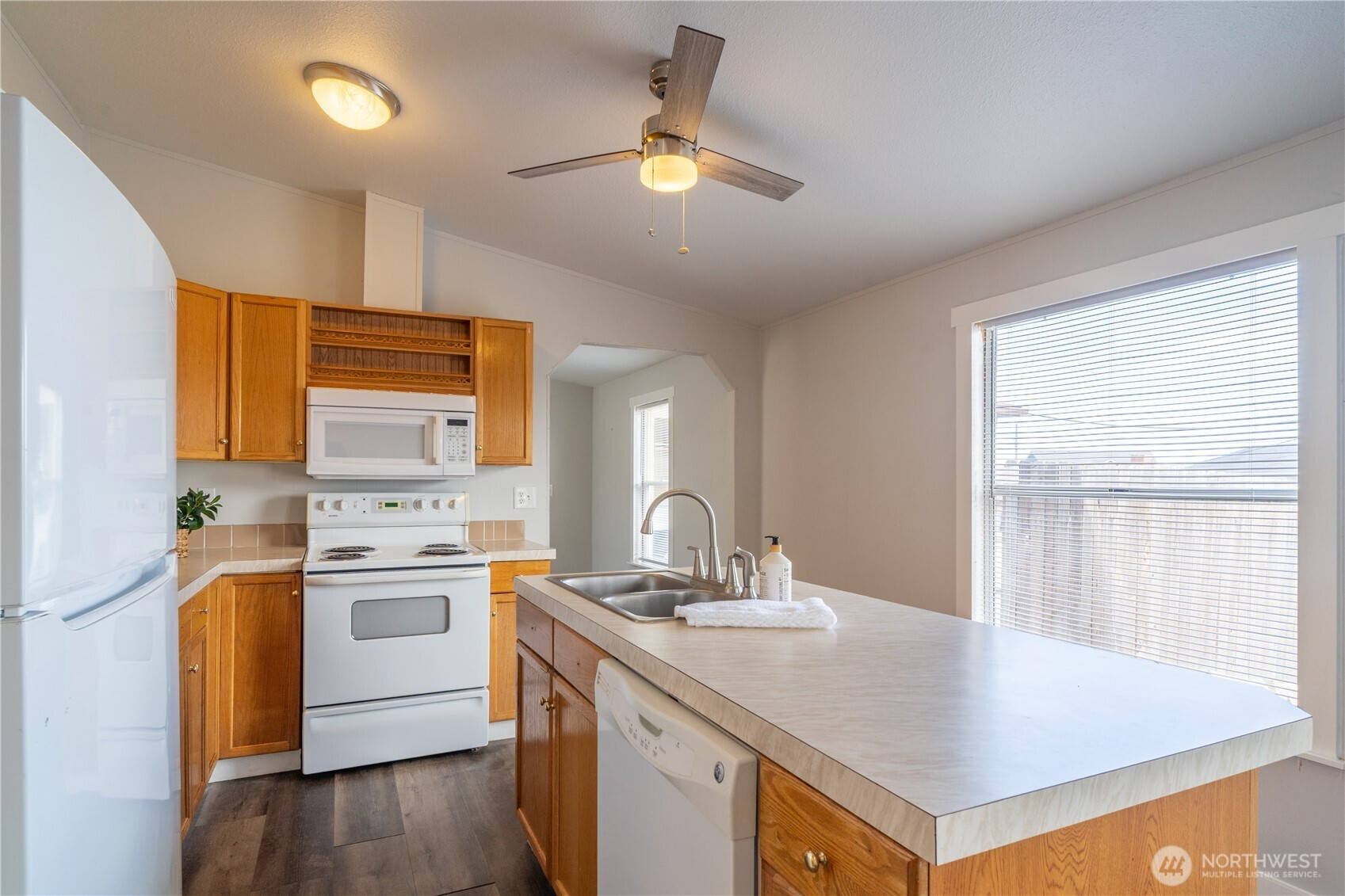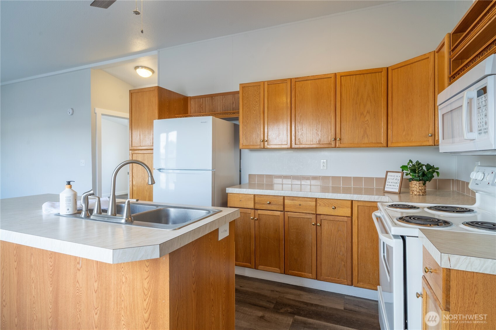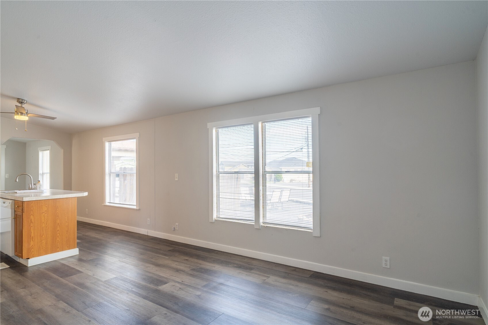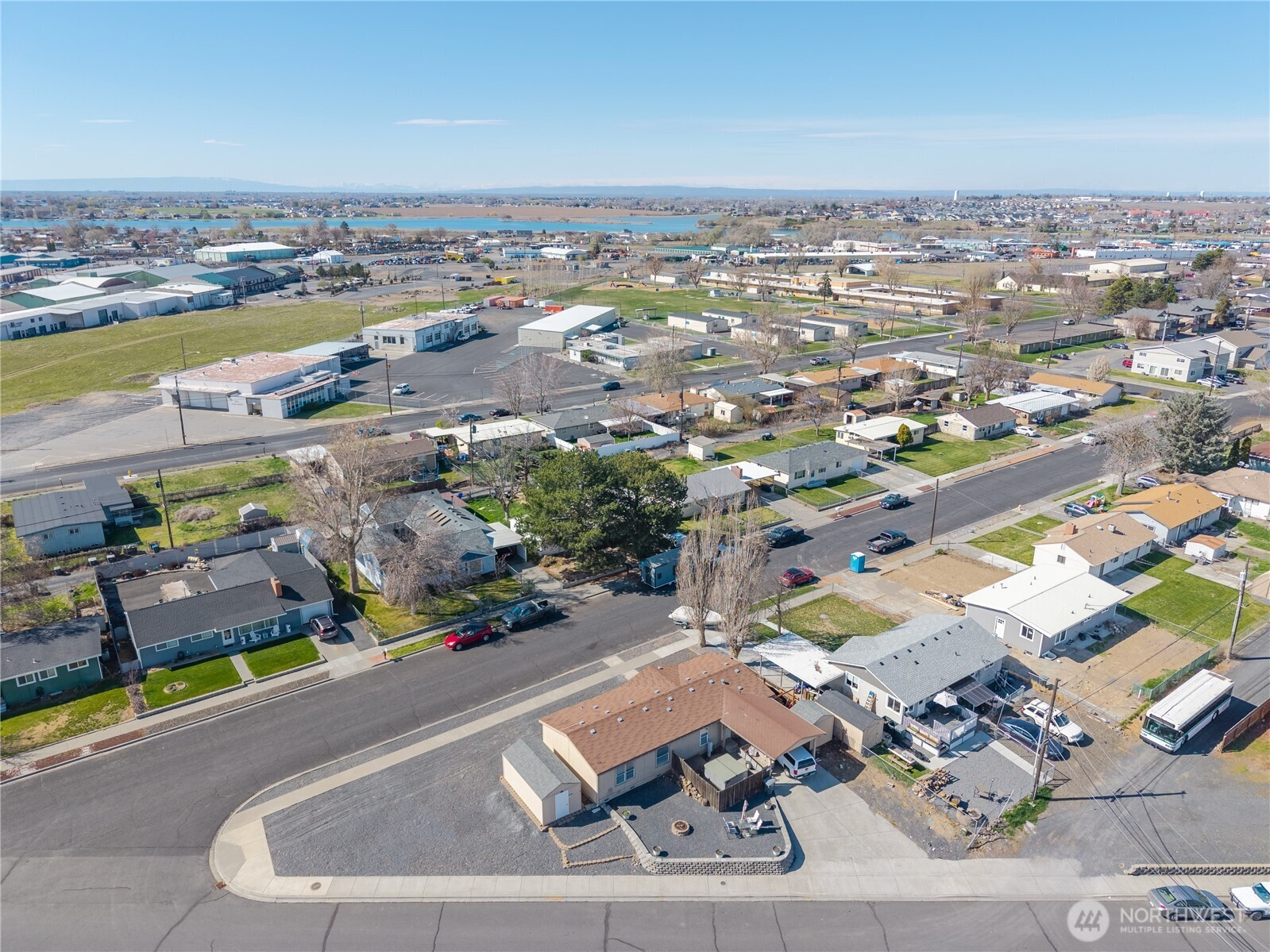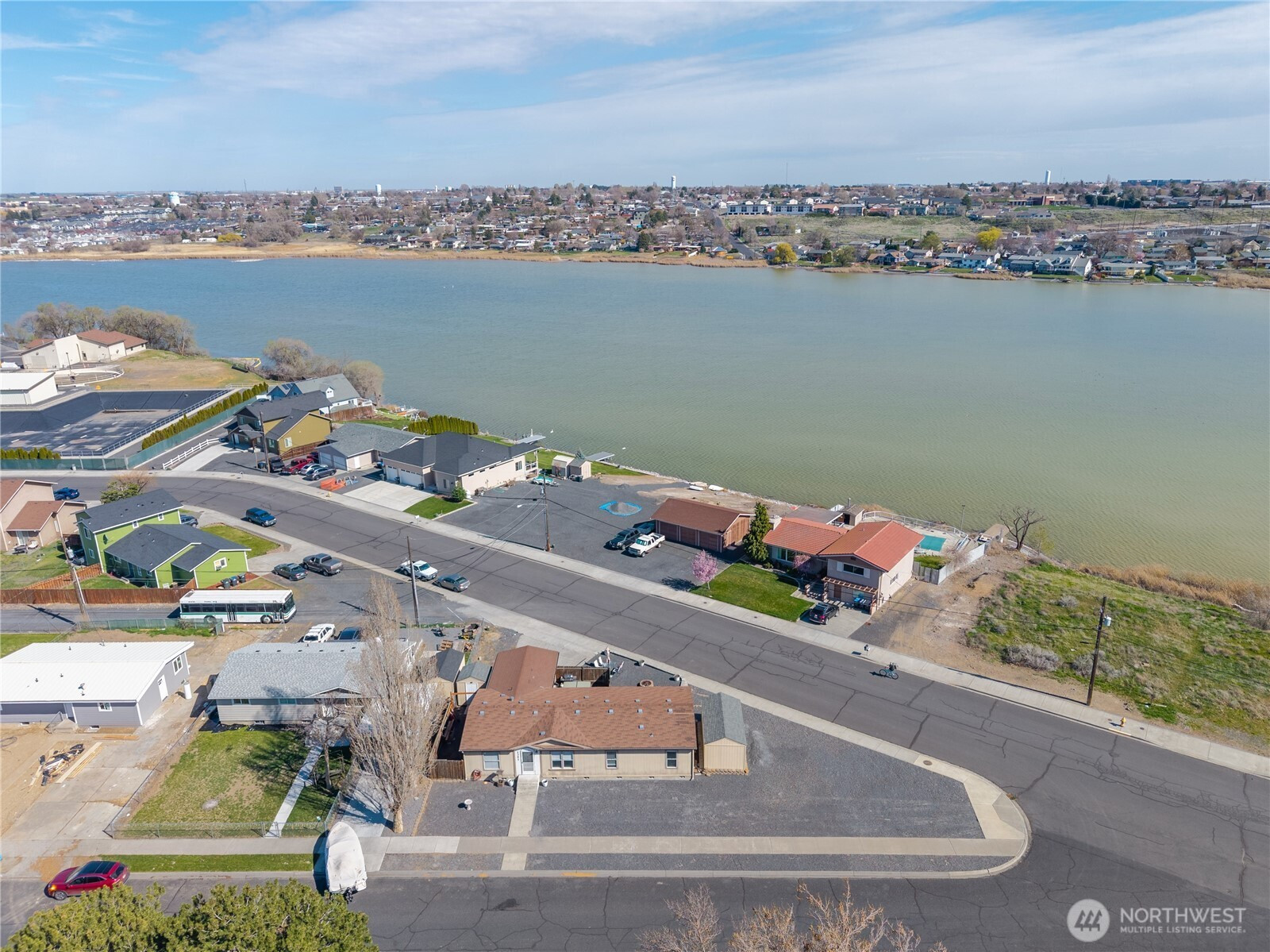 Tucked onto a quiet corner lot on Moses Lake's sought-after Guffin-Eccles, this 3-bedroom, 2-bath home pairs a fresh, modern feel with an unbeatable location. Steps from the water and walkable to downtown shops, with Moses Lake High and Frontier Middle in-district. Inside, luxury vinyl plank flooring and fresh paint run throughout an open, light-filled floor plan. The spacious living room flows into a dining area and open kitchen featuring a center island, breakfast bar, abundant cabinetry, and vaulted ceilings that keep things bright and airy. Thoughtfully split for privacy, the primary suite offers a walk-in closet and spa-style en-suite with dual vanities and a soaking tub. Two additional bedrooms and a full bath sit on the opposite side - ideal for guests, a home office, or hobbies. A dedicated laundry room with modern washer and dryer, freezer, and extra storage adds everyday ease. Outside, enjoy a partially fenced area perfect for a hot tub, decorative pavers framing a welcoming gravel patio for evening gatherings, peek-a-boo lake views, and two storage sheds. This manufactured home is on a sturdy concrete block foundation. A covered carport plus ample off-street parking complete the package. Central A/C, electric forced-air heat, updated flooring, and fresh paint - all at an approachable price point. Schedule your showing today.