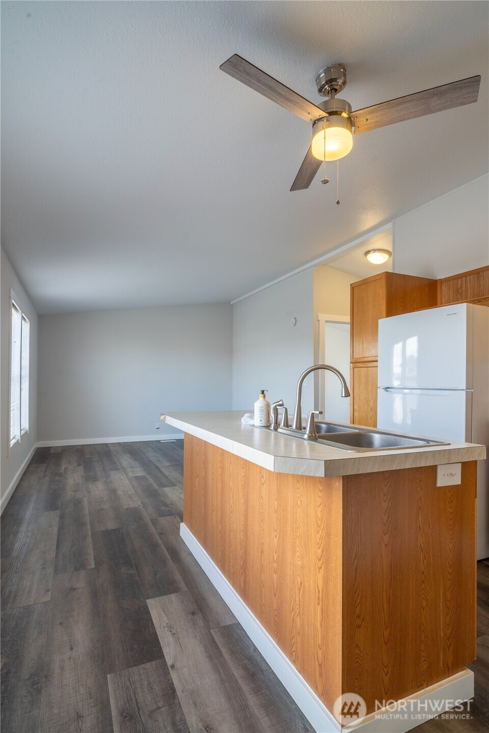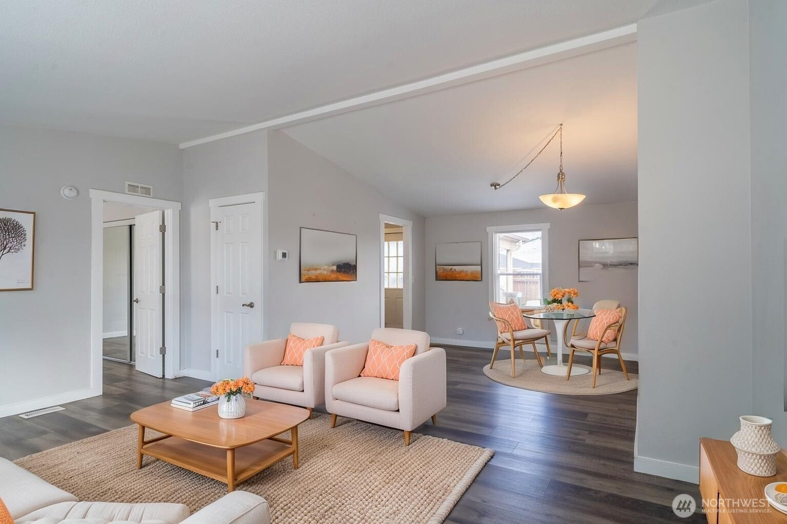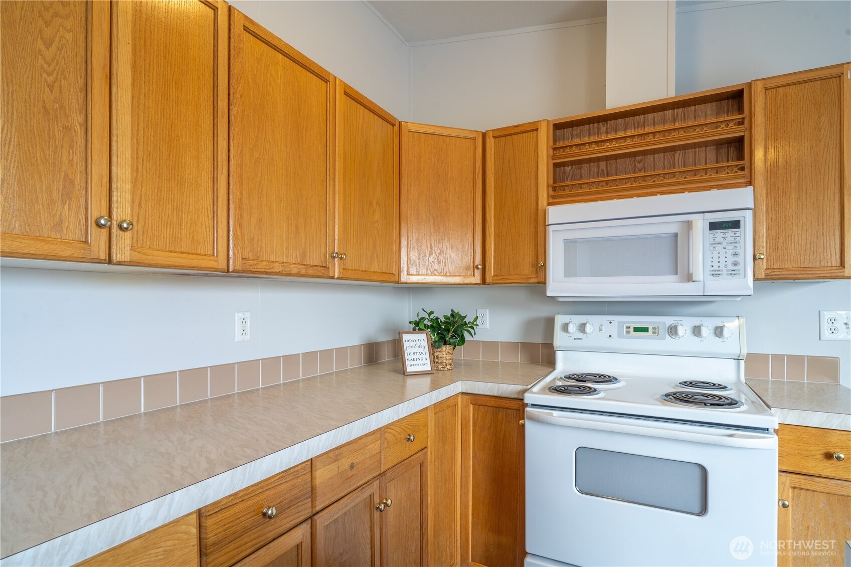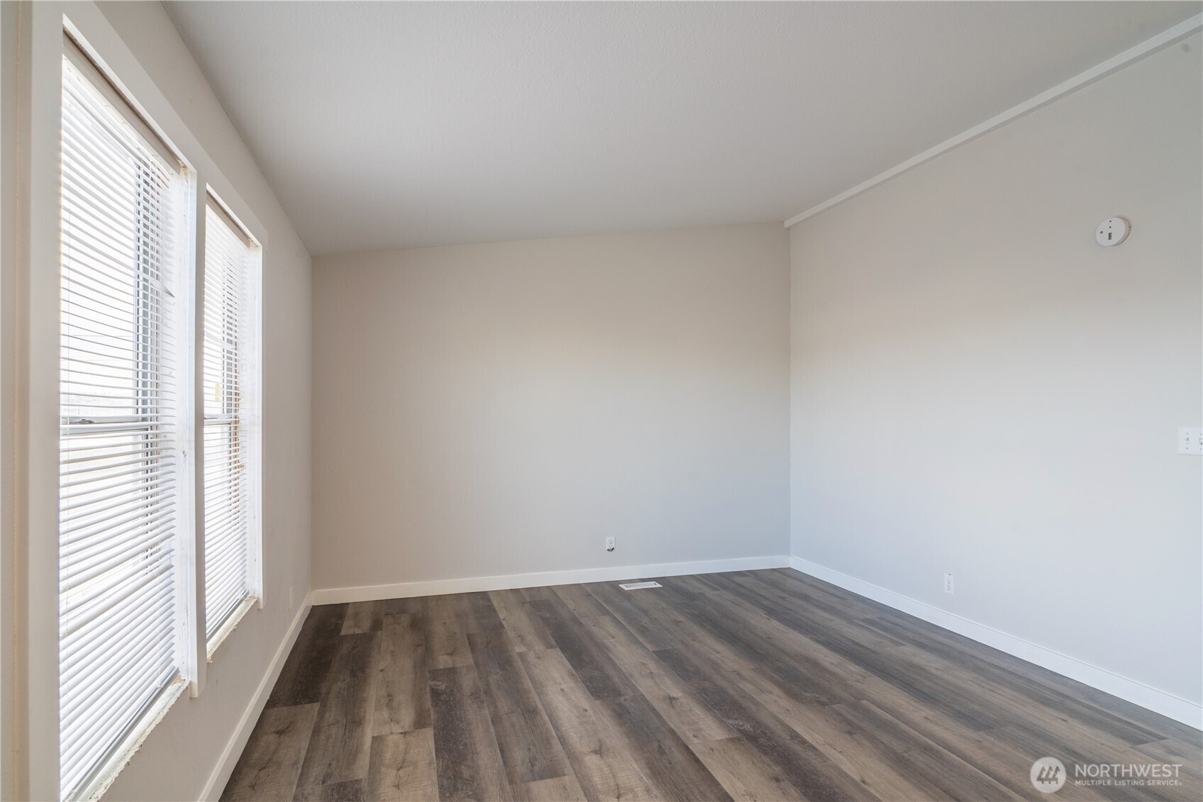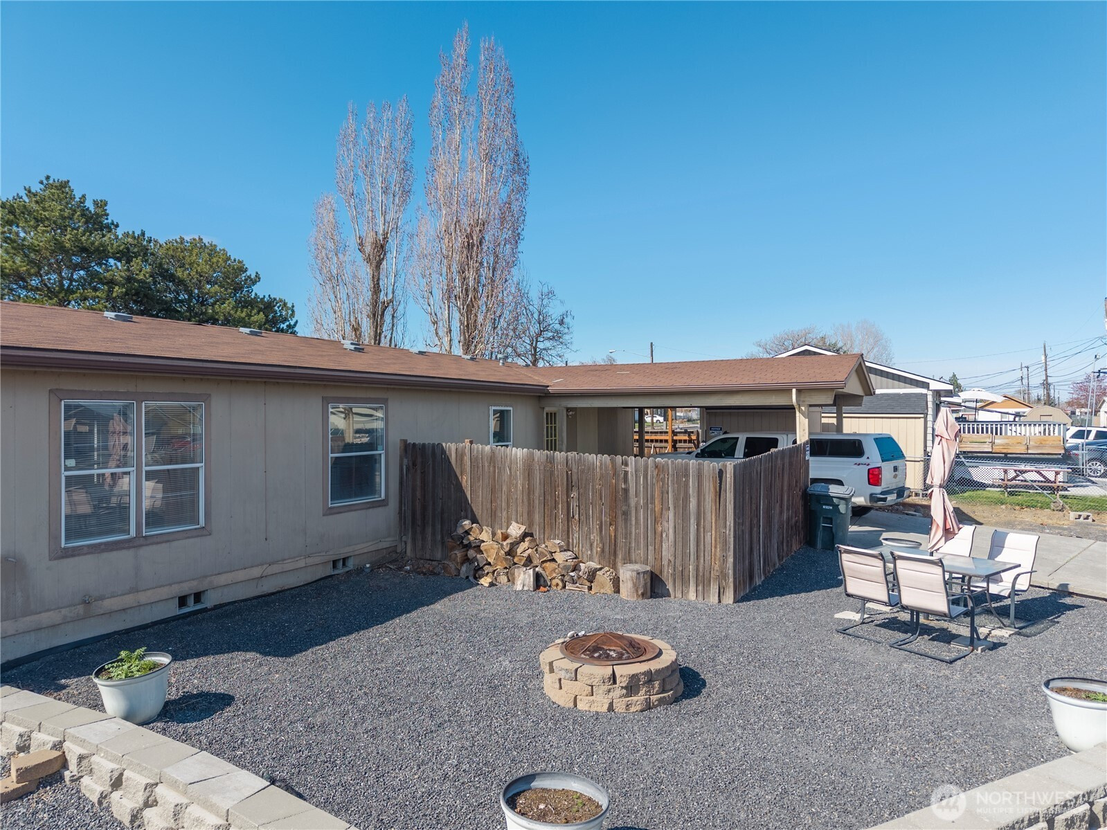 Tucked onto a quiet corner lot on Moses Lake's sought-after Guffin-Eccles, this 3-bedroom, 2-bath home pairs a fresh, modern feel with an unbeatable location. Steps from the water and walkable to downtown shops, with Moses Lake High and Frontier Middle in-district. Inside, luxury vinyl plank flooring and fresh paint run throughout an open, light-filled floor plan. The spacious living room flows into a dining area and open kitchen featuring a center island, breakfast bar, abundant cabinetry, and vaulted ceilings that keep things bright and airy. Thoughtfully split for privacy, the primary suite offers a walk-in closet and spa-style en-suite with dual vanities and a soaking tub. Two additional bedrooms and a full bath sit on the opposite side - ideal for guests, a home office, or hobbies. A dedicated laundry room with modern washer and dryer, freezer, and extra storage adds everyday ease. Outside, enjoy a partially fenced area perfect for a hot tub, decorative pavers framing a welcoming gravel patio for evening gatherings, peek-a-boo lake views, and two storage sheds. This manufactured home is on a sturdy concrete block foundation. A covered carport plus ample off-street parking complete the package. Central A/C, electric forced-air heat, updated flooring, and fresh paint - all at an approachable price point. Schedule your showing today.