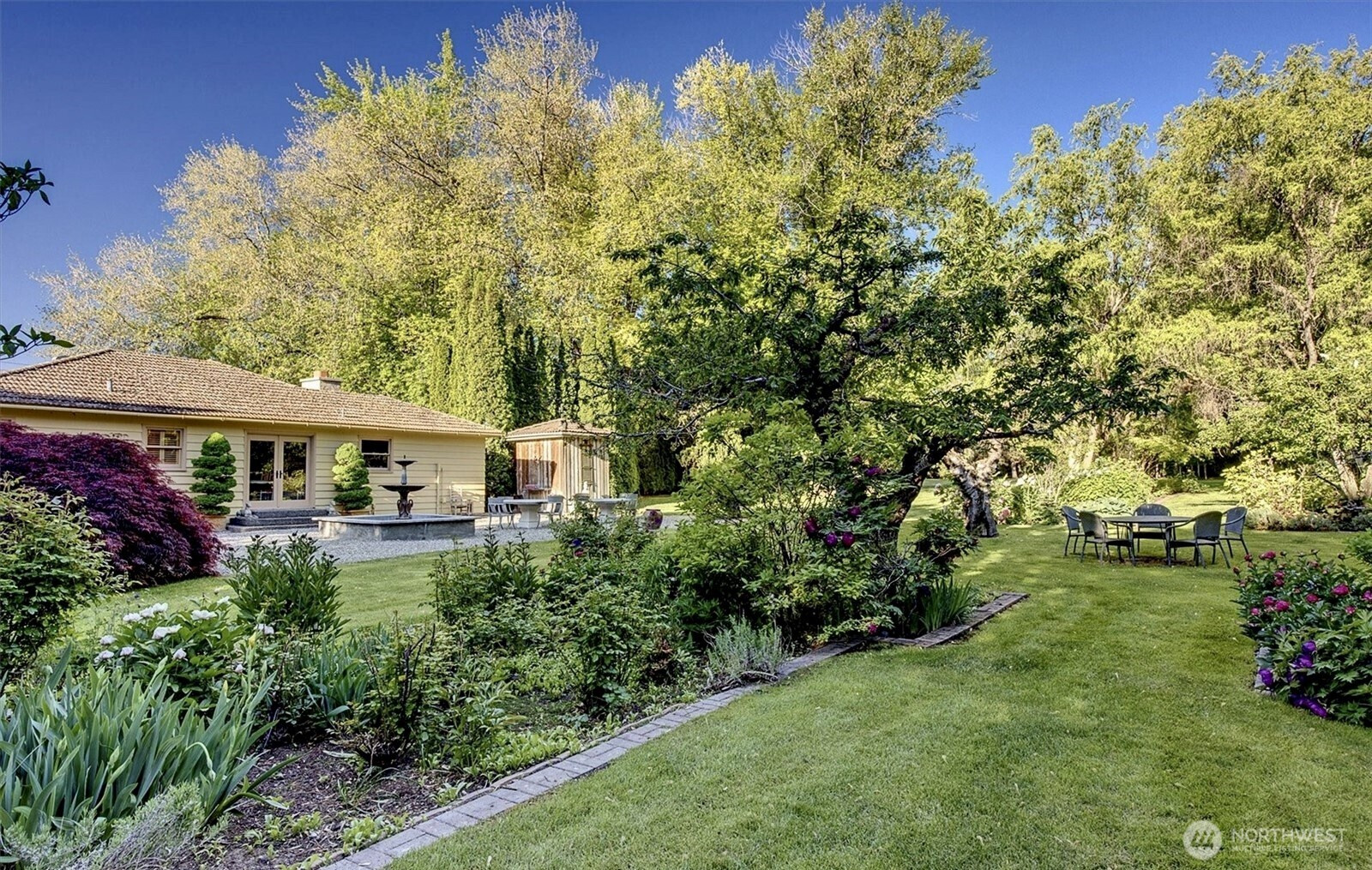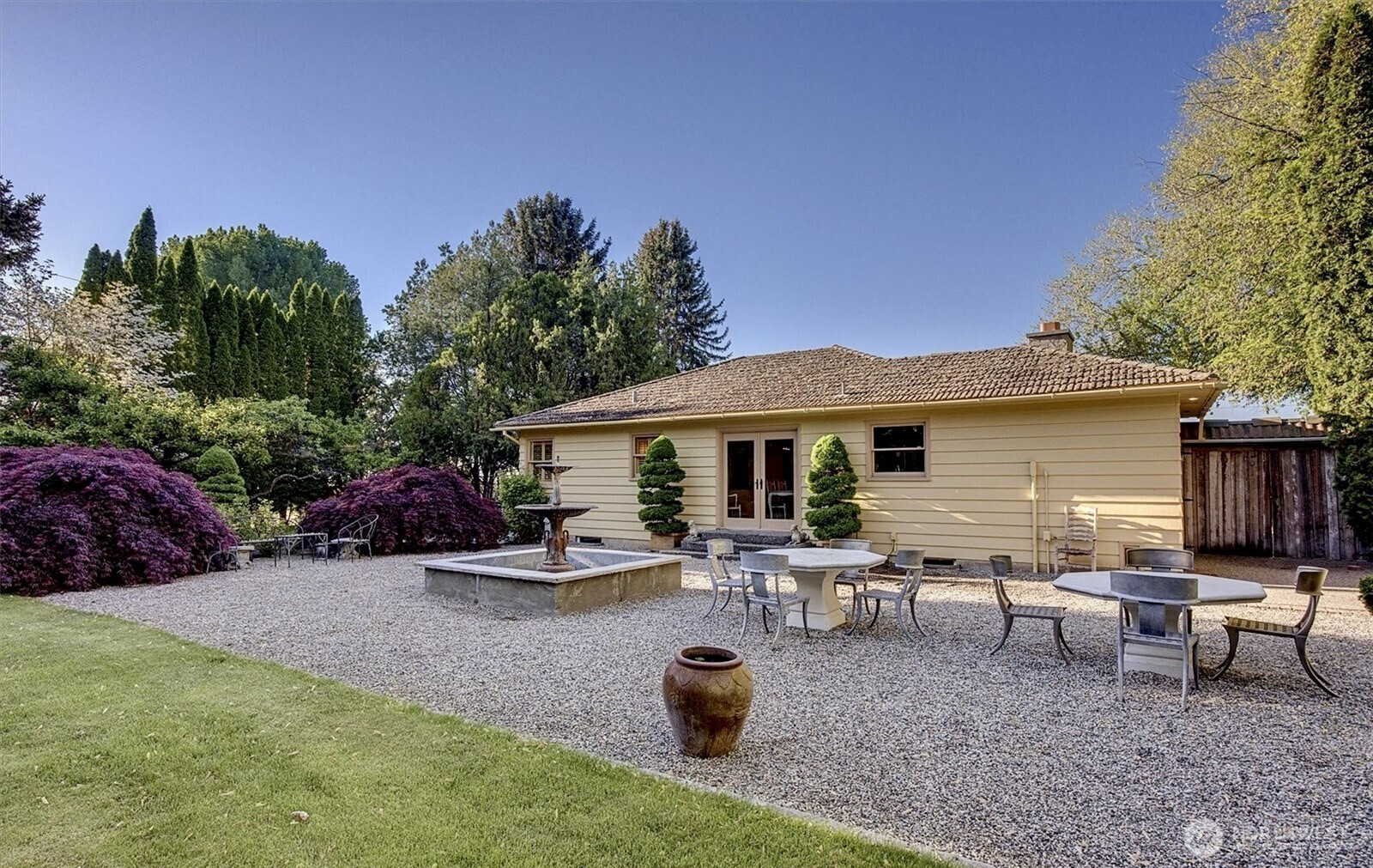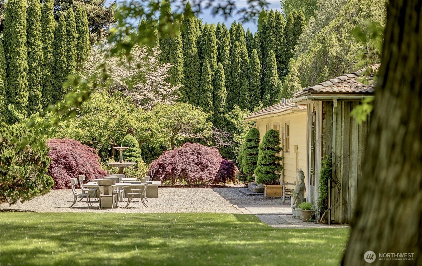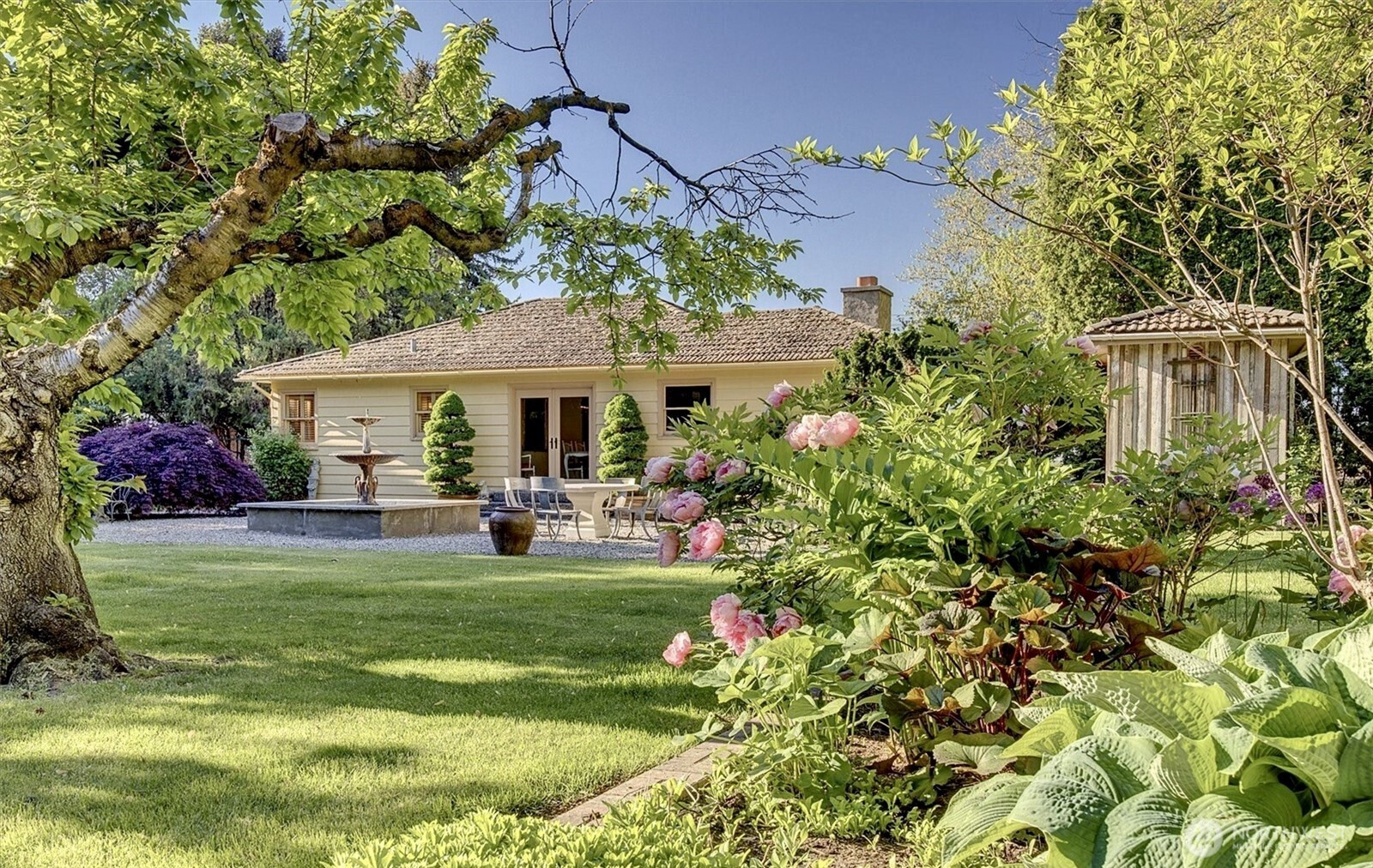 Set on an additional 1.8 acres and bordered by established plantings, the Fountain Villa offers a sense of space and privacy. The four-bedroom, two-bath home blends European charm with thoughtful updates. A generous kitchen, anchored by a six-burner gas range and French butcher block, opens to both formal and informal living areas. A centering fireplace with side lounging space for fireside reading makes this a special and cozy retreat during the winter months. French doors lead to a rear patio, where a central fountain and elegant landscaping create a quiet focal point. With two bedrooms on the main level and two below, the home allows for flexibility in living arrangements while maintaining a cohesive flow. The grounds are enclosed and framed by tall arborvitae, enhancing the sense of seclusion.