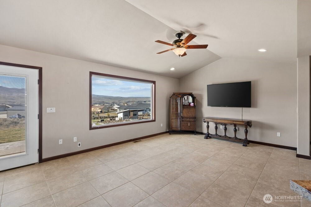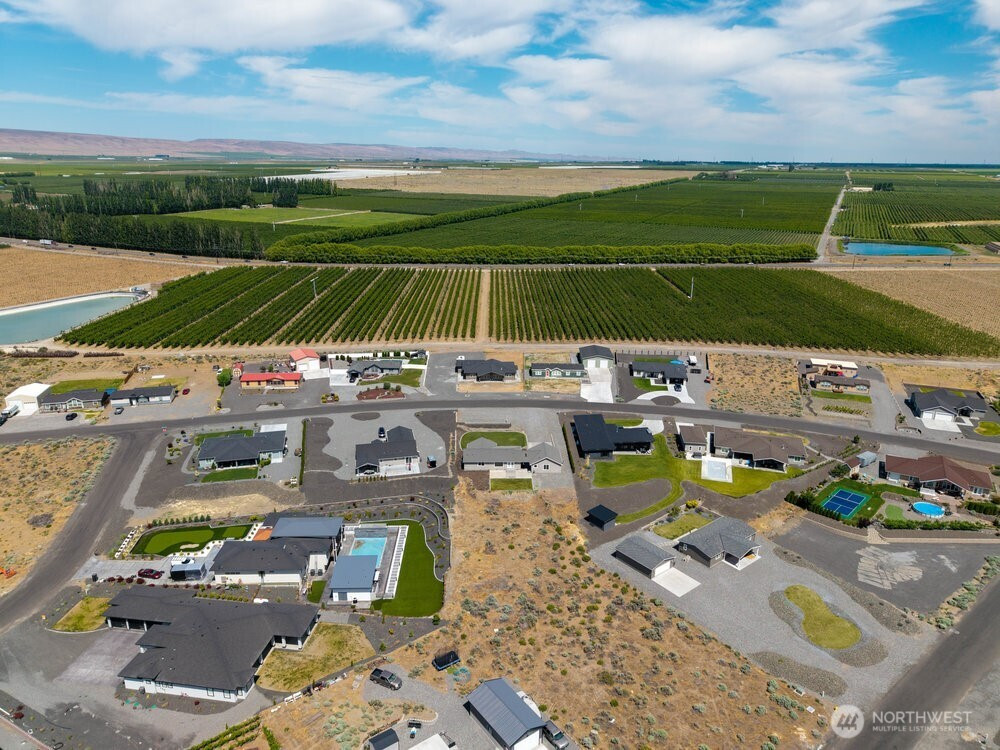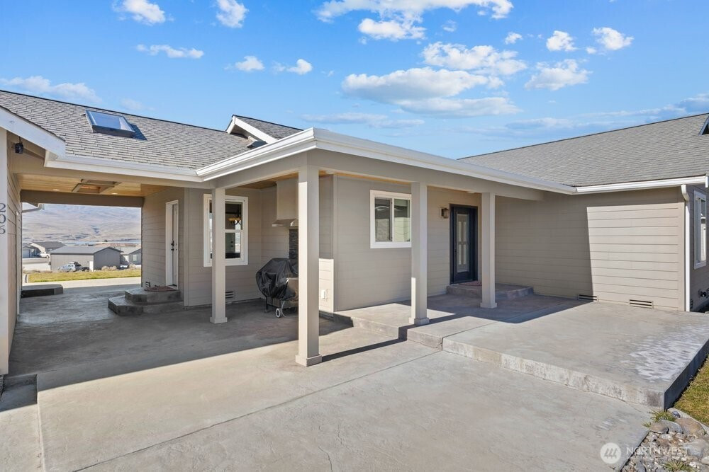 Bask in breathtaking Columbia River views from the air-conditioned comfort of this stunning Desert Aire rambler, set on an expansive 30,000+ sq ft lot with room to expand. The terraced front lawn welcomes you to a covered front porch featuring a beautiful tongue-and-groove ceiling detail. An oversized picture window fills the living room with natural light, while French doors open to a patio featuring a breezeway, skylights, and a built-in grilling station—perfect for entertaining. Vaulted ceilings and a great-room style layout offer flexible living and dining options. The kitchen features granite tile countertops, an island with an eating bar, and abundant storage. The primary suite includes vaulted ceilings, a ¾ en-suite bath, and a walk-in closet with built-in shelving. The full bath offers a tile-surround shower and spacious vanity for additional storage. A covered breezeway leads to the fully finished two-car garage, which includes a half bath, epoxy floors, and extensive built-ins. The property also offers RV parking with hookups and large gravel parking areas beside and behind the home. Desert Aire community amenities include golf, a swimming pool, airstrip, walking trails, and more offering a lifestyle as impressive as the view.