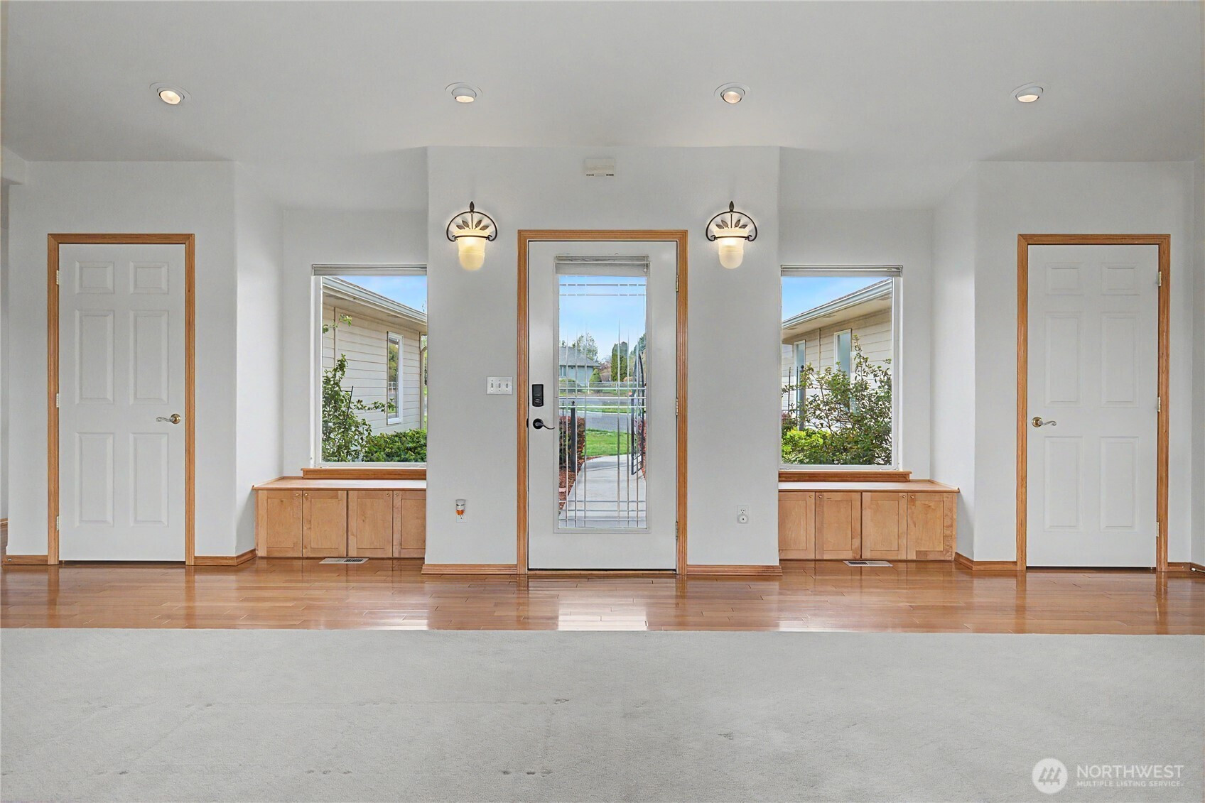 Experience refined lakefront living with this 2,300 sq ft single-story residence situated on a one-acre, low bank lot. Thoughtfully designed to maximize waterfront views, the U-shaped home features a welcoming courtyard entry leading into a living room with vaulted ceilings and an expansive wall of windows. Elegant hardwood flooring connects both wings of the house. The left side offers a spacious kitchen with a large island, open to a lake-facing dining area and direct access to the wraparound deck. Additional conveniences include a pantry, laundry, and powder room. The right side comprises three bedrooms, among them a lakefront ensuite, as well as a full guest bath. The property is located at the end of a cul-de-sac and includes a circular driveway, RV parking, and a three-car garage. The level lot provides ample space for gardens and outdoor recreation. Waterfront amenities include a private dock and powered boat lift. The interior has been freshly painted, and the home is move-in ready. Come live life on the lake!