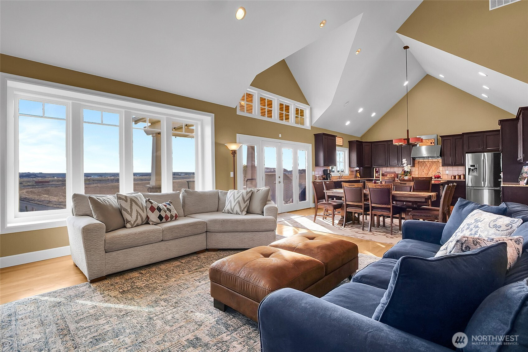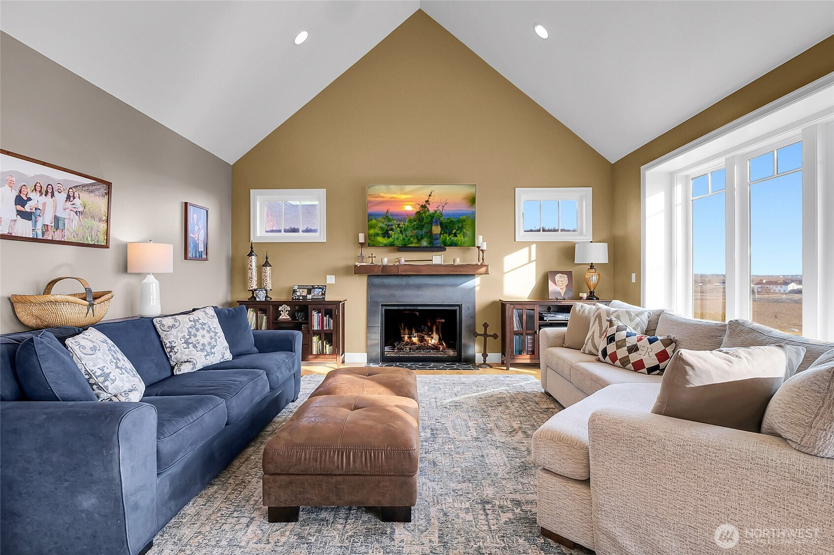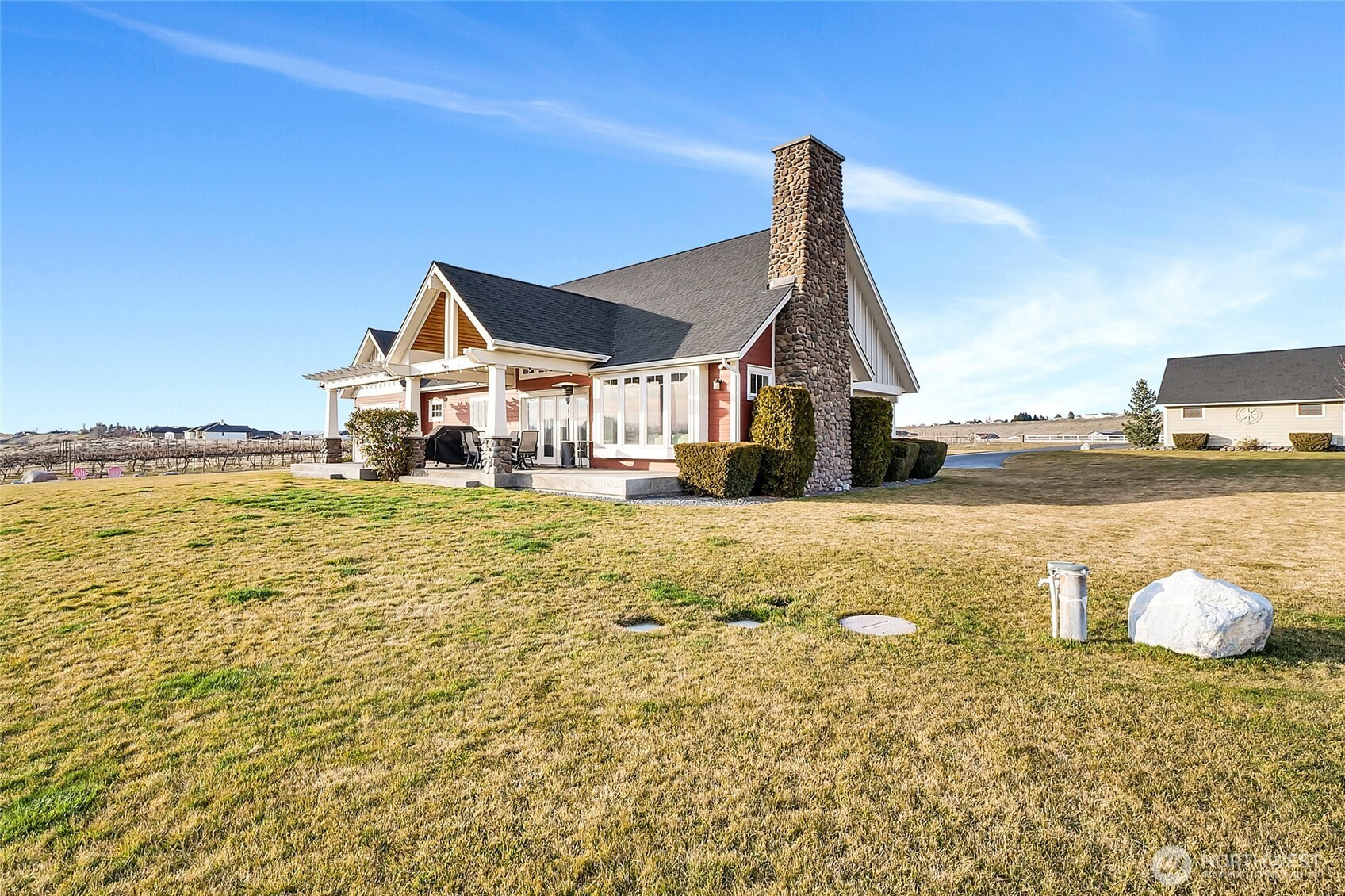 Set on 1.4 acres, this exceptional, immaculate 3,494 sq ft Cayuse home with 4 bedrooms (2 primary bedrooms on the main) captures sweeping views of the lake, farmland, and distant mountain ranges, surrounded by your own private 2.5-acre micro-vineyard producing award-winning wine grapes. A graceful arched entry, 40-year composite roof w/metal over dormers, and locally sourced stone form columns that create a striking first impression when you walk up to the front door. Inside the home, the Great Room showcases soaring vaulted ceilings, rich hardwood floors, a metal-surround fireplace w/stone chimney, & a wall of windows w/window seating that frames the scenery overlooking McConihe Flats, abundant storage spaces, and a second living area with a bonus/family room, and 2 bedrooms on the second floor provide flexible living spaces. Custom walk-in closets throughout. A den/office greets you at the main entry.The chef’s kitchen is designed for both beauty and function, featuring granite countertops, an expansive island, a Wolf cooktop, and GE Monogram appliances, all complemented by architectural doors and trim throughout. 2 furnaces, 3 connections to well (yard, vineyard, shop). The oversized garage is paired with a 30' x 24' finished shop—with room for a home office, and extra pulley-system storage in the garage. Outdoor living offers a spacious covered patio, welcoming fire pit, RV parking, room to add another shop, all expertly crafted with quality construction by Bruce Preston.