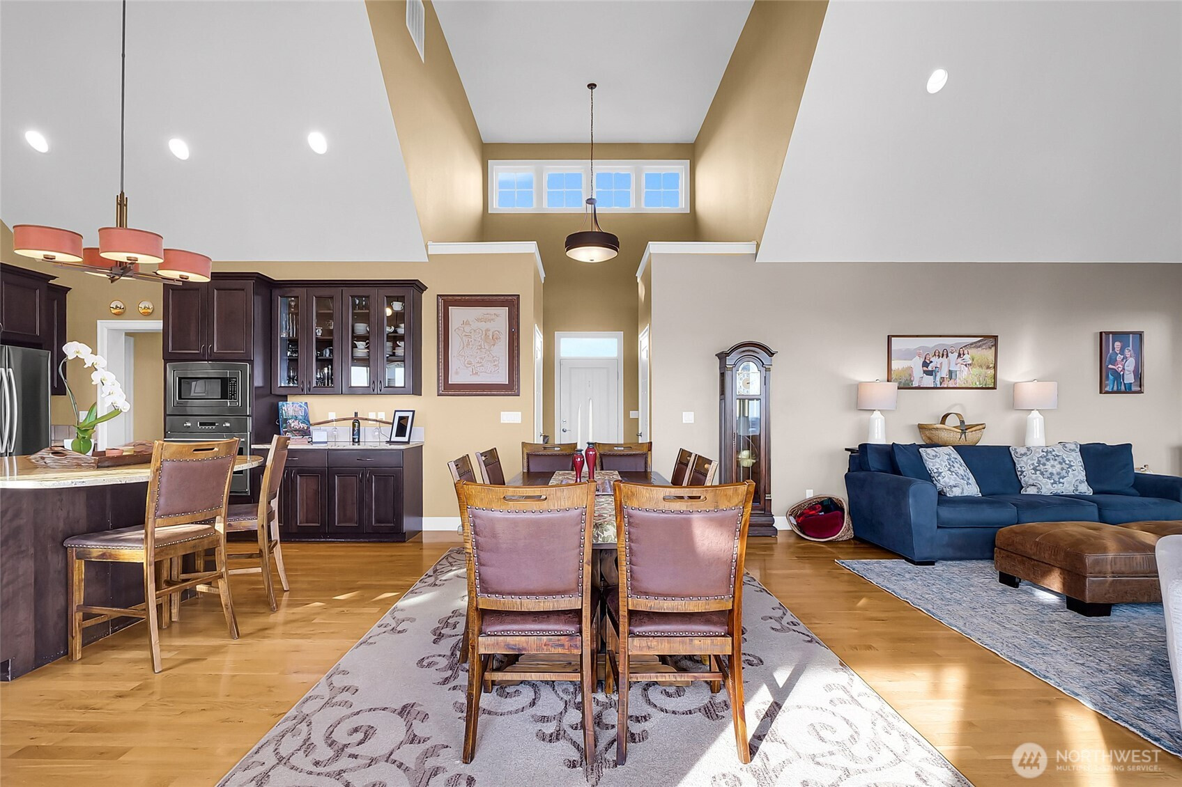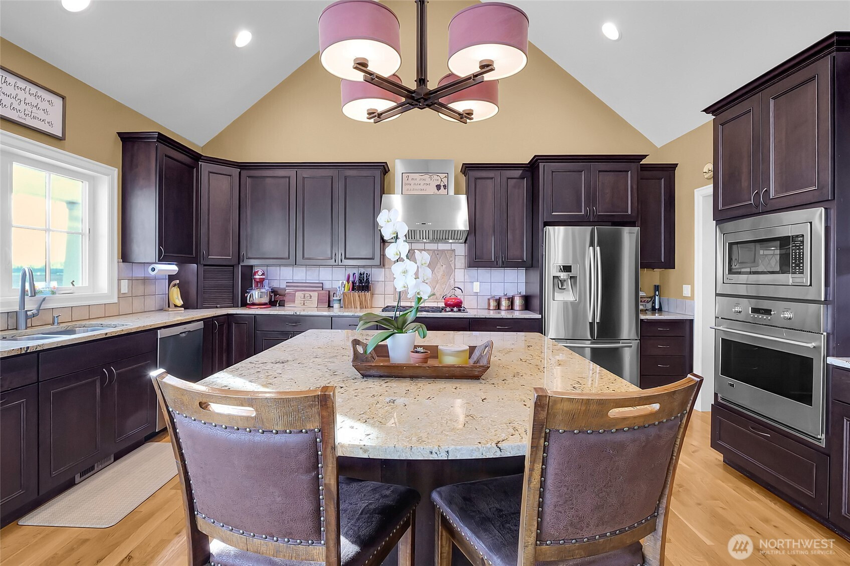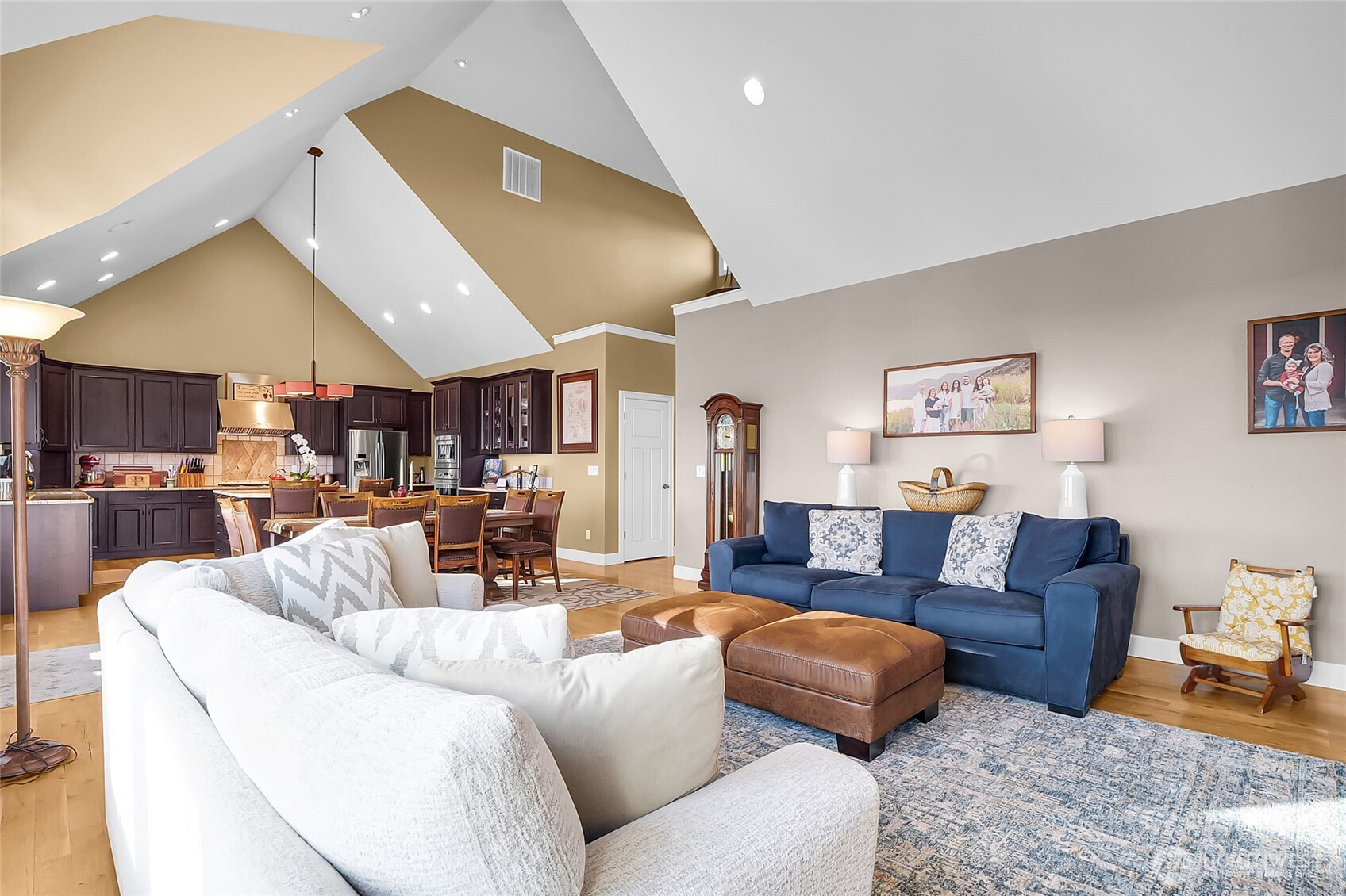 Set on 1.4 acres, this exceptional, immaculate 3,494 sq ft Cayuse home with 4 bedrooms (2 primary bedrooms on the main) captures sweeping views of the lake, farmland, and distant mountain ranges, surrounded by your own private 2.5-acre micro-vineyard producing award-winning wine grapes. A graceful arched entry, 40-year composite roof w/metal over dormers, and locally sourced stone form columns that create a striking first impression when you walk up to the front door. Inside the home, the Great Room showcases soaring vaulted ceilings, rich hardwood floors, a metal-surround fireplace w/stone chimney, & a wall of windows w/window seating that frames the scenery overlooking McConihe Flats, abundant storage spaces, and a second living area with a bonus/family room, and 2 bedrooms on the second floor provide flexible living spaces. Custom walk-in closets throughout. A den/office greets you at the main entry.The chef’s kitchen is designed for both beauty and function, featuring granite countertops, an expansive island, a Wolf cooktop, and GE Monogram appliances, all complemented by architectural doors and trim throughout. 2 furnaces, 3 connections to well (yard, vineyard, shop). The oversized garage is paired with a 30' x 24' finished shop—with room for a home office, and extra pulley-system storage in the garage. Outdoor living offers a spacious covered patio, welcoming fire pit, RV parking, room to add another shop, all expertly crafted with quality construction by Bruce Preston.