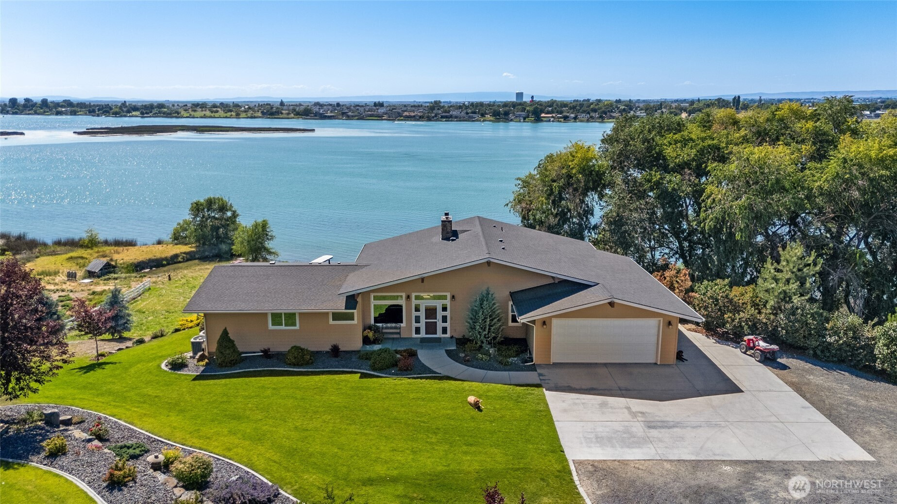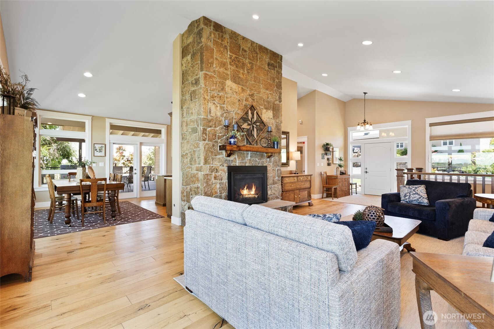 Attention to detail shines throughout this remarkable, beautifully landscaped lakefront estate. Thoughtfully designed and fully remodeled, this 4-bedroom, 3-bath home offers 3,852 sq. ft. of refined living space on 3.67 peaceful acres. Interior features include high-end custom oak cabinetry, striking tile work, craftsman-style trim, a beautifully handcrafted staircase, and a stunning floor-to-ceiling stone fireplace that serves as a true centerpiece of the home. Enjoy breathtaking views from the expansive covered deck—perfect for watching bald eagles soar, taking in unforgettable sunsets, and admiring the magnificence of Mt. Rainier. With approximately 295 feet of lake frontage, the property includes a composite dock for easy access to boating, fishing, and other water activities. Outside, the land offers incredible versatility with open pasture space ideal for livestock or hobby farming, along with a large 2,400 sq. ft. shop and an additional 1,200 sq. ft. outbuilding, providing ample room for storage, equipment, or creative pursuits. This one-of-a-kind lakefront retreat seamlessly blends craftsmanship, functionality, and natural beauty—offering privacy, recreation, and endless possibilities in a truly serene setting.