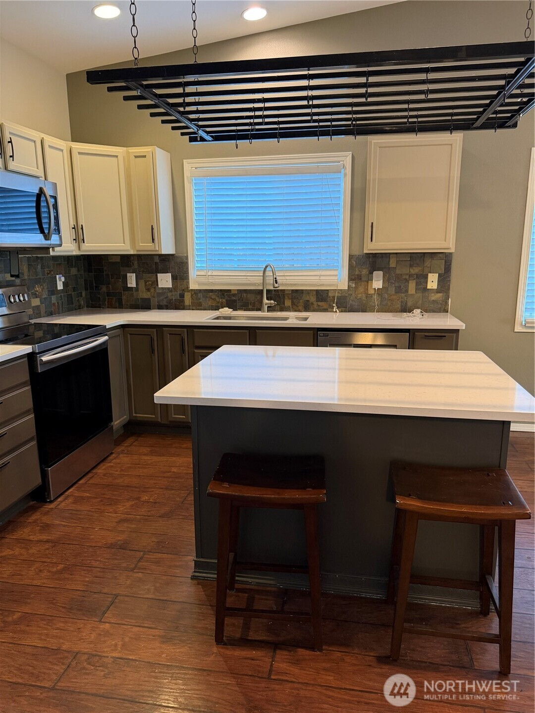 Well loved home with tons of upgrades throughout. Laminate hardwoods throughout. Upgrades done in 2023; new counter tops, ALL cabinets refinised, painted & new hardware. New Maytag Dishwasher, Painted with Sherwin Williams Super paint, designer color pallet, new sink & faucet. new slate tile backsplash. New roof on back patio. Two concrete pads in back for shed and hot tub (wired). Plenty of privacy with high privacy fencing. 2 garden boxes, fruit trees. Two new shower heads. Primary bedroom with large walk in closet. Entire interior painted and garage finished in 2023. Gutters added in front in 2025. Front wheeping willow professionally trimmed in 2023. This beautiful home will not last long, don't. wait to look! Washer & dryer in laundry room stay. Fridge stays. Sprinklers on timer.