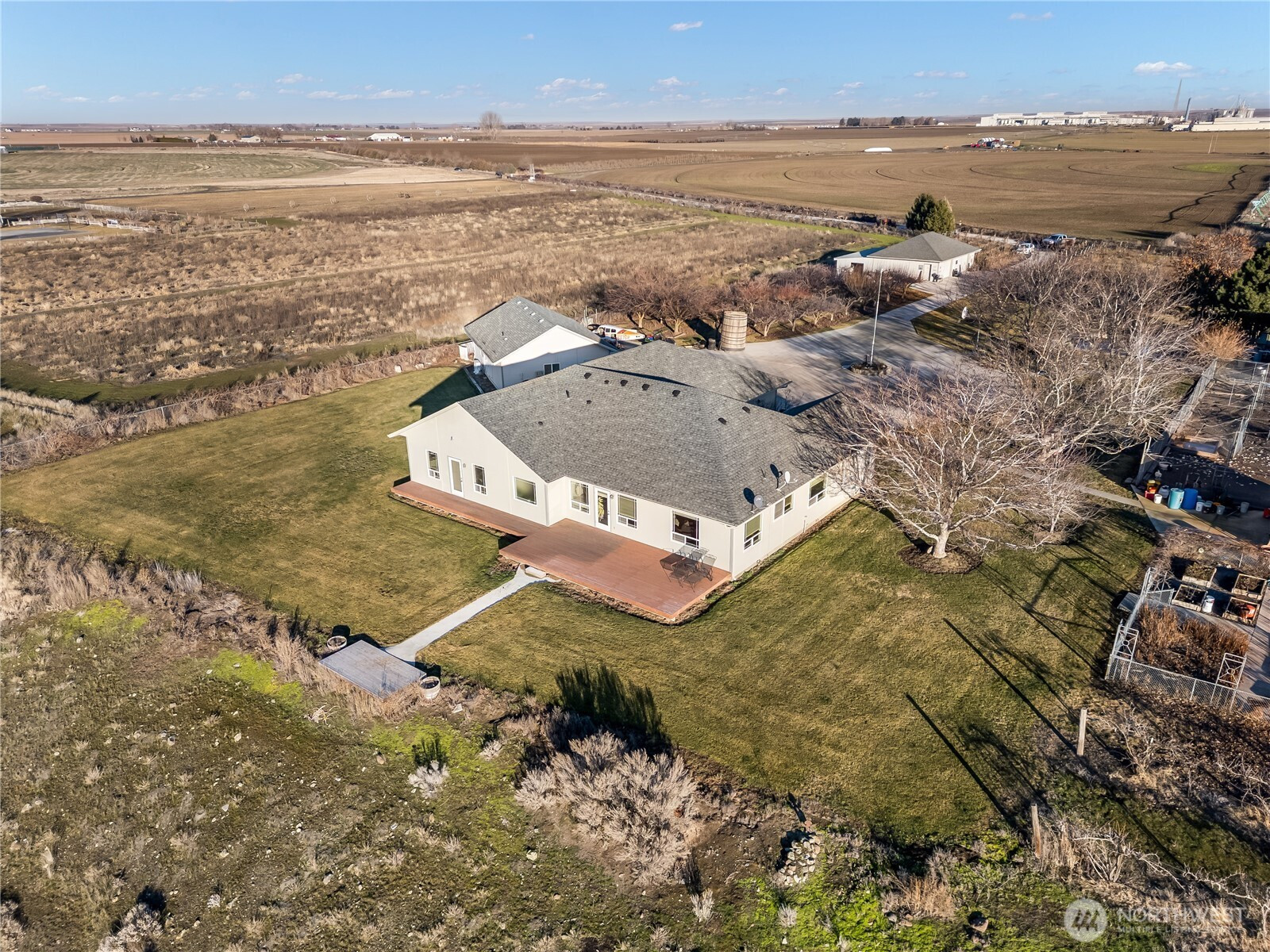 Discover unparalleled serenity and luxury at this exquisite 3-bedroom, 3-bathroom vineyard estate, sprawling across over 11+ acres in Moses Lake. As you approach, a winding drive leads you to your private sanctuary, boasting sweeping, panoramic views that provide a breathtaking backdrop from every angle. Step inside to a home designed for sophisticated living. Each of the three spacious bedrooms offers its own ensuite bathroom, providing ultimate privacy and comfort for guests. Enjoy year-round outdoor living on the deck with ample seating for soaking in the spectacular sunsets. A significant highlight of this property is the detached garage, which includes a one bedroom living quarters—perfect for a tasting room, home office, or private guest suite for visitors.The expansive grounds are a true delight, offering manicured vines, space for outdoor recreation, and quiet corners to unwind. This property isn't just a home; it's a lifestyle, offering a rare opportunity to own a piece of wine country paradise with incredible views and serene privacy.