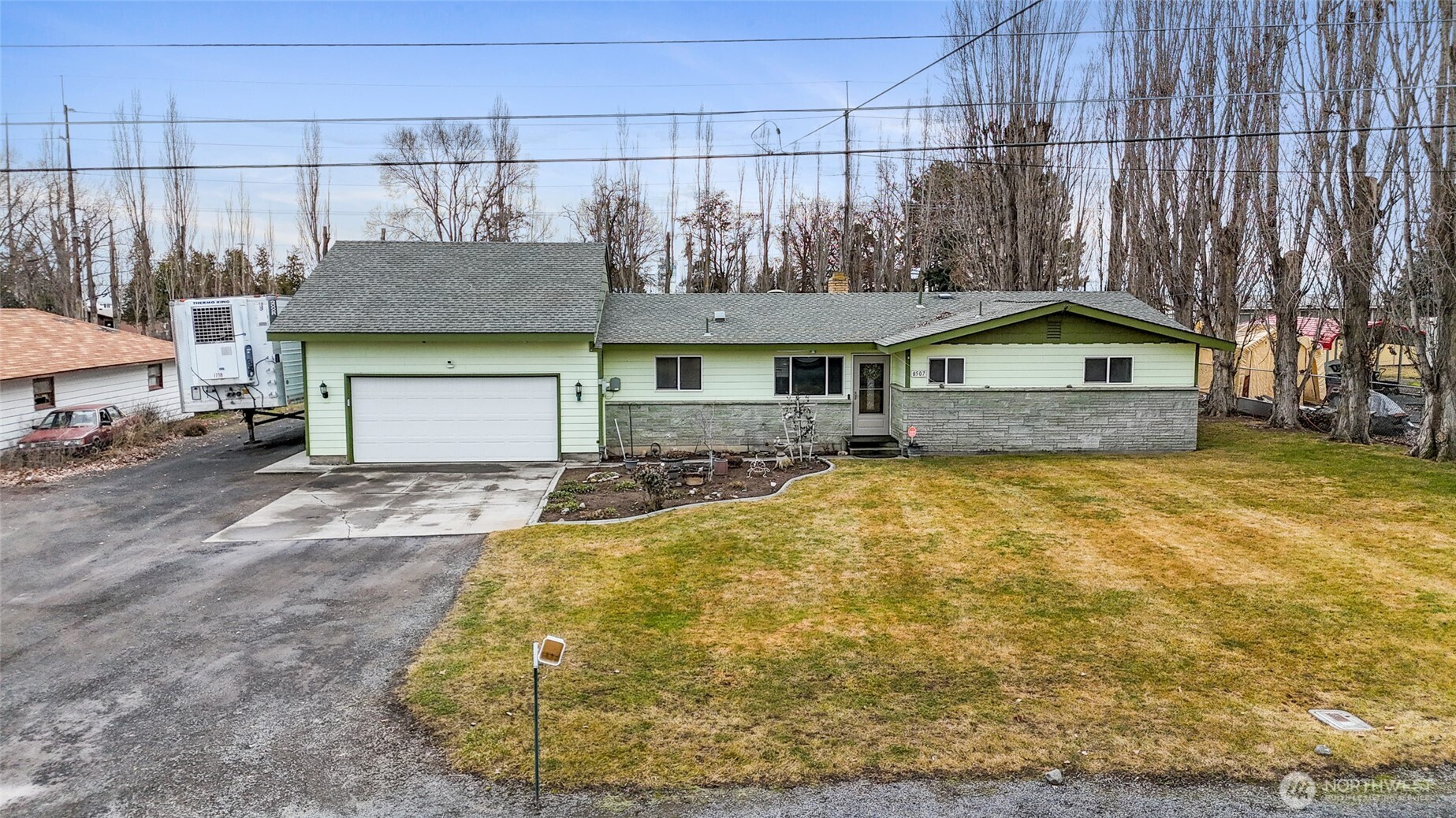 Versatile property featuring a spacious main home, ADU, and powered shop on a large, maturely landscaped lot. Main home offers engineered hardwoods, inviting entry with dining area, bright kitchen with granite counters, tile backsplash, stainless appliances, and laundry with storage and included washer/dryer. Cozy living room features a wood-burning fireplace with stone surround. Two bedrooms share a tiled hall bath, while the primary suite includes dual closets with built-ins and a soaking tub. Enjoy ample parking with wide driveway and finished 2-car garage with storage, plus a large concrete patio and fire pit area for outdoor entertaining. ADU includes full kitchen, dining area, living room, mini split, tiled bath with laundry, and spacious bedroom. Separate shop is wired with power, plumbed for future bath, and includes loft storage—ideal for multi-gen living, rental income, or workspace. Grant County Fairgrounds directly behind hosts frequent events year-round, creating excellent potential for short-term or event-related rental opportunities.