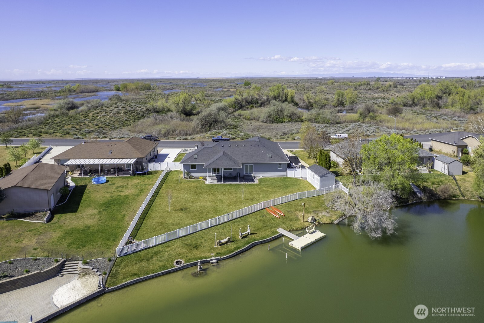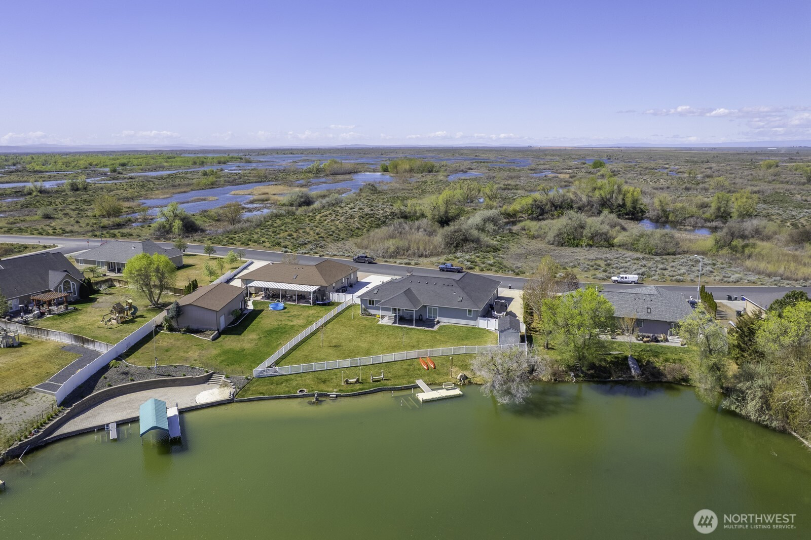 Welcome to Westlake Shores! This beautifully appointed 4 bed, 2.75 bath rambler offers over 130’ of low-bank waterfront, ideal for kayaking, canoeing & paddle boarding. Enjoy easy boat access to the main body of Moses Lake for jet skiing, water skiing & fishing from your private dock w/boat lift. Quality built with formal entry & covered front porch, this spacious home features beautiful hardwood floors, an inviting living room w/fireplace, and a gourmet kitchen with stainless steel appliances. Spacious primary suite offers a walk-in closet, dual sinks, tiled walk-in shower, and jetted tub. Thoughtful single-level layout provides comfortable living and great flow for entertaining. Enjoy the fenced backyard w/patio, plus neighborhood community park. Oversized 3-car garage and additional boat/RV parking complete this exceptional waterfront property.