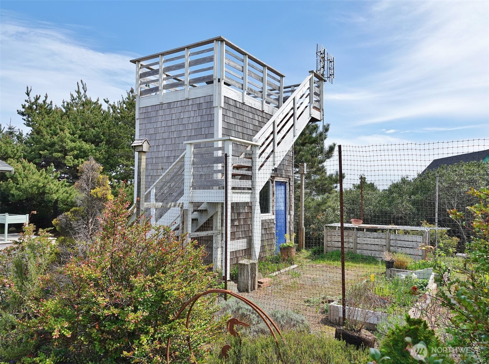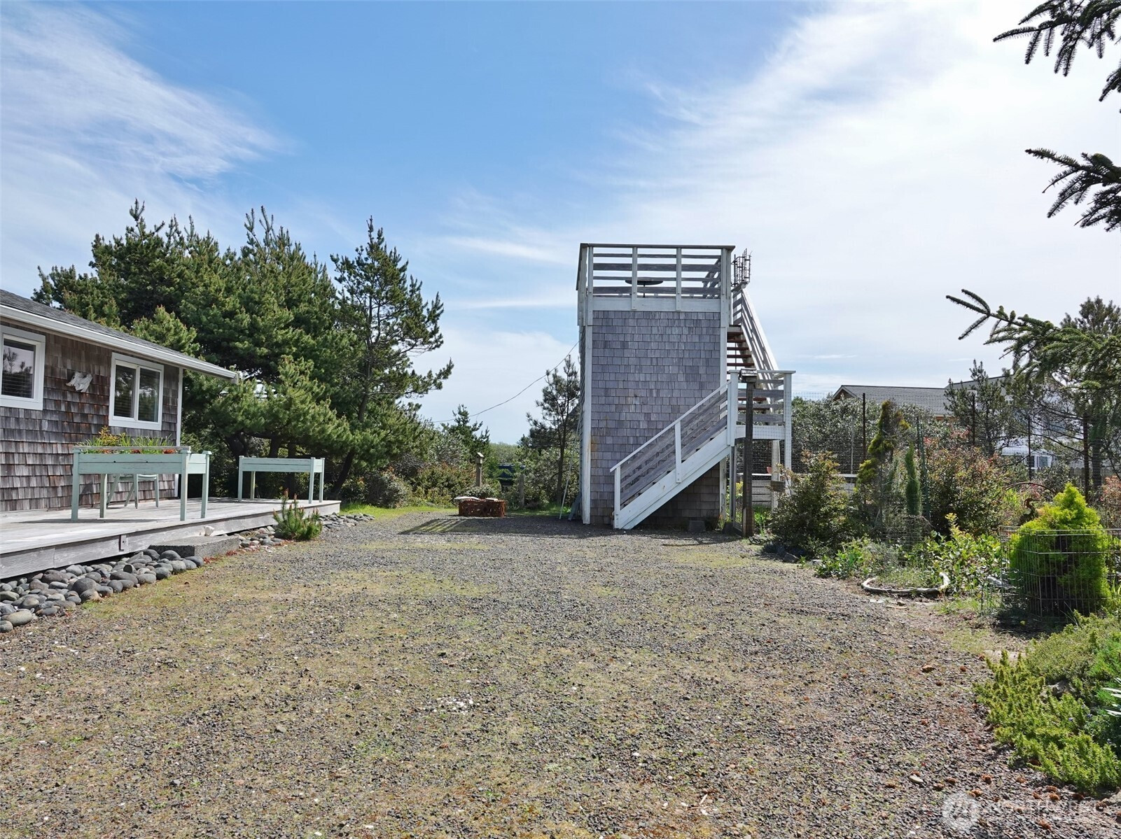 DESIGNER STYLE featured in this cute home near the BEACH with 2 LOTS! Enter into this home with the unique vaulted wood ceilings and beams giving this home a designer touch of style. Parquet flooring in this Open Great Room design with wood-burning Fireplace. Kitchen with an Eating Bar and Granite tile counters. 2 nicely-sized Bedrooms, and a Full Bathroom with a washer and dryer. Enjoy the outside on the huge side Deck and Covered Front Deck. Lots of privacy provided by the natural landscaping surrounding this home and corner property. Approx. 120 sq.ft. Shed with very high ceilings and a Viewing Tower on top, which does offer some distant Ocean Views. Fenced Garden Area. BONUS: Spread out with the extra land space with the lot next door (1057 Crestshire Lp) included in the sale, giving this property approx. 15,800 sq.ft. of land.