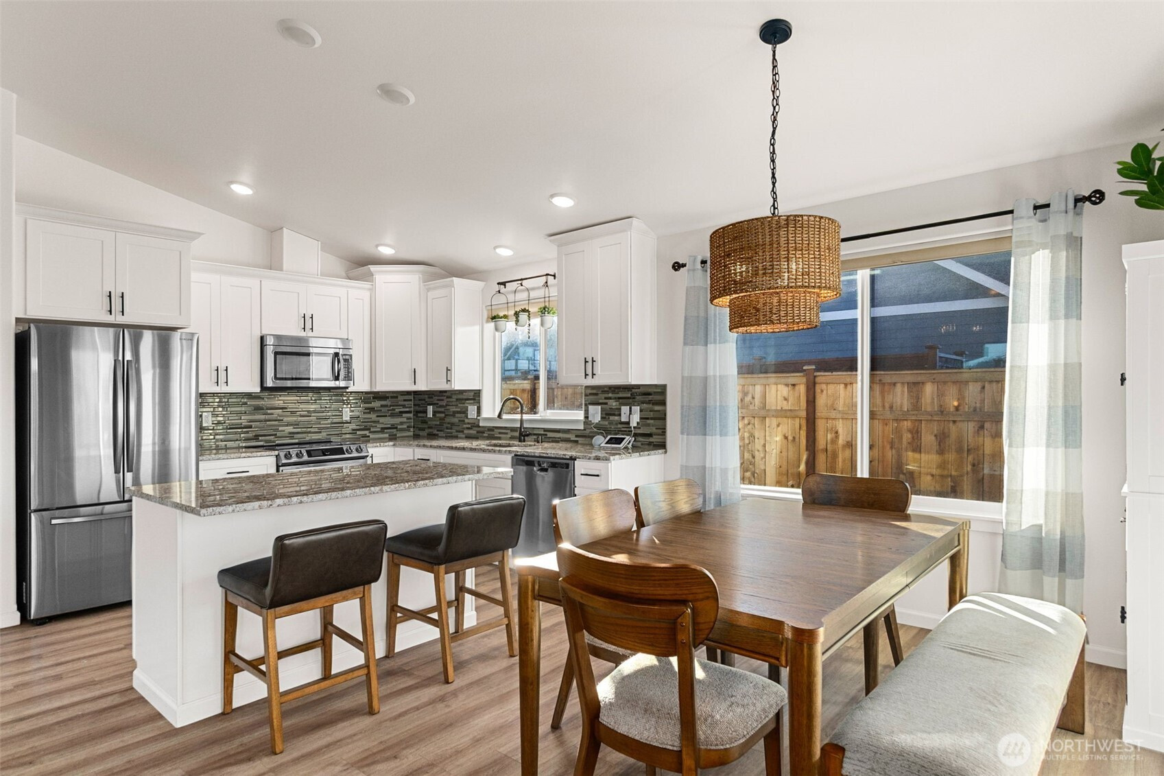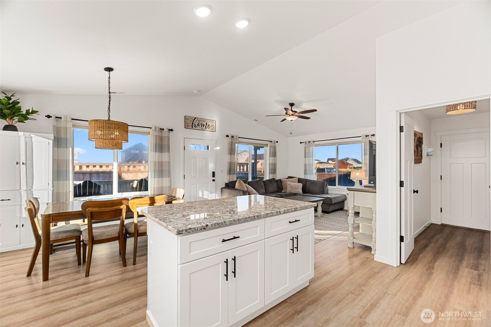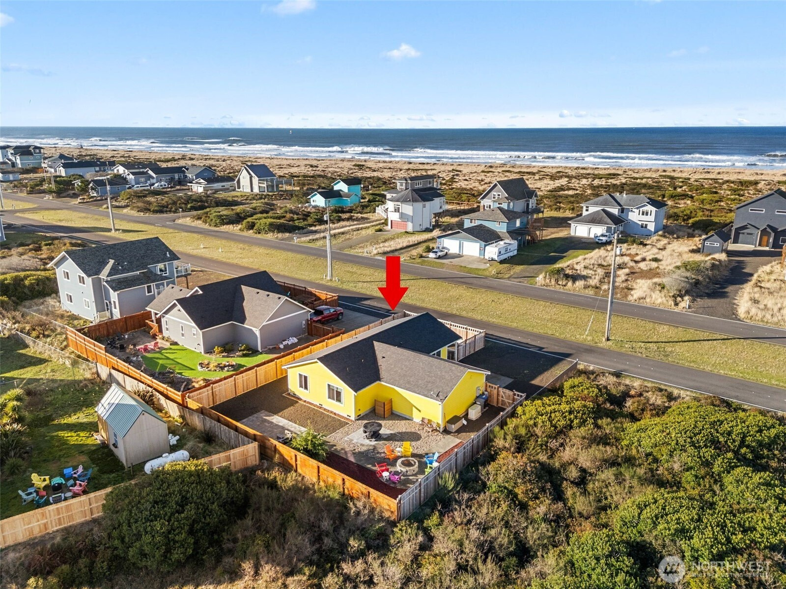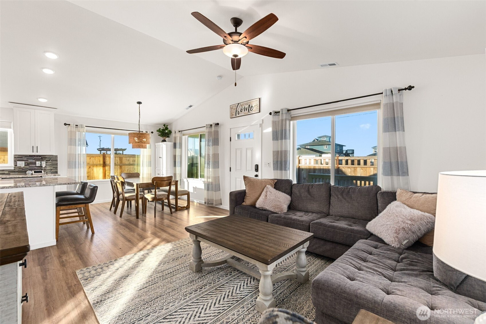 Built in 2021 and just minutes from the beach, this like-new home checks all the boxes. With approx. 1,200 sq ft, 3 bedrooms, and 2 baths, the single-level layout is open, airy, and functional with vaulted ceilings throughout the main living space. The kitchen features granite countertops, custom back splash, stainless appliances, and an undermount sink, opening seamlessly to the dining area. The primary bedroom offers a private en-suite, walk-in closet, and peaceful views of the landscaped backyard. Outside, enjoy stunning, custom low-maintenance front and back yard landscaping with a firepit made for year-round gatherings, plus a covered deck and fully fenced yard. Heat pump heating and cooling and a 2-car attached garage make this home truly turnkey. Driveway has room for a motor home and/or travel trailer. All appliances including washer & dryer stays with home.