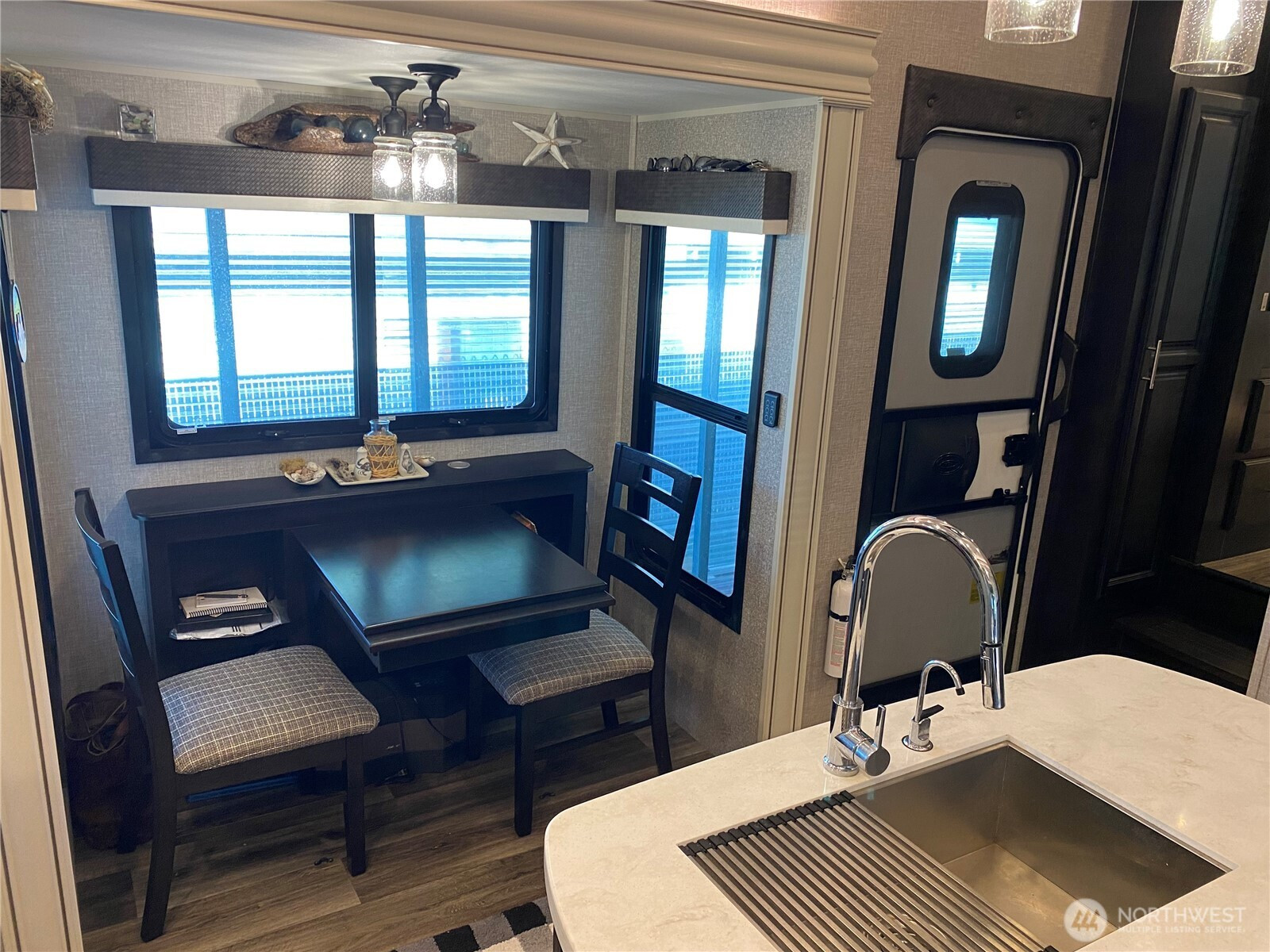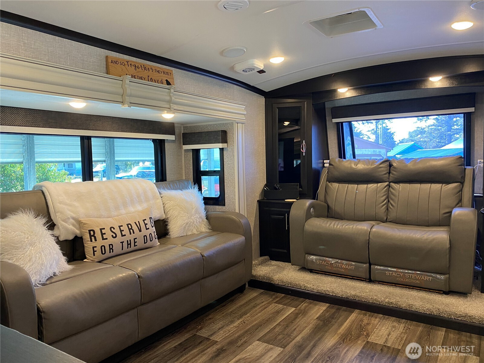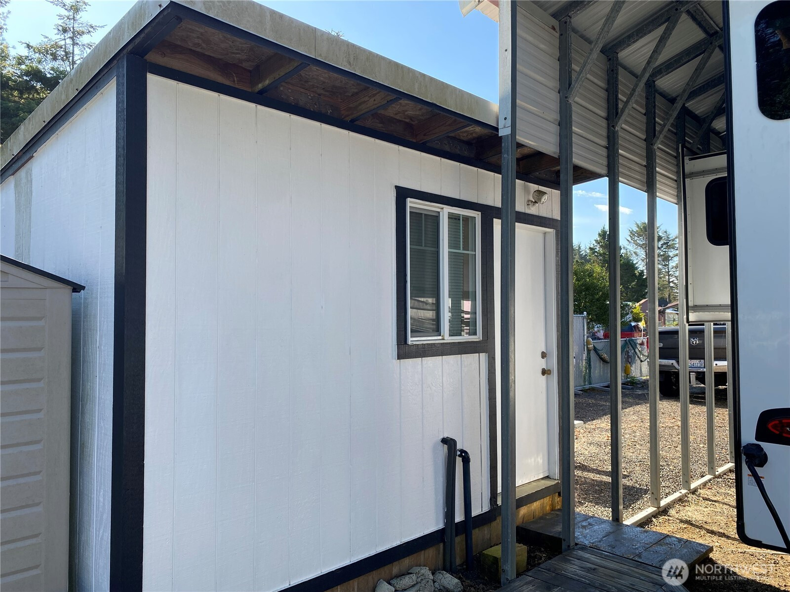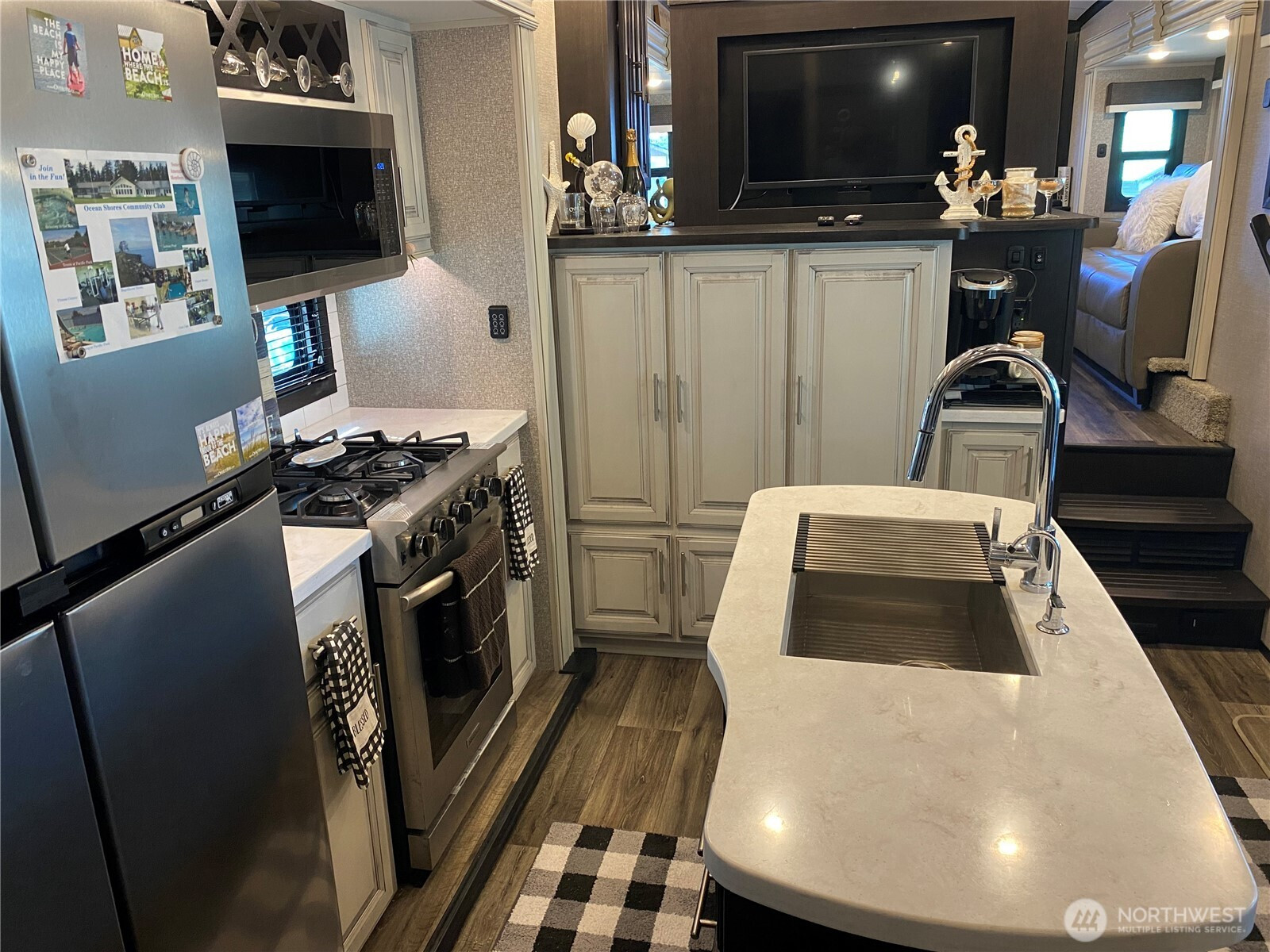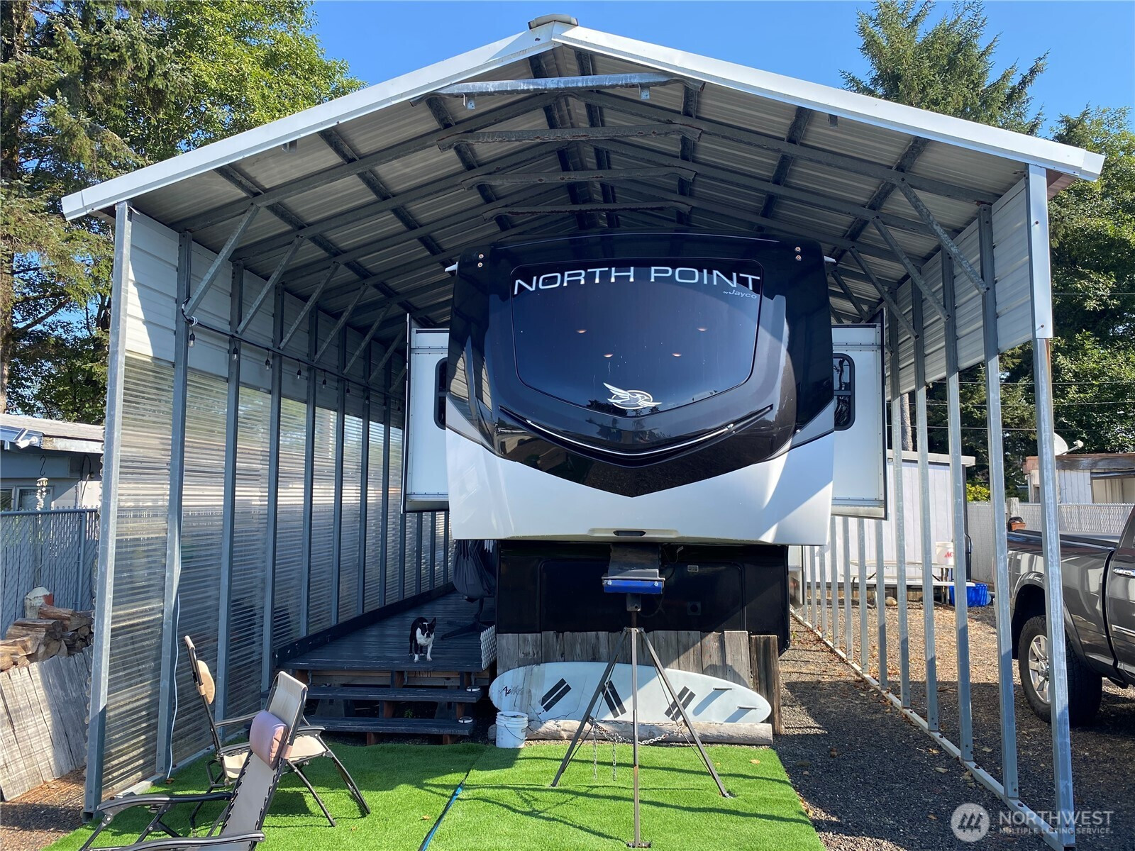 This property is located in the coveted Division 12 of Ocean Shores, where year-round RV camping is allowed. This property is a snow bird's dream as it includes a 45', 490 SF stunning, fully-loaded 2022 Jayco fifth-wheel trailer ready to move into. Includes two 15,000 BTU A/C units, vinyl flooring throughout, 1.5 bathrooms with 2 sinks in the master bathroom as well as a shower so big it includes a seat! Large roomy kitchen with an island. Handcrafted hardwood glazed doors, drawers and trim throughout. Property also includes an accessory unit with working shower, washer/dryer, sink and storage. Spacious decking on both sides all covered under large RV carport.