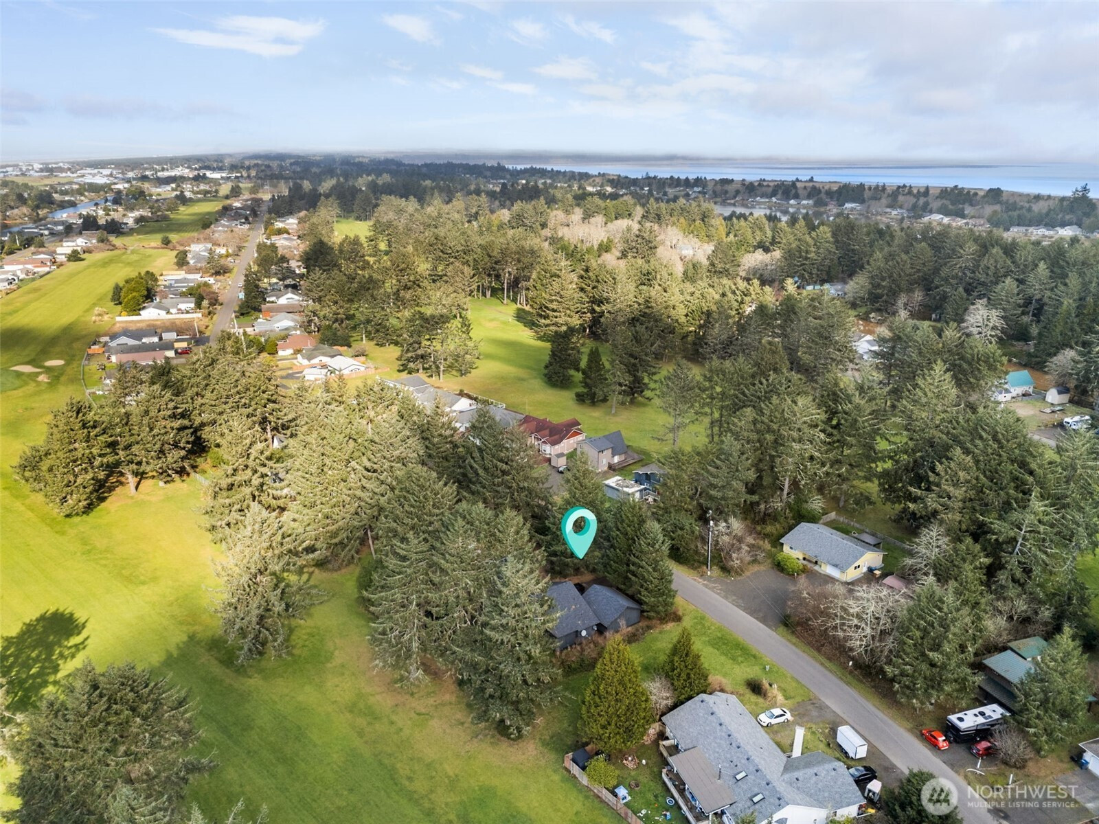 Positioned along the 4th Fairway of the Ocean Shores Golf Course, this custom-designed Lindal Cedar residence showcases the iconic post-&-beam architecture & dramatic cedar-lined ceilings the brand is known for. Expansive walls of glass flood the home with natural light & create a seamless connection between indoor living & the surrounding fairway setting. Crafted with premium Western Red Cedar, this chalet-inspired home offers both durability & timeless Northwest character. The open-concept layout provides functional flexibility, ideal for everyday living or entertaining. The main-level Primary Suite is light-filled and inviting, featuring a striking double-sided tiled fireplace, walk-in closet, & a well-appointed ensuite with jetted soaking tub & step-in shower. A guest bedroom & full bath are also located on the main floor, while a spacious loft bedroom upstairs adds additional versatility. Thoughtfully updated & meticulously maintained, this home exudes warmth, craftsmanship & architectural charm. Western exposure enhances evening light, creating a peaceful retreat just minutes from the beach in the heart of this beautiful PNW coastal community. A detached oversized two-car garage offers ample storage for beach gear & a golf cart—with direct backyard access to the fairway for effortless tee times. A rare opportunity for golfers & outdoor enthusiasts alike—this is one you won’t want to miss.