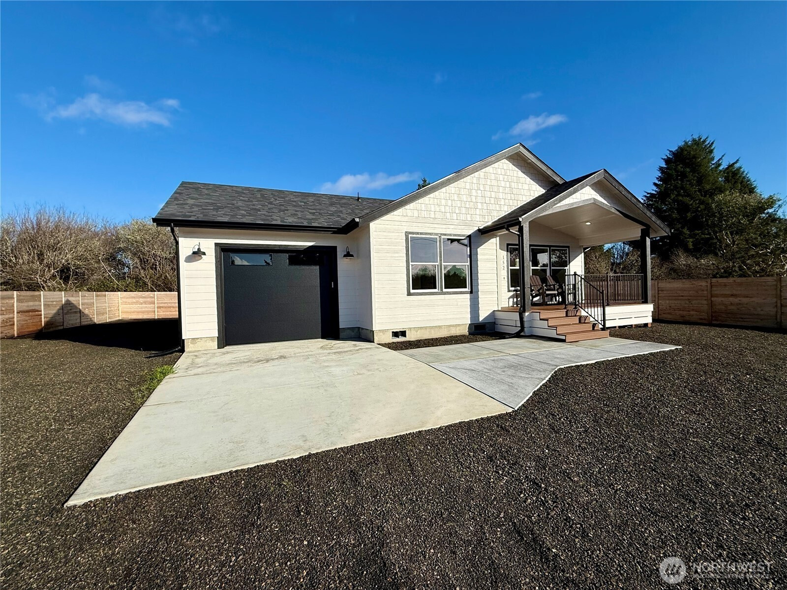 (503) 893-8874New Jewel Box near Taurus Beach Approach at Ocean Shores, Wa! This home exudes impeccable design and finish materials throughout. Enter the 1,162 sf open concept plan with vaulted ceilings, fireplace, and luxury vinyl plank flooring. The kitchen features gorgeous cabs, stainless appliances, Quartz slab countertops, tiled backsplash and island/breakfast bar. Down one hallway is the airy primary en-suite with walk in closet, tiled shower and sliding door to the covered deck. 2nd bedroom and full bathroom are on the opposite side of home. 1-car garage. RV parking. Front and back covered decks w/Trex decking. H&C ext spigot. Part fenced back yard. Large 8,052 sf lot,RV parking & city greenbelt behind property for those that want more privacy.