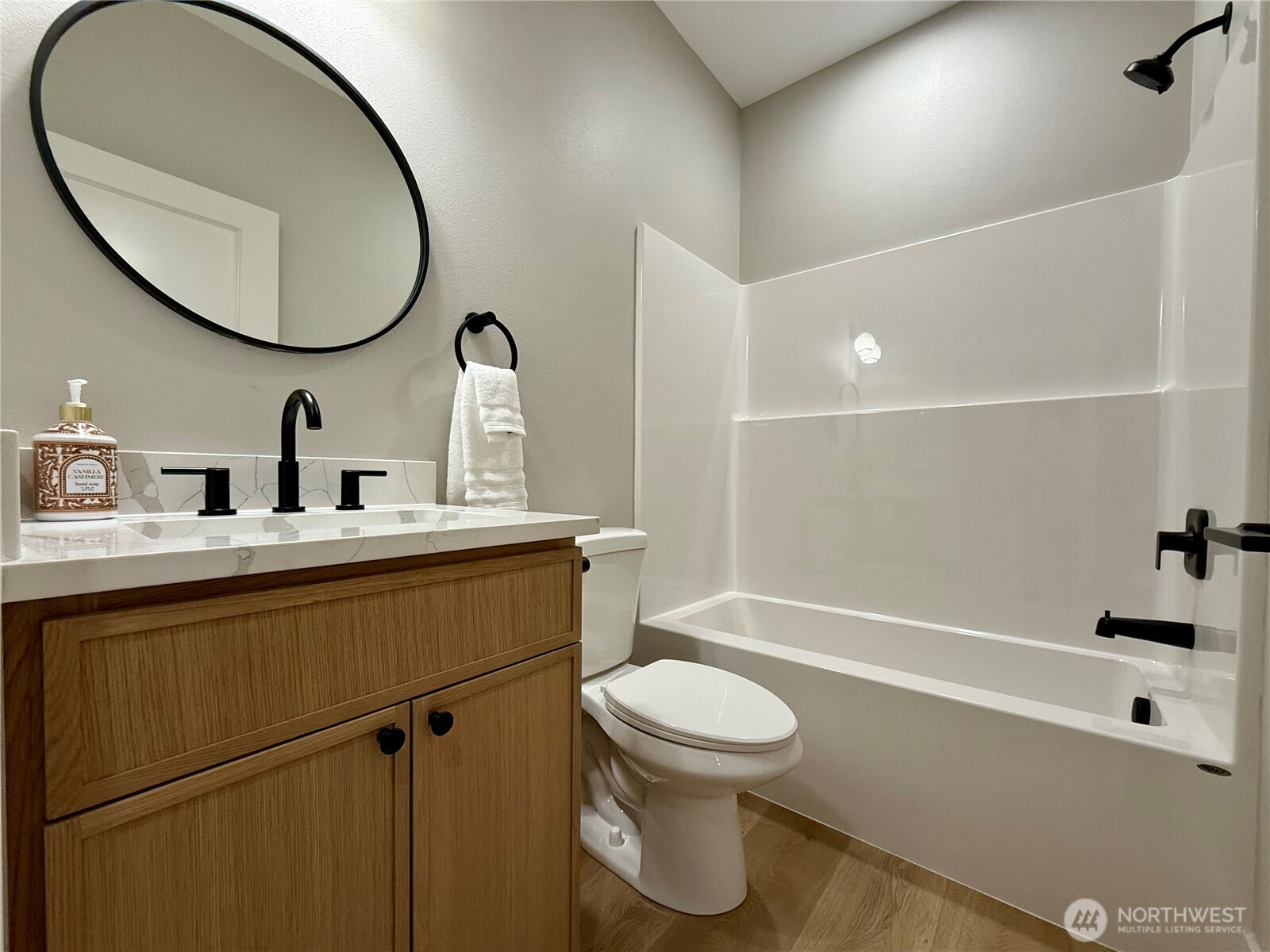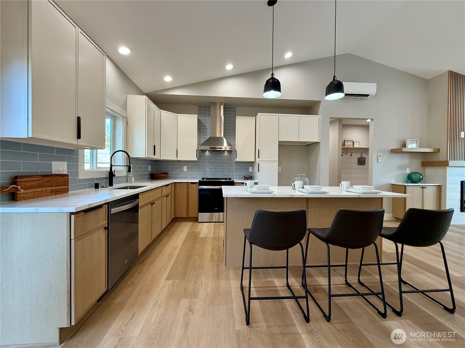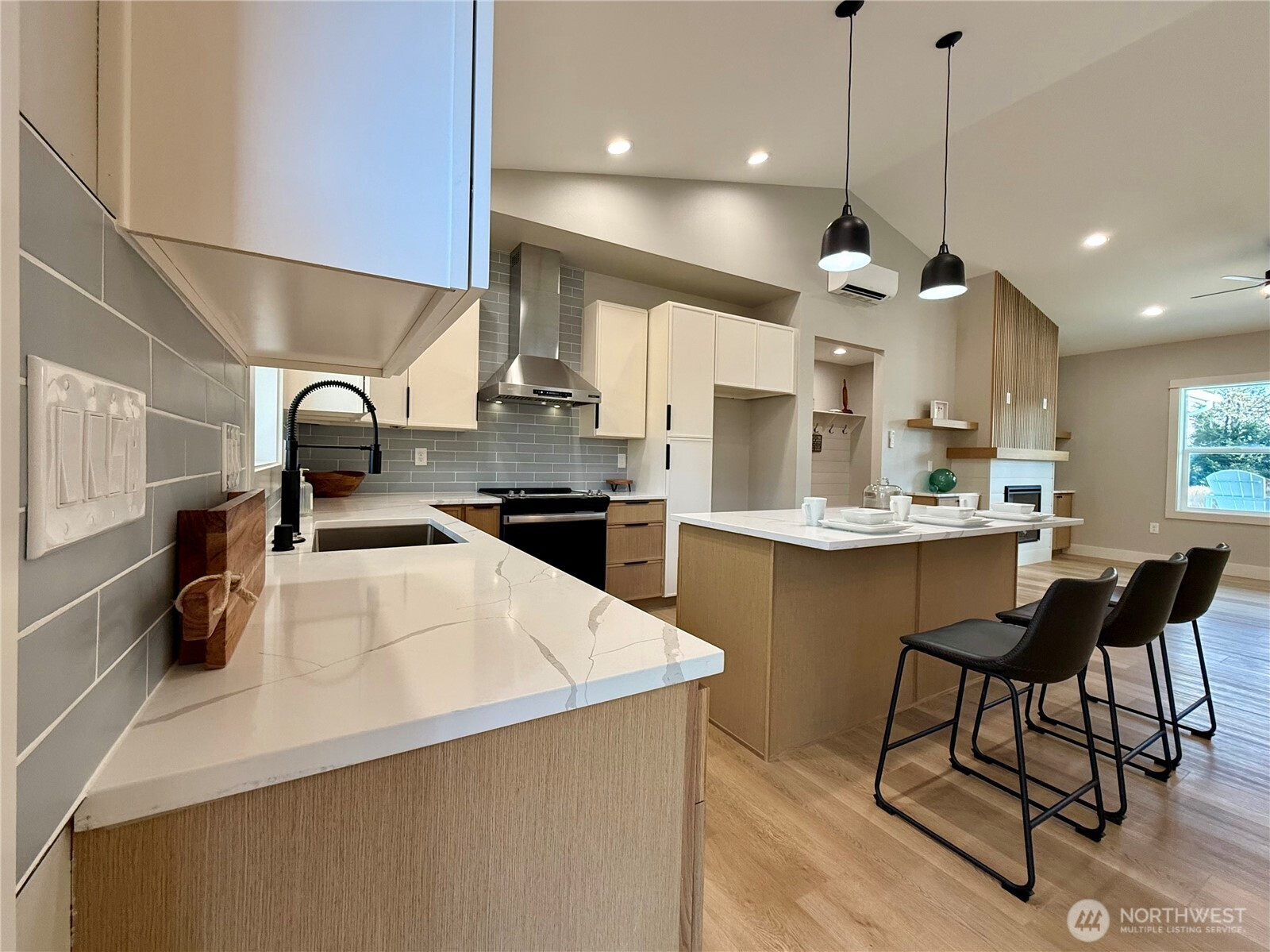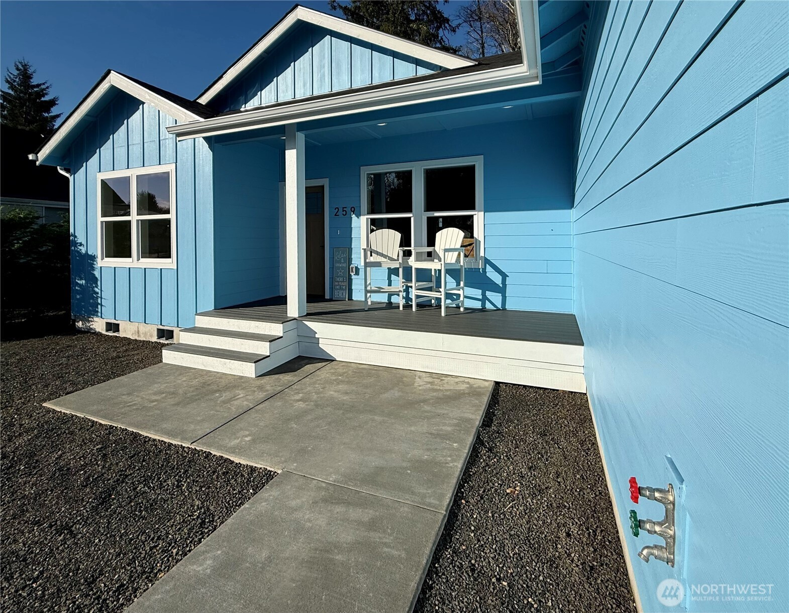New Jewel Box Home across the street from Grays Harbor Bay at Ocean Shores, Washington! Situated near a lakefront park, small-craft airport, 18-hole golf course, and a bit further to more parks, town center, and miles of beach to explore. This residence exudes impeccable design and upscale finish materials throughout. 1,500 sf open plan by DLC Homes featuring 3 bedrooms, 2 bathrooms, and a 2-car garage. Enter into the great room with vaulted ceilings, fireplace wall flanked by floating shelves, and luxury vinyl plank flooring. The kitchen features gorgeous cabs, stainless appliances, Quartz slab countertops, tiled backsplash and island/breakfast bar with seating for three. Dining room with sliding door leading to the back deck and yard. Private primary ensuite with 4-piece bath including dual sinks, custom soaking tub, walk in shower and separate water closet. Two additional bedrooms and a full bathroom are located on opposite side of the home from primary. Mudroom w/built-in coat rack/bench. 2-car finished garage with remote. Front and back covered decks complete with easy-care Trex decking. Hot/cold exterior spigot~perfect after a day at the beach. Generator plug in. Full size 7875 sf parcel. Partially Fenced back yard. 3 hours from both Seattle, WA or Portland, OR.