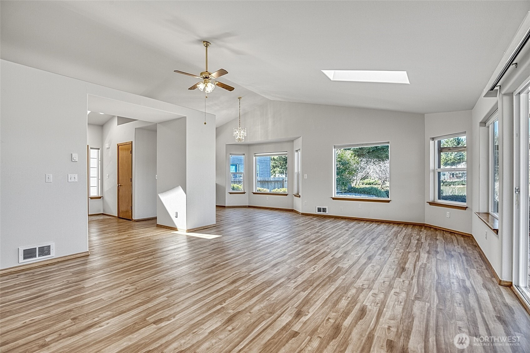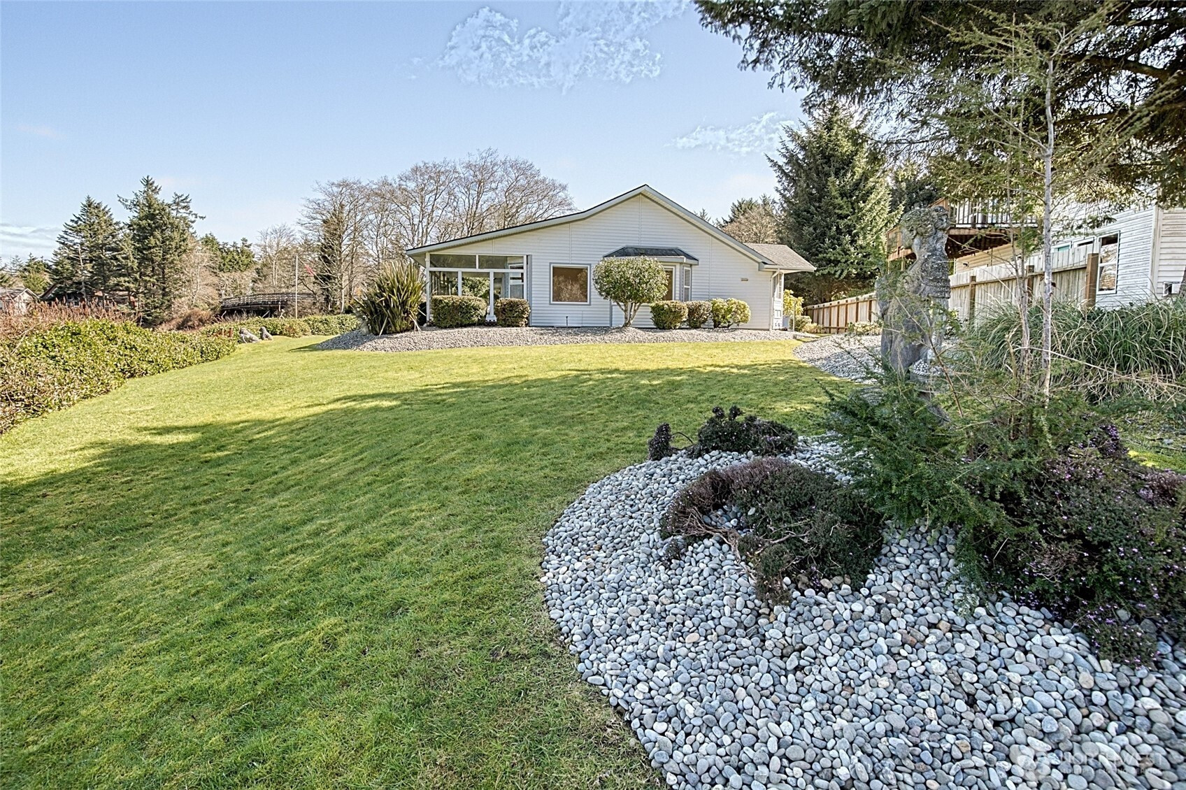 Lakefront living takes center stage in this Ocean Shores property, featuring an impressive 218 feet of prime frontage on Duck Lake with truly unmatched, sweeping water views. Set on a beautifully landscaped, park-like property, this home is designed to fully embrace its waterfront setting - perfect for outdoor living, entertaining & soaking in the natural surroundings. Inside, enjoy over 1,800 SF of light-filled living space with expansive lake views showcased from nearly every room. The main living area features vaulted ceilings, skylights, & durable laminate flooring, while the well-appointed kitchen offers stainless steel appliances, ample storage and a pantry. The spacious primary suite is a relaxing retreat with private access to the covered back deck overlooking the lake, a large walk-in closet & a 5-piece ensuite with double sinks, step-in shower & soaking jetted tub. Two additional guest bedrooms, a full guest bath & a convenient half bath provide comfortable accommodations for guests. Additional highlights include a dedicated laundry room & oversized 2-car garage. Step outside to the expansive covered deck & take in uninterrupted lake views, abundant wildlife & the peaceful setting that makes waterfront living so special. With a large private dock & existing boat ramp, you’ll have direct access to Duck Lake for boating, kayaking & year-round enjoyment.