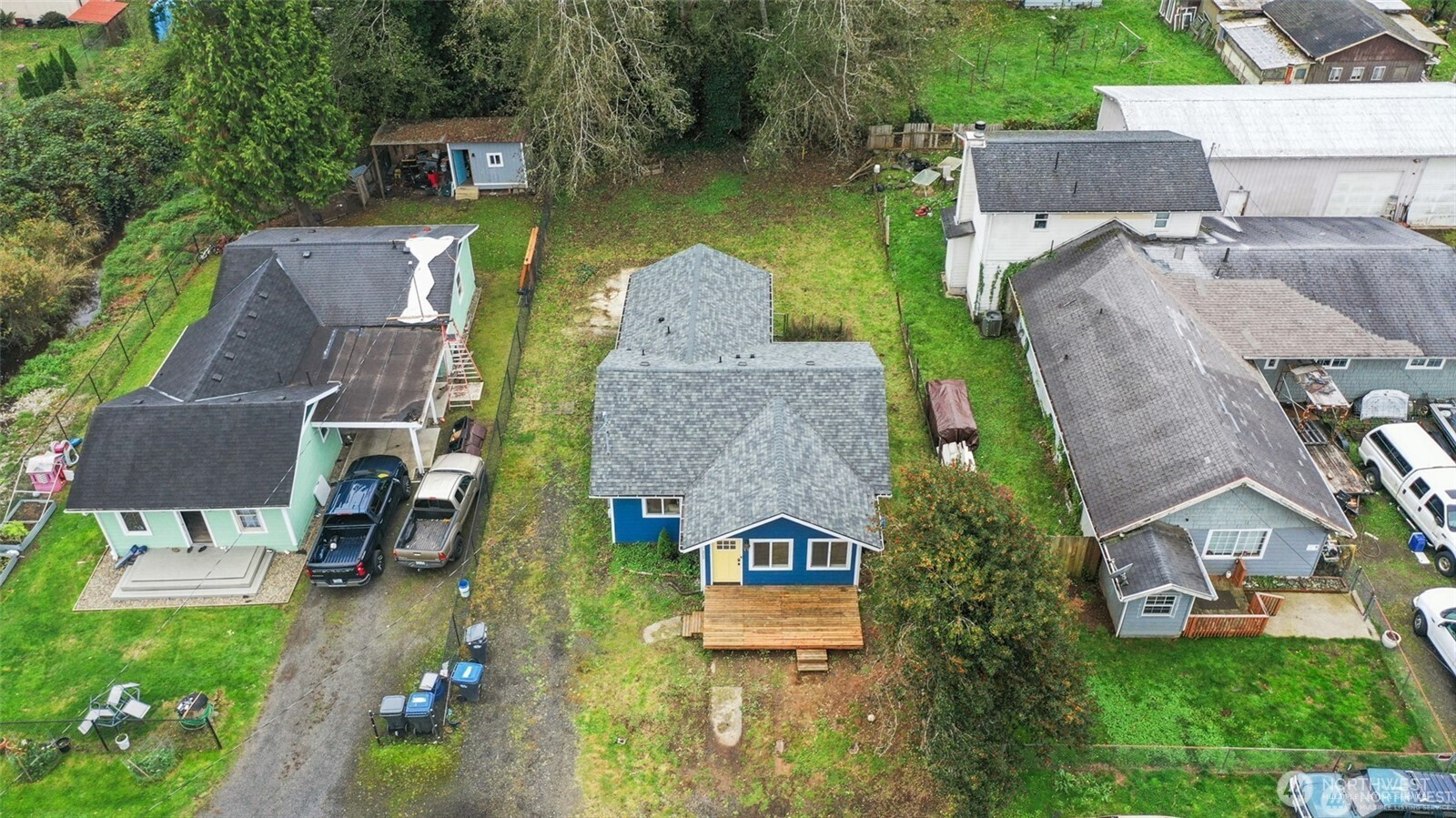 Charming 3 bedroom, 2 bathroom home with recent updates throughout! The roof, gutters, windows, siding doors & flooring have been replaced. Kitchen has been updated. Primary bedroom with ensuite & 2 closets. Spacious living area, front entry is a finished room that may work as an office, dining, hobby area or creative storage. The front deck is perfect for entertaining. Backyard is a blank slate and offers a concrete pad that may work for a future garage or covered patio area. The extra long driveway has room for vehicles and an RV. Great location outside of flood zone.