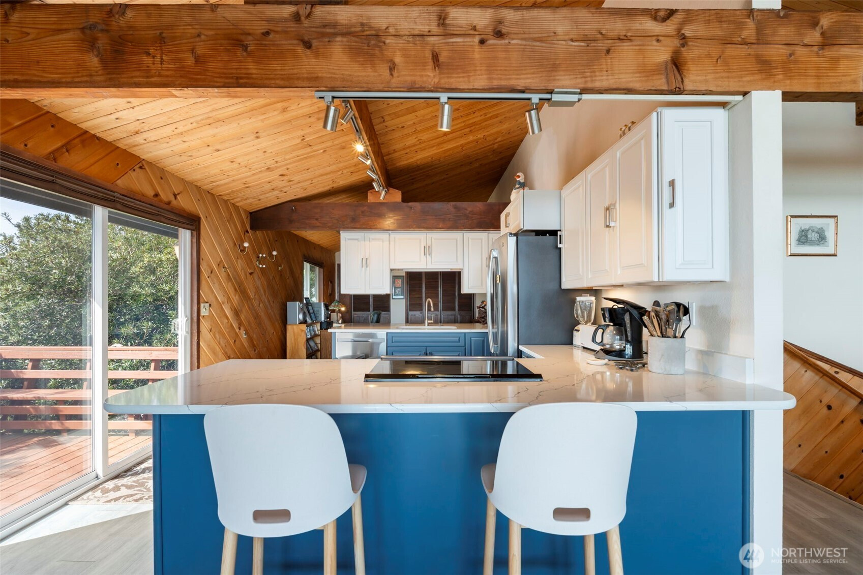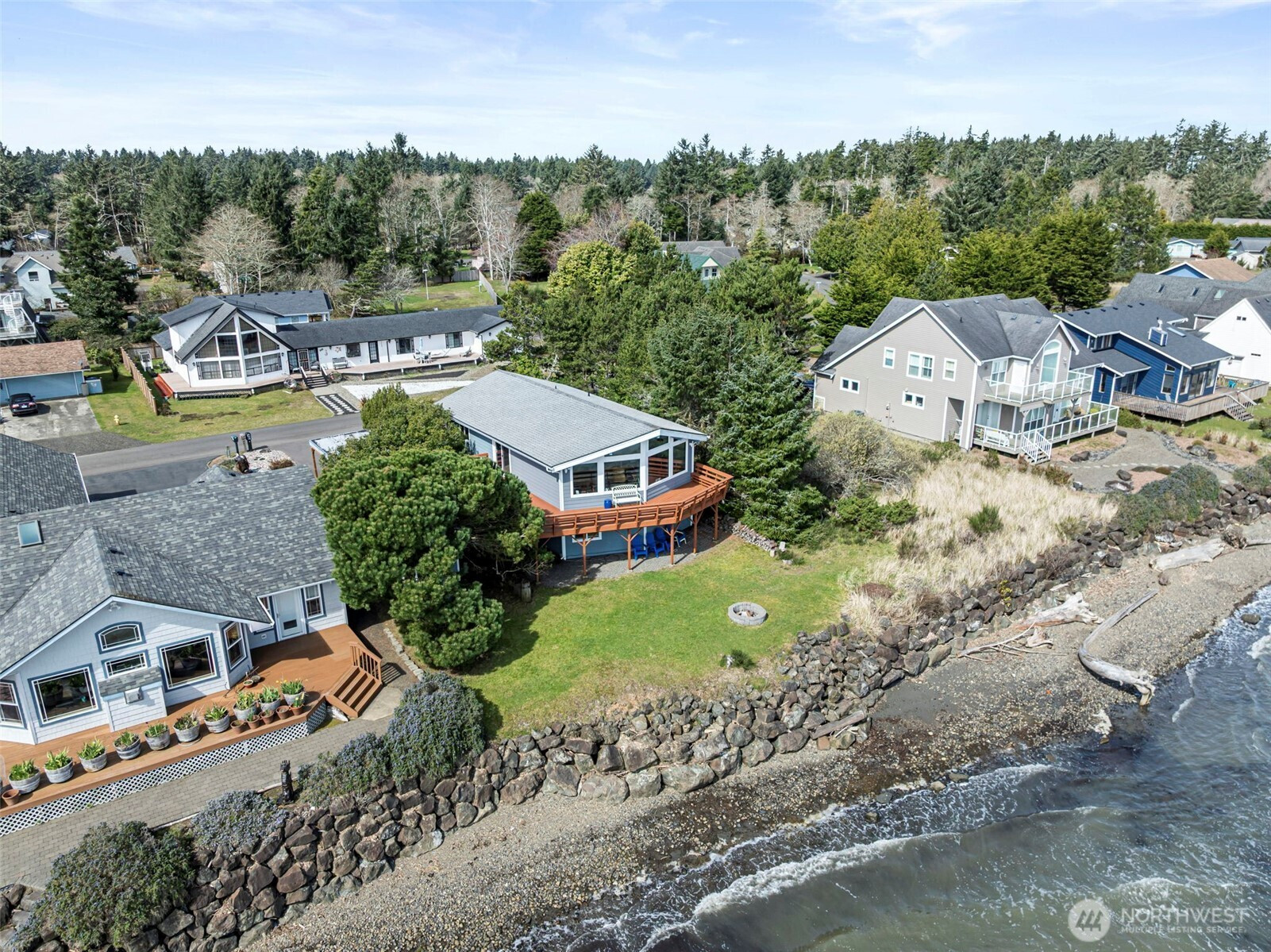 Second owners ever, available now for the first time in over 33 years! Come check out this four bedroom dream destination home! Reverse floor plan gives stunning, 180 degree views. Upper level kitchen has stainless steel appliances, stone countertops and bar seating which open to the vaulted ceiling living room with oversize windows that face the North Bay. The primary bedroom plus full bathroom (with heated floors!) round out the upper floor living space. The lower level includes a bonus room plus wetbar, three additional bedrooms, a bathroom with walk-in shower plus a generous size utility room complete with stacked washer and dryer. Relax and enjoy the vacation lifestyle on your upper level wraparound deck and relax around the firepit. Between the carport and driveway, there's plenty of parking for friends. Enjoy the amenities the Ocean Shores Community Club offers (best value on the west coast?!) including indoor and outdoor pools, indoor and outdoor basketball courts, fitness room, parks and much more. Make this your home today!