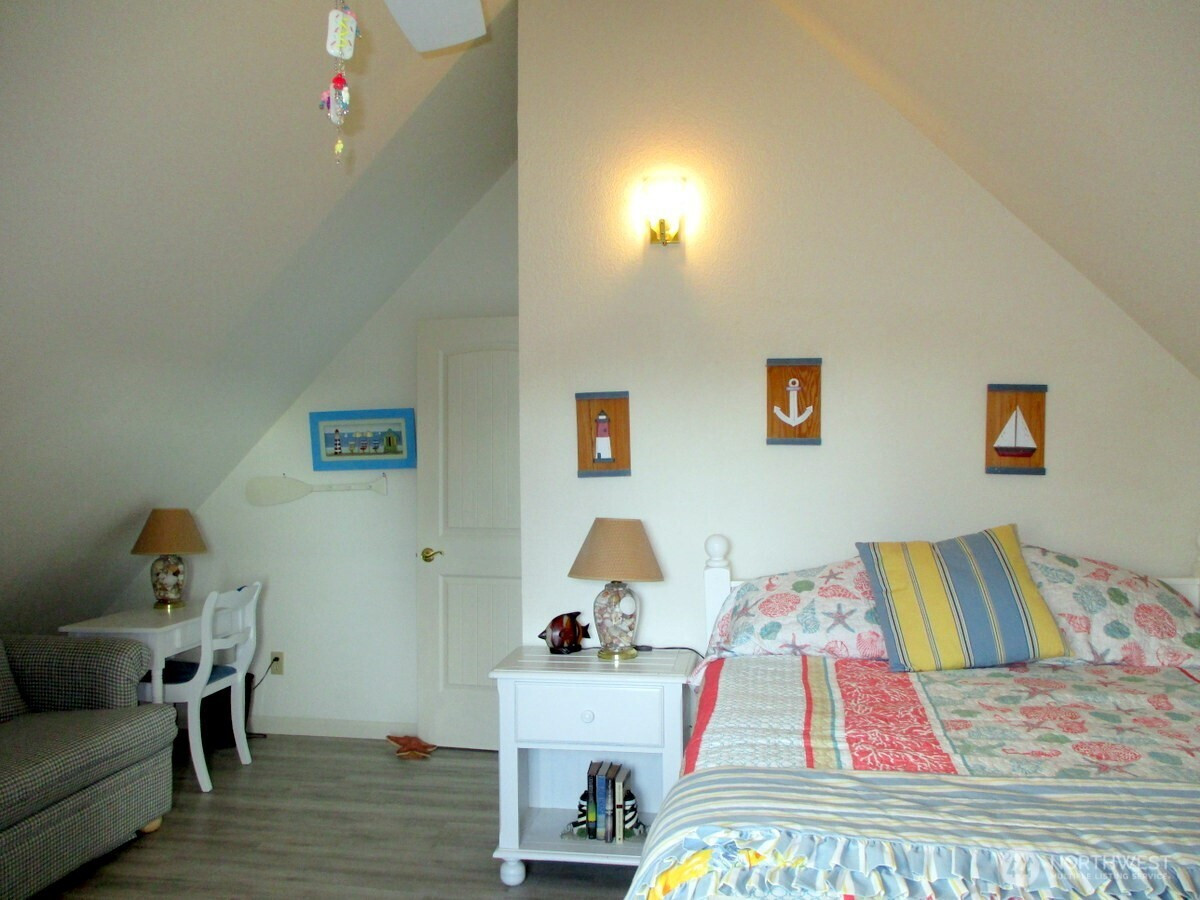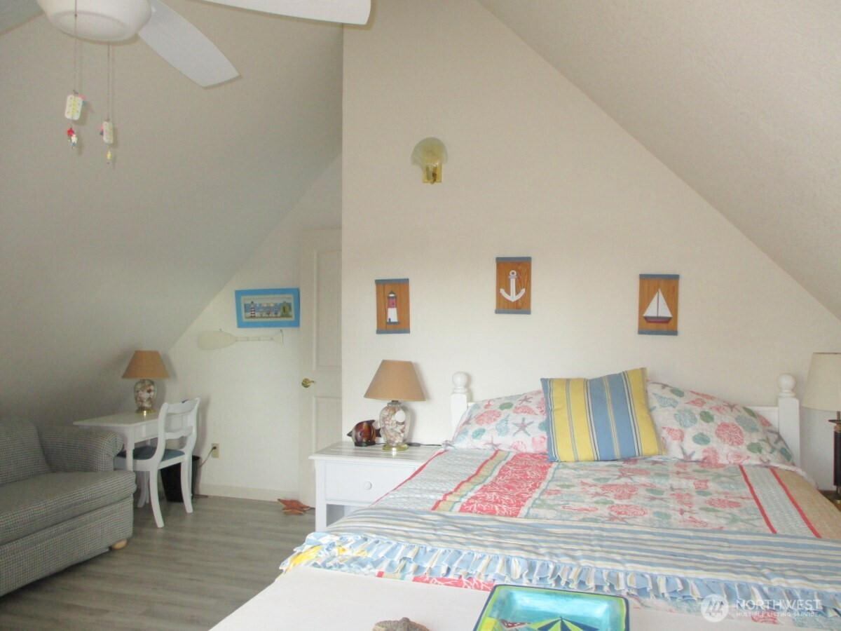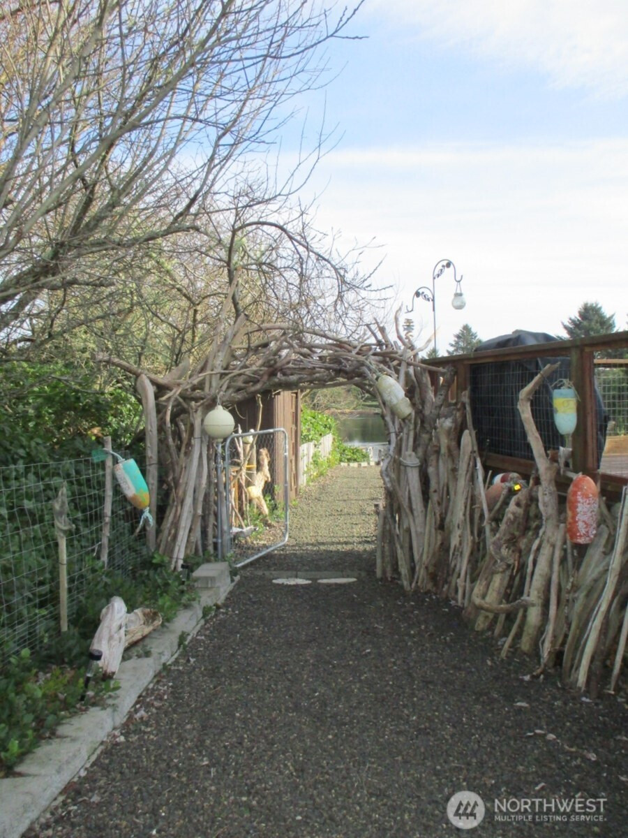 Waterfront Chalet on the Bell Canals. A most beautiful view facing SE. Close to the beach & private location. Enjoy quiet time by the campfire, easy walks to the beach while co-existing with Ocean Shores wildlife. 2bd/1.5ba 1,048sqft. Open concept living, Natural light thru the high chalet windows. Bright kitchen with ample cupboard space. The cutest bedroom & bath upstairs in the loft with desk space & a love seat hide-a-bed. Beachy, EZ care landscape & private well sprinkler system. Newer dock, large deck, 1-car garage with designated shop/studio space. Off street parking & room for RV with water/power access. Turn-Key, completely furnished. Kayaks & kites stay.