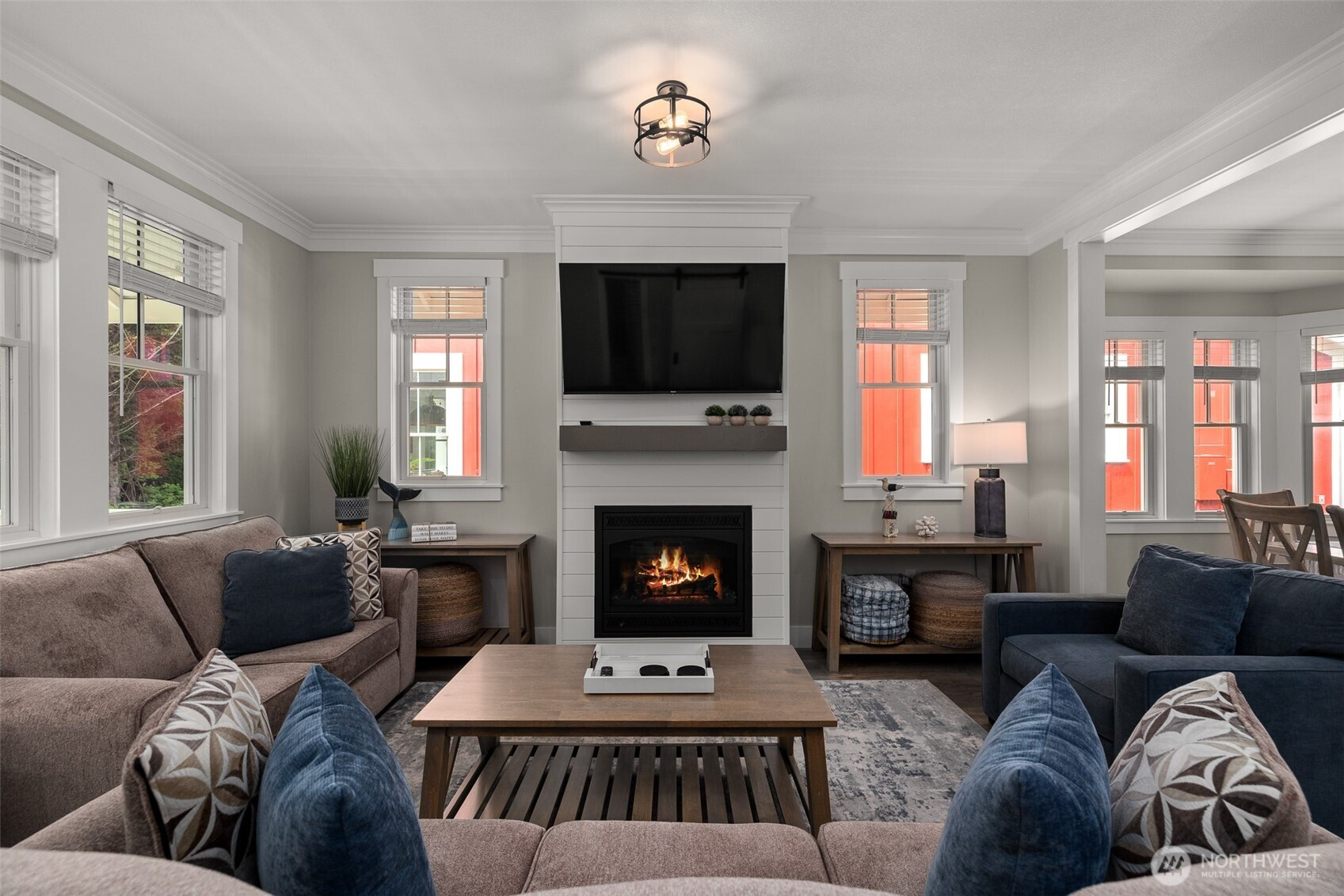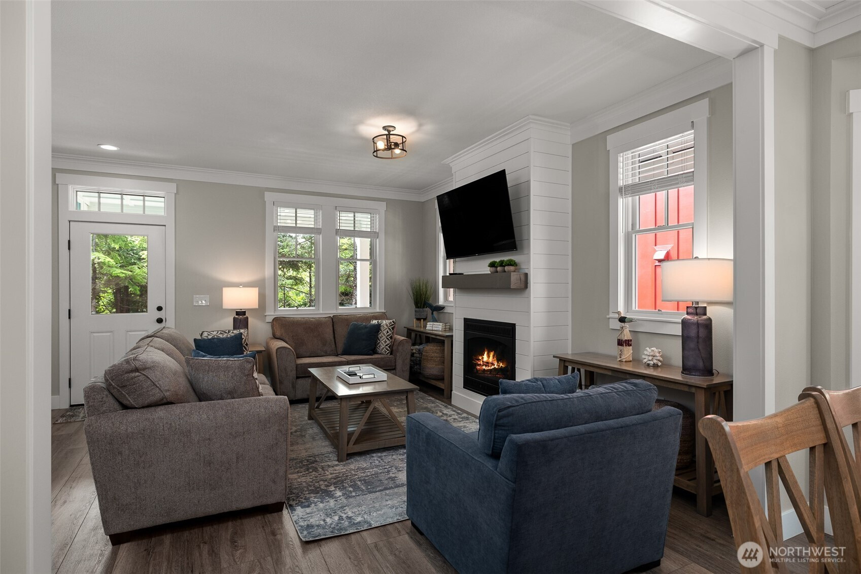 This light-filled, open-concept home is designed for seamless living. The common area features a cozy living room with a gas fireplace and classic shiplap accents, providing warmth and ambiance. Quality finishes throughout include elegant crown molding. The kitchen has pearl quartz countertops, stainless steel appliances, full subway tile backsplash, ample cabinetry, and a large central island for prep and serving. The layout includes three bedrooms. The spacious primary suite features an en suite bathroom with high-end fixtures. A sliding barn door adds privacy between the main living area and the guest suite, which includes two bright bedroooms and a beautifully finished shared full bathroom. A dedicated mudroom offers a durable floor and built-in storage, strategically located for easy entry and shedding outdoor gear after exploring nearby trails. The location is unparalleled, directly across from the community pool and fitness center. The extensive Seabrook trail system is easily accessible from the back of the property for biking, running, or walking. Outdoor living is a pleasure with a charming, covered front porch and a private, fully fenced yard. The yard includes a luxurious hot tub for unwinding and a storage shed. Ample on-site parking is also provided. Experience the best of coastal living in this perfectly positioned Seabrook home.