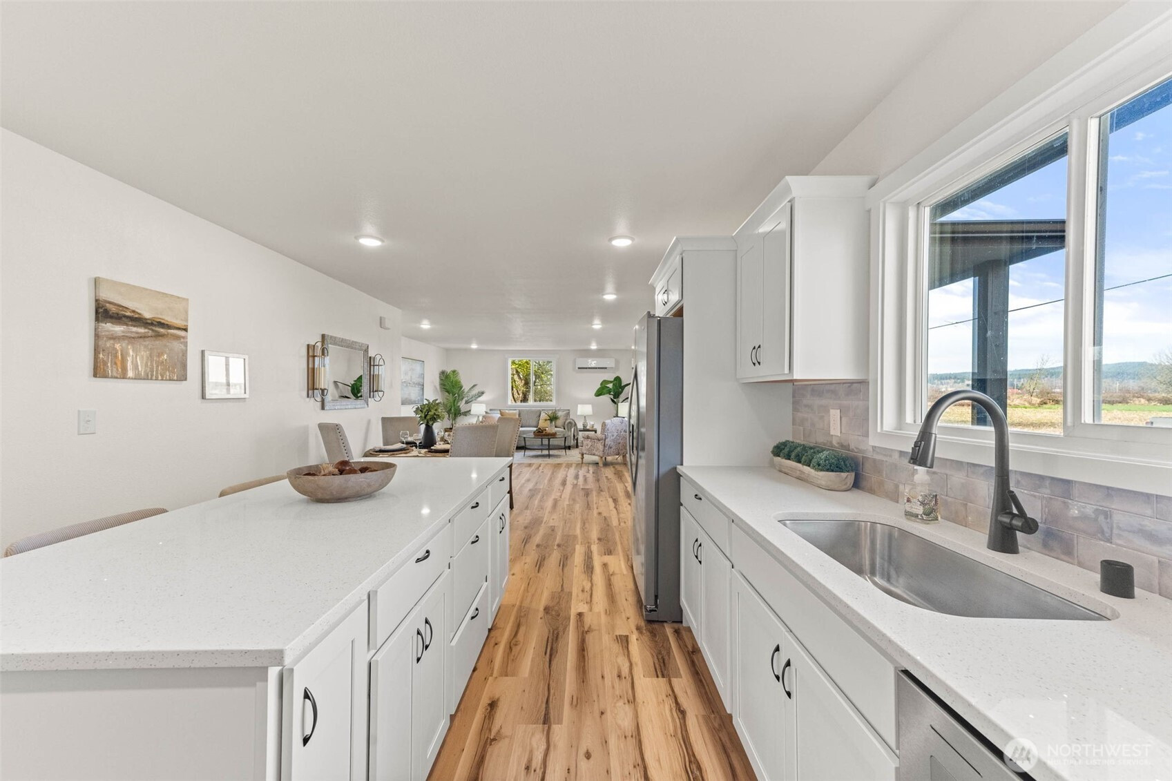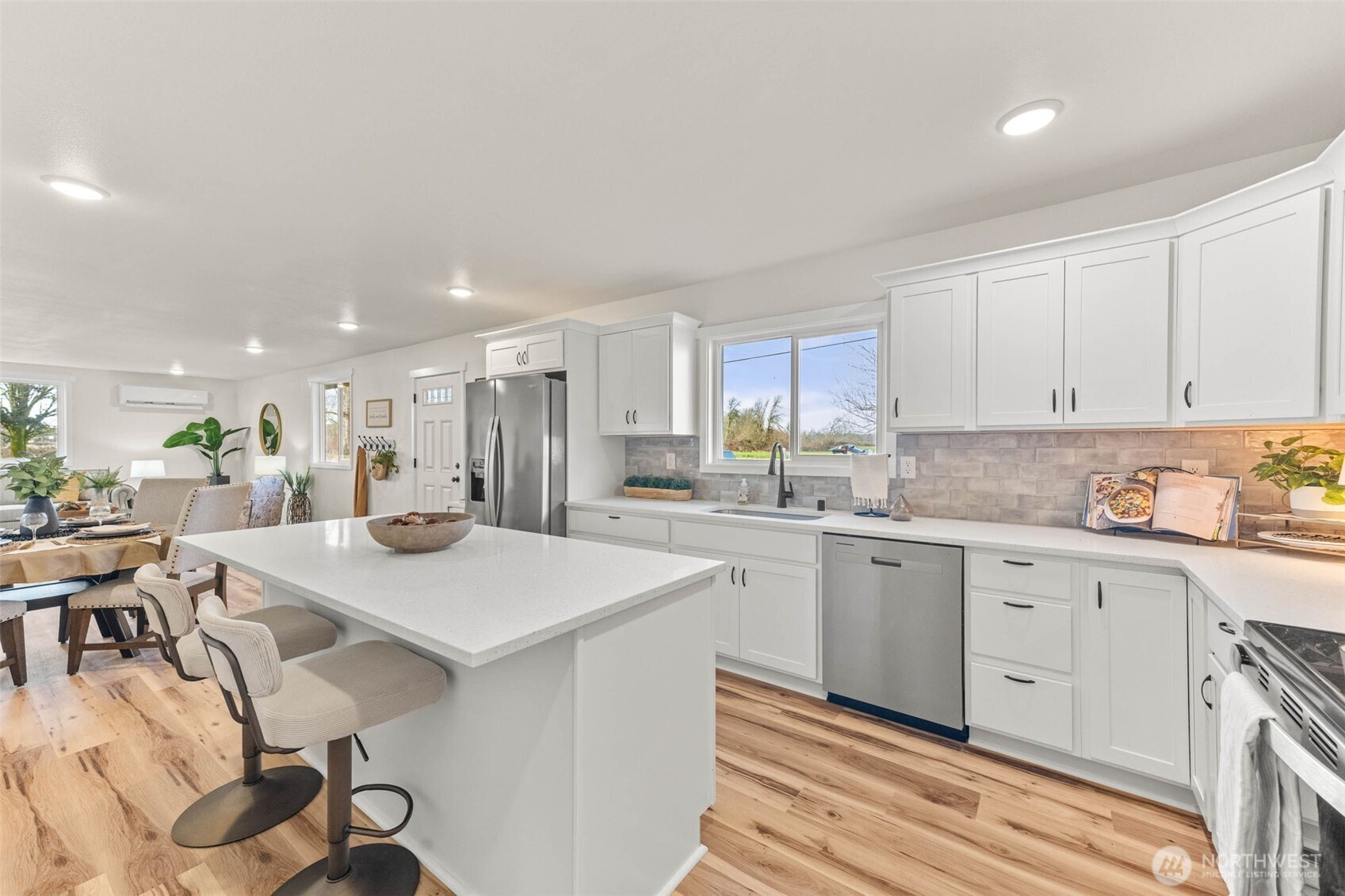 Better than new! And affordable too! Complete, down to the studs renovation on this shy 1500 sqft rambler. They say the kitchen is the heart of the home and you'll LOVE this kitchen complete with quartz counter tops, large island, pantry and SS appliances. Luxury vinyl plank flooring throughout. Ductless mini split for efficient heat and a/c. A spacious primary with a full bath. A thoughtful open floorplan and an oversized garage where you could fit 4 cars or 2 with a large workshop area. This better than new rambler is situated on almost a 1/2 acre on a dead end street and surrounded by farmland.