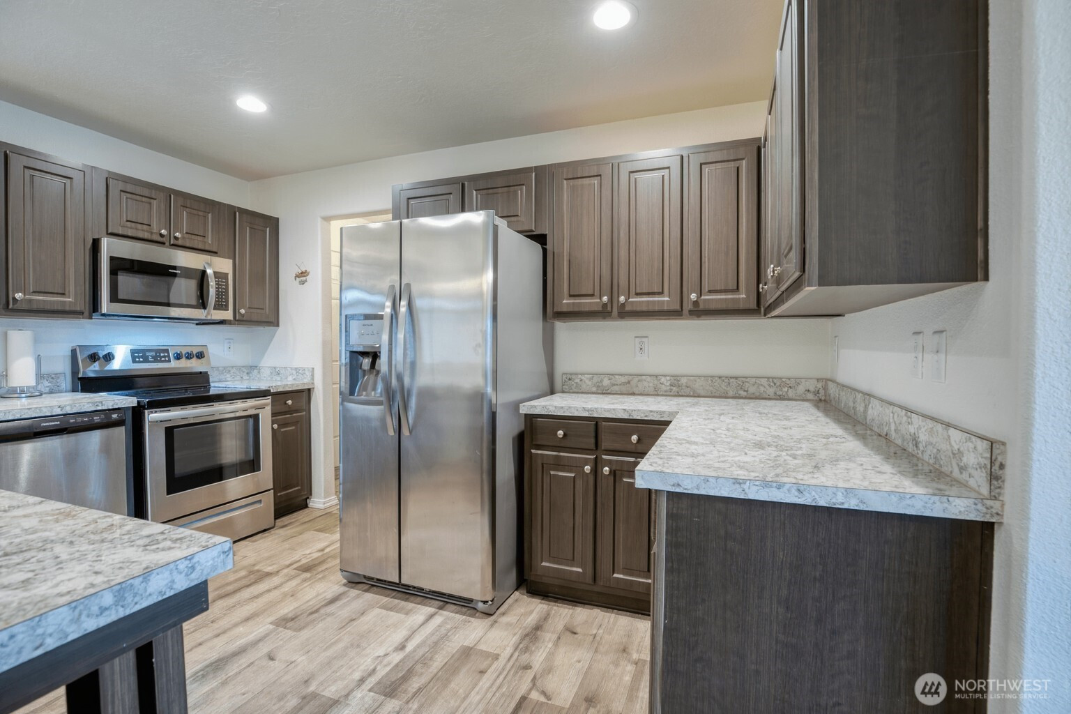 Waterfront! Situated in a quiet neighborhood on Duck Lake w/ 73' of waterfrontage, this home is clean & move-in ready! Home features 1296 SF of light & bright living space - comfortable floorplan w/ views from the main living area & kitchen w/ pantry, SS appliance package & large island + dining space. Primary Bedroom w/ lake views, step-in shower & walk-in closet is thoughtfully located on one end of the home + 2 guest bedrooms & guest bathroom on the opposite end. Designated laundry room. Extras: detached 480 SF shop, 2 full RV hookups - one 30 amp & one 50 amp. Privacy fencing on the street side of this home give an abundance of security & privacy. Enjoy lake-living at the Beach & all of the wildlife that frequent our fresh waterways.