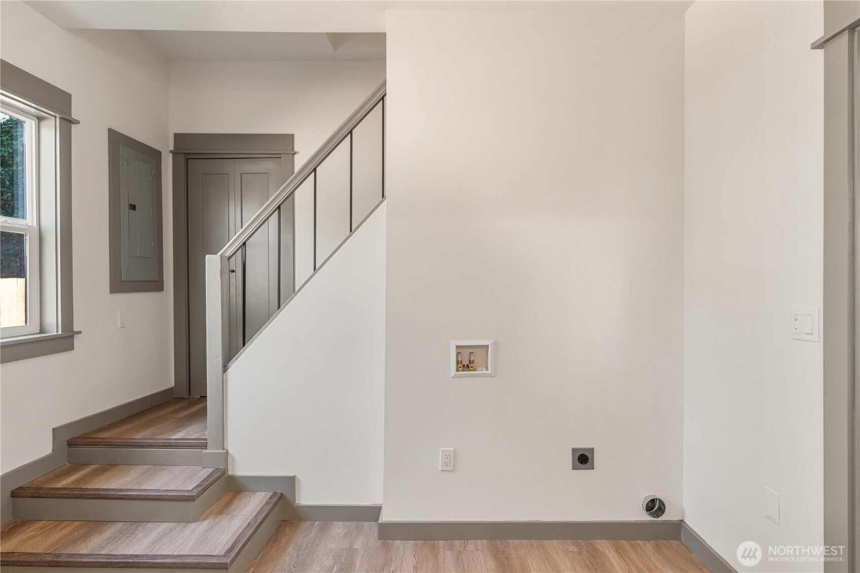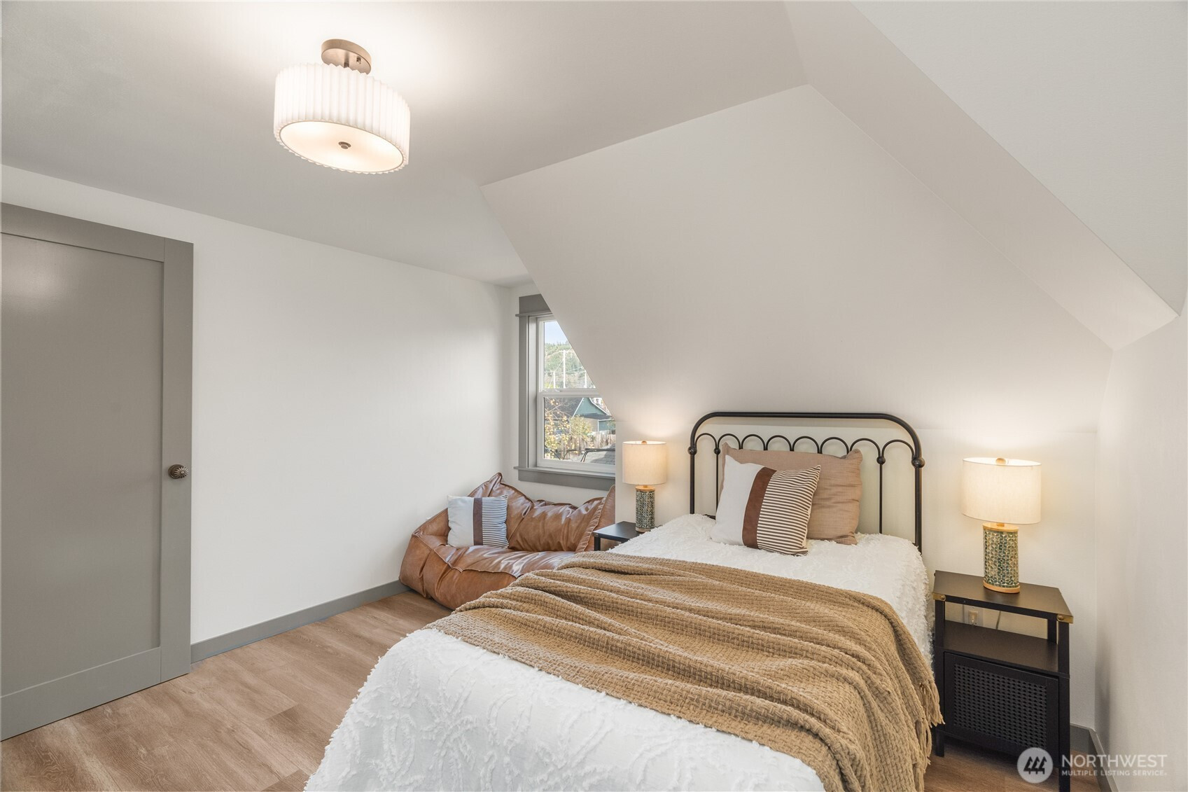 Renewed from roof to foundation, 915 Eklund honors its original character while feeling fresh and modern. Ten foot ceilings and an open floor plan create a warm, welcoming flow made for gathering. The two tone galley kitchen features a farmhouse sink, custom stained hood, brass hardware, Soapstone Mist Thinscape counters, and a cozy arched breakfast nook perfect for slower mornings. Low maintenance Saddle Oak LVP runs throughout the main level with Charcoal Marble LVP tile in the baths. One large bedroom and full bath sit downstairs, with 3 additional bedrooms upstairs including the primary with beautifully tiled 3/4 en suite. Outside, a rich olive exterior pairs with a newlyfenced yard, fresh growing lawn, and private alley parking.