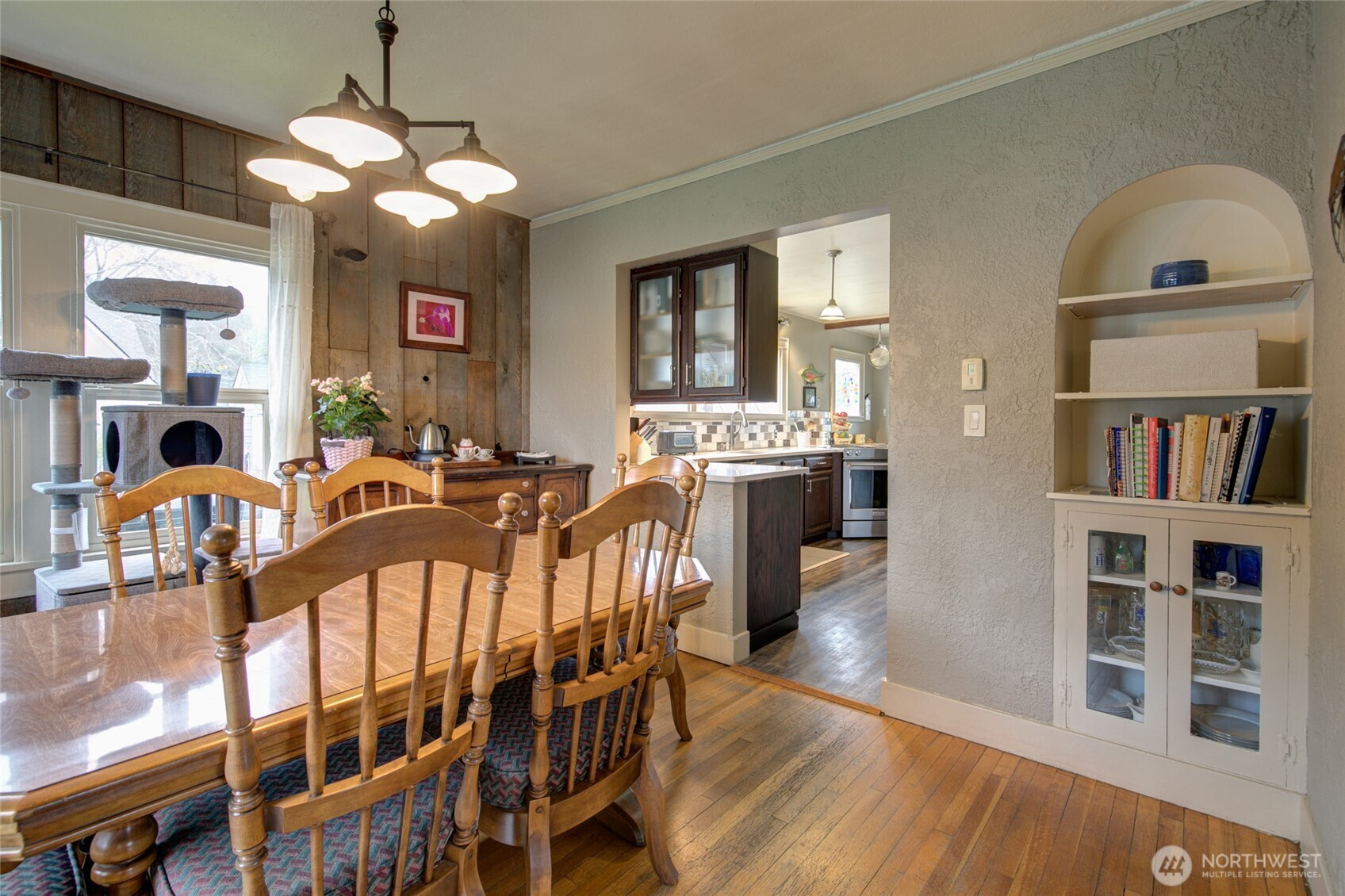 Warm and inviting, this home blends classic charm with thoughtful updates. Wood floors welcome you through the entry, living room, and dining room, anchored by a cozy wood stove. The kitchen features LVP flooring, quartz countertops, stainless appliances, a downdraft oven, dishwasher, fridge, a small eat-in bar, and a pantry. A main-floor bedroom with laminate flooring and a full bath with LVP complete the main level. Upstairs offers a spacious primary bedroom with a walk-in closet, pass-through storage, and attic access, plus a ¾ bath with a tile shower. A third bedroom with carpet and a pass-through closet adds flexibility. Radiator heat is powered by an oil boiler in the basement, which also includes storage, a utility room, wall heater, and workshop space. Outdoor living shines with a slider from the kitchen to the back deck, a peaceful fish pond, paver patio, fenced backyard, greenhouse, shed, tin storage structure, and attached carport. Two apple trees and a new hot water heater add to the appeal.